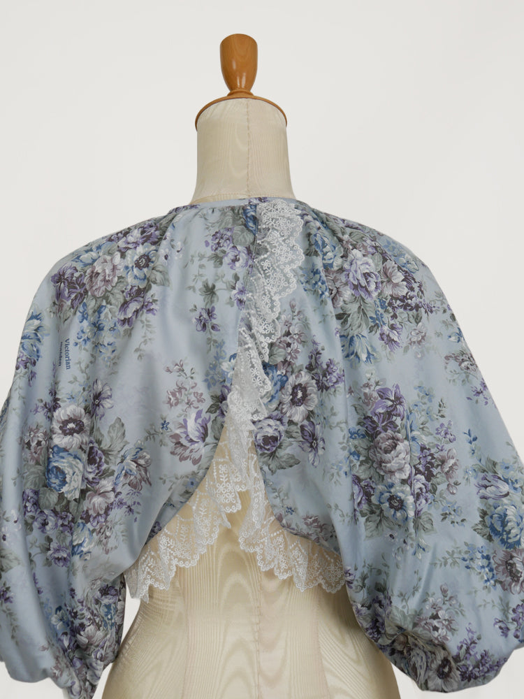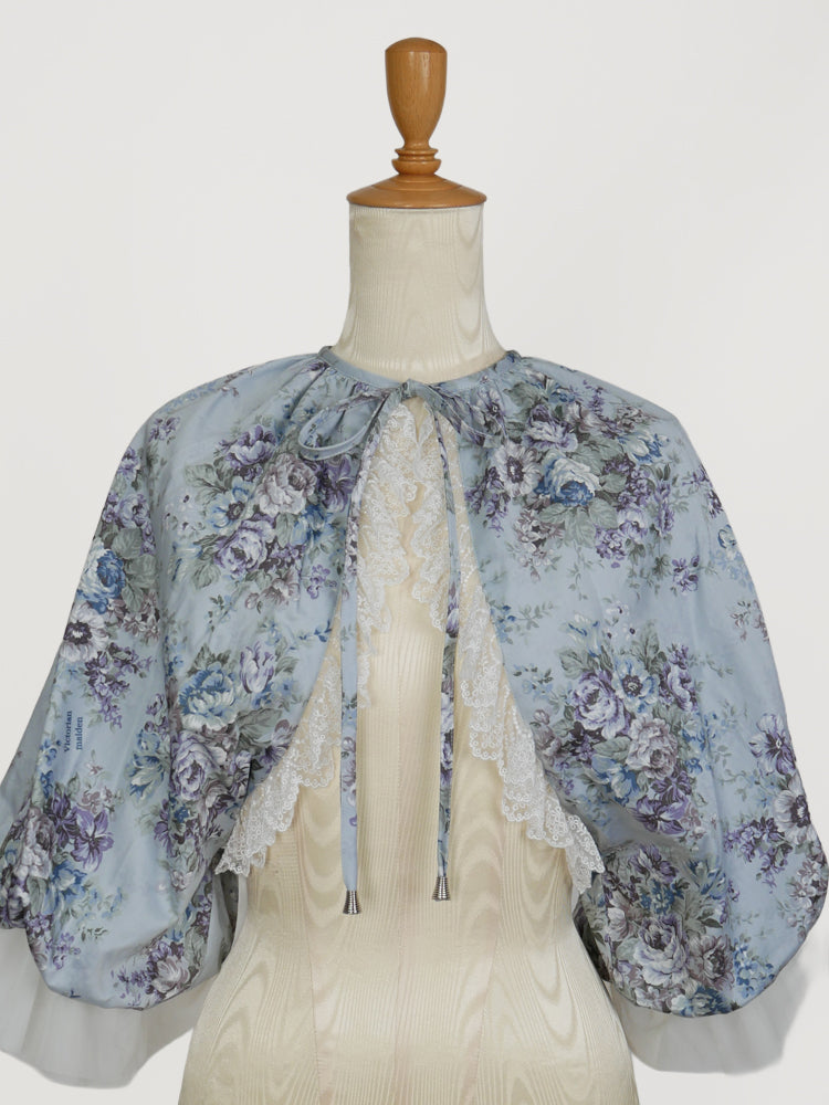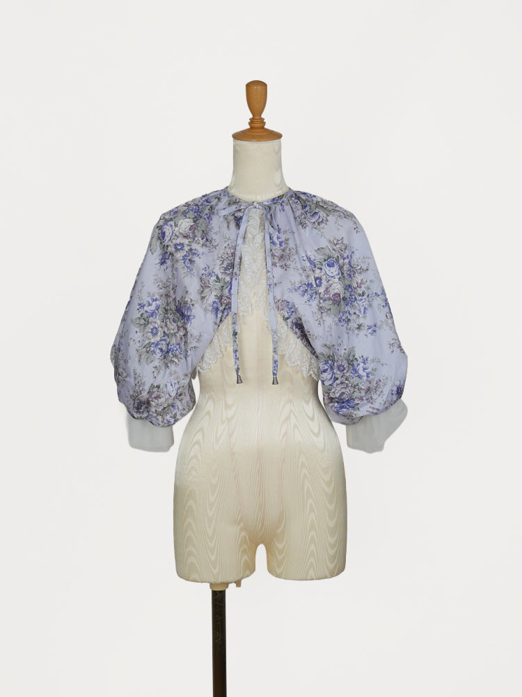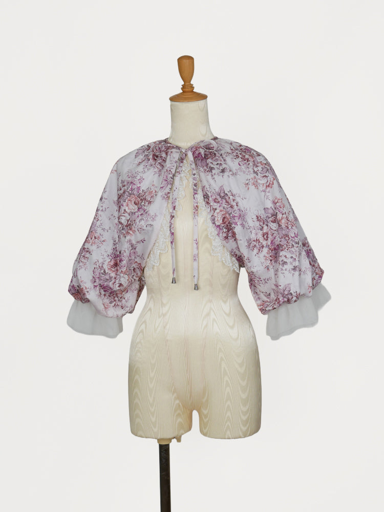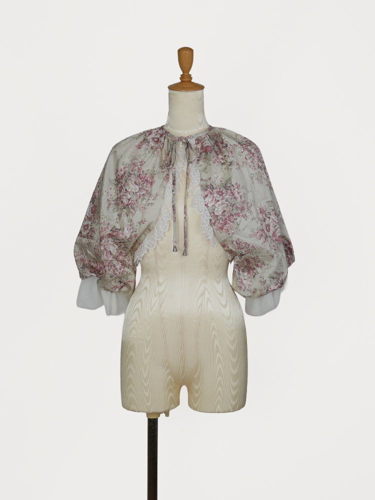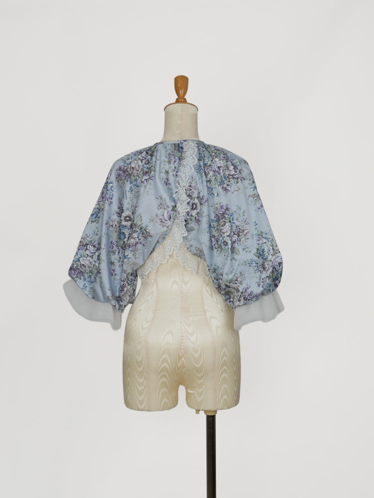 裾周りに贅沢にあしらった繊細なチュールレースと、前後に大きく開いた女性らしい丸みのあるフォルムが印象的なボレロ。