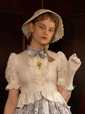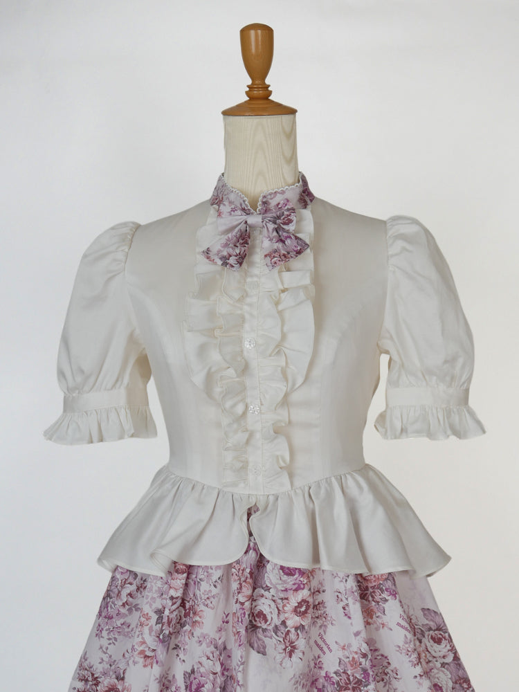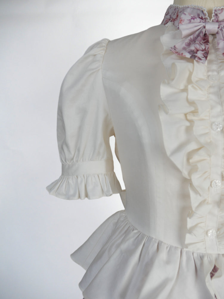 首元にはさりげないリボンを添え、フロントに施された立体的なフリルがクラシカルで気品ある印象を演出します。