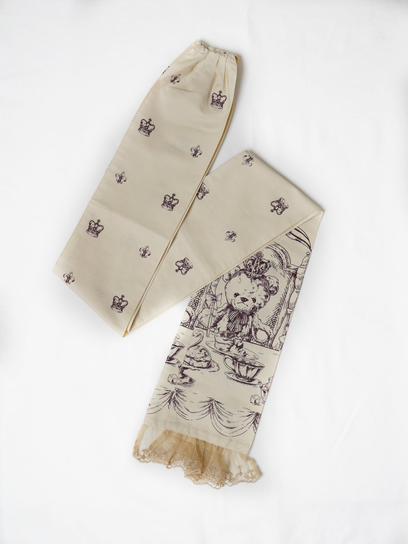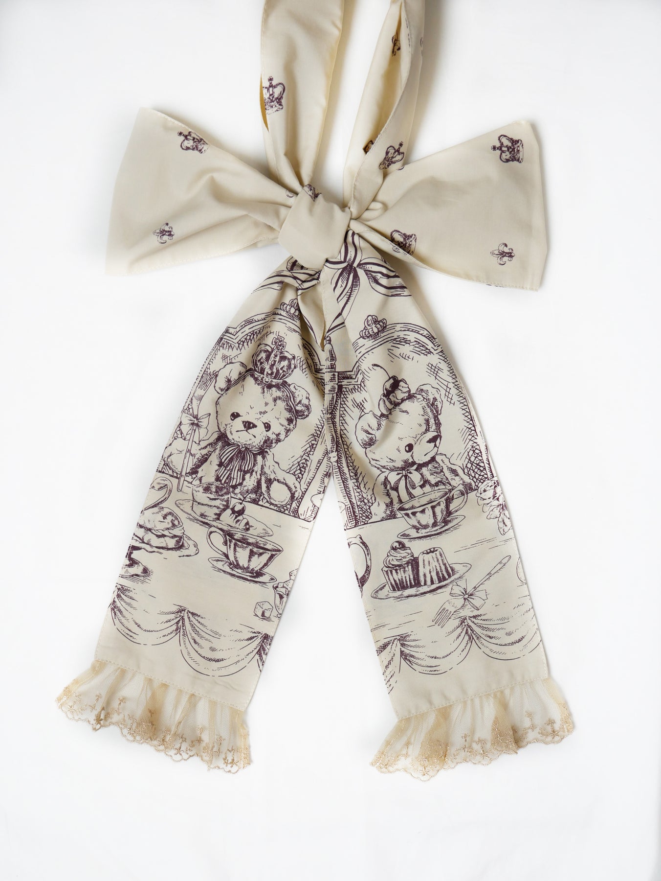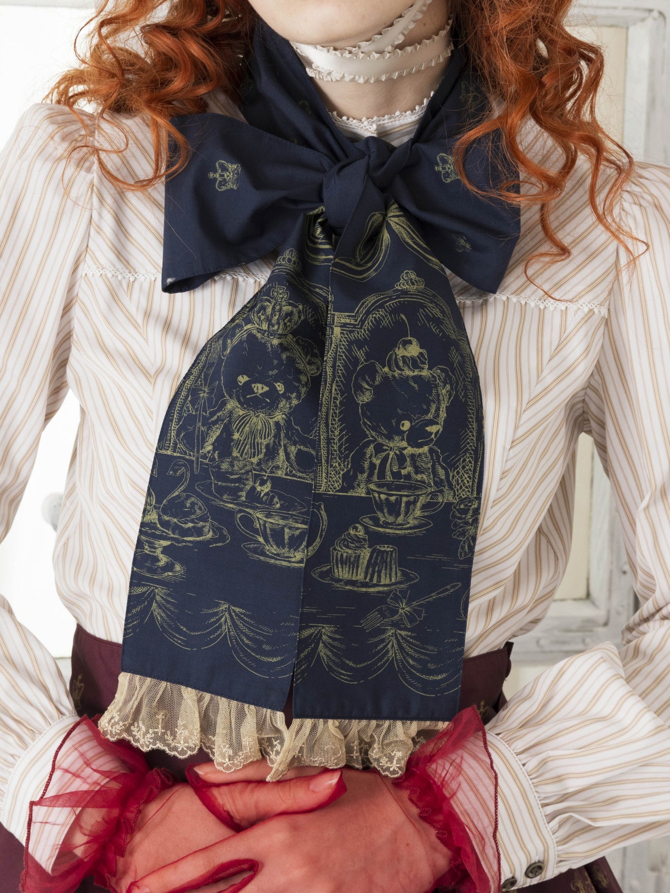 襟元にボウタイとして結んで愛らしいアクセントにするのはもちろん、キャノチェの上から巻いて王冠や百合紋章のモチーフを際立たせれば、ヒストリカルで格調高いムードに。シンプルな形ながら、さまざまなアレンジが楽しめる万能なアイテムです。