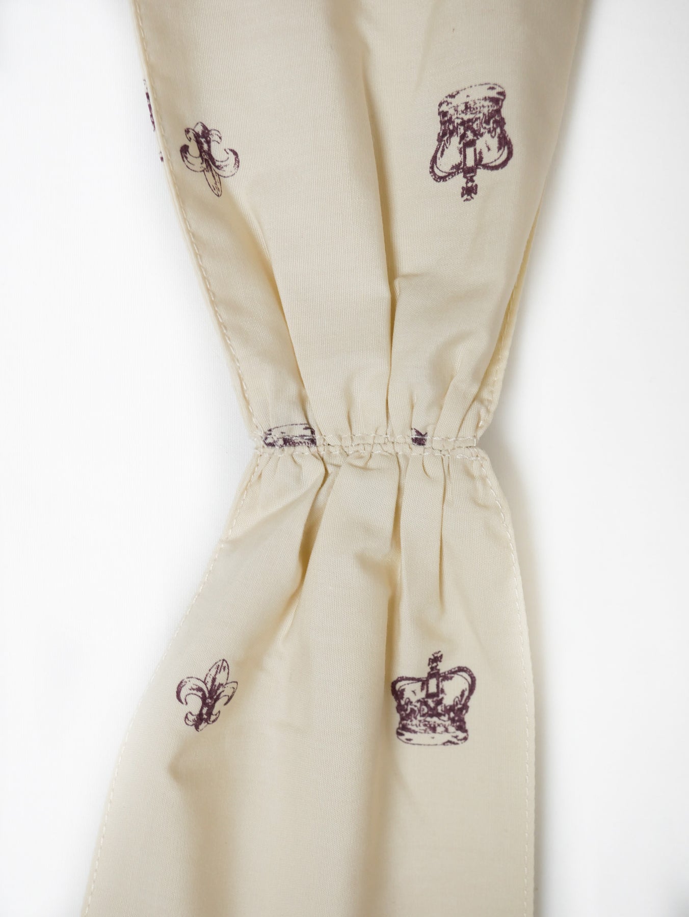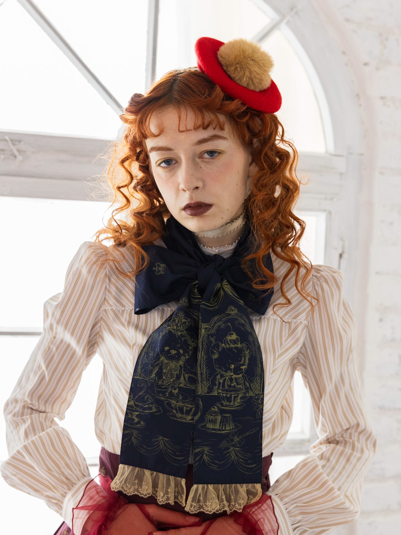ロイヤルベアスカートにプレッピーブラウスを合わせ、付属のジャボに代わってこのロイヤルベアボウタイを添えれば、どこかヒストリカルな英国ムードが漂い、いつもの装いにクラシカルな可愛らしさを添えてくれます。