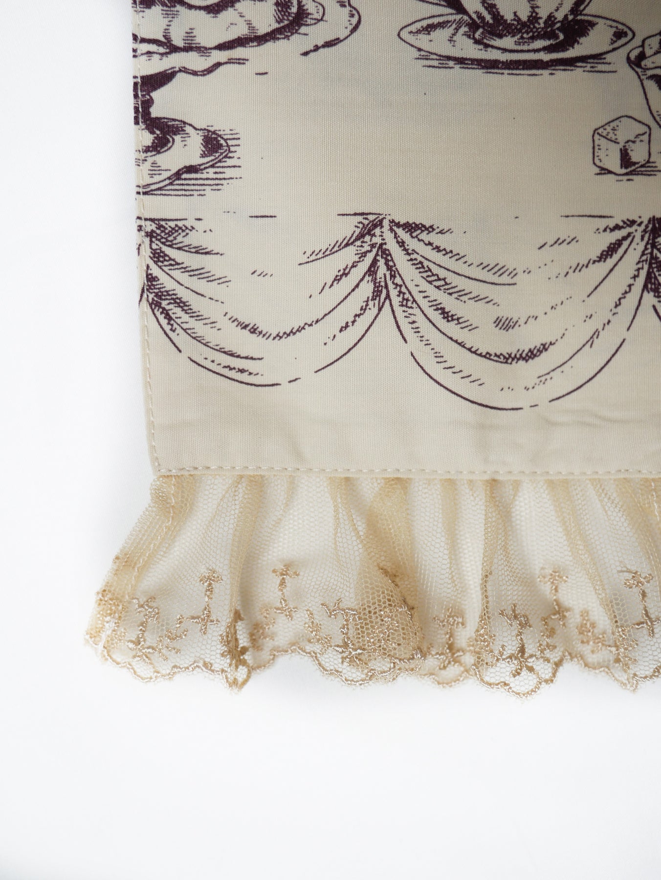先端には、ティータイムの優雅なひとときを思わせる深いアンティークゴールドのオリジナルチュールレースをあしらい、クラシカルな気品を一層引き立てます。