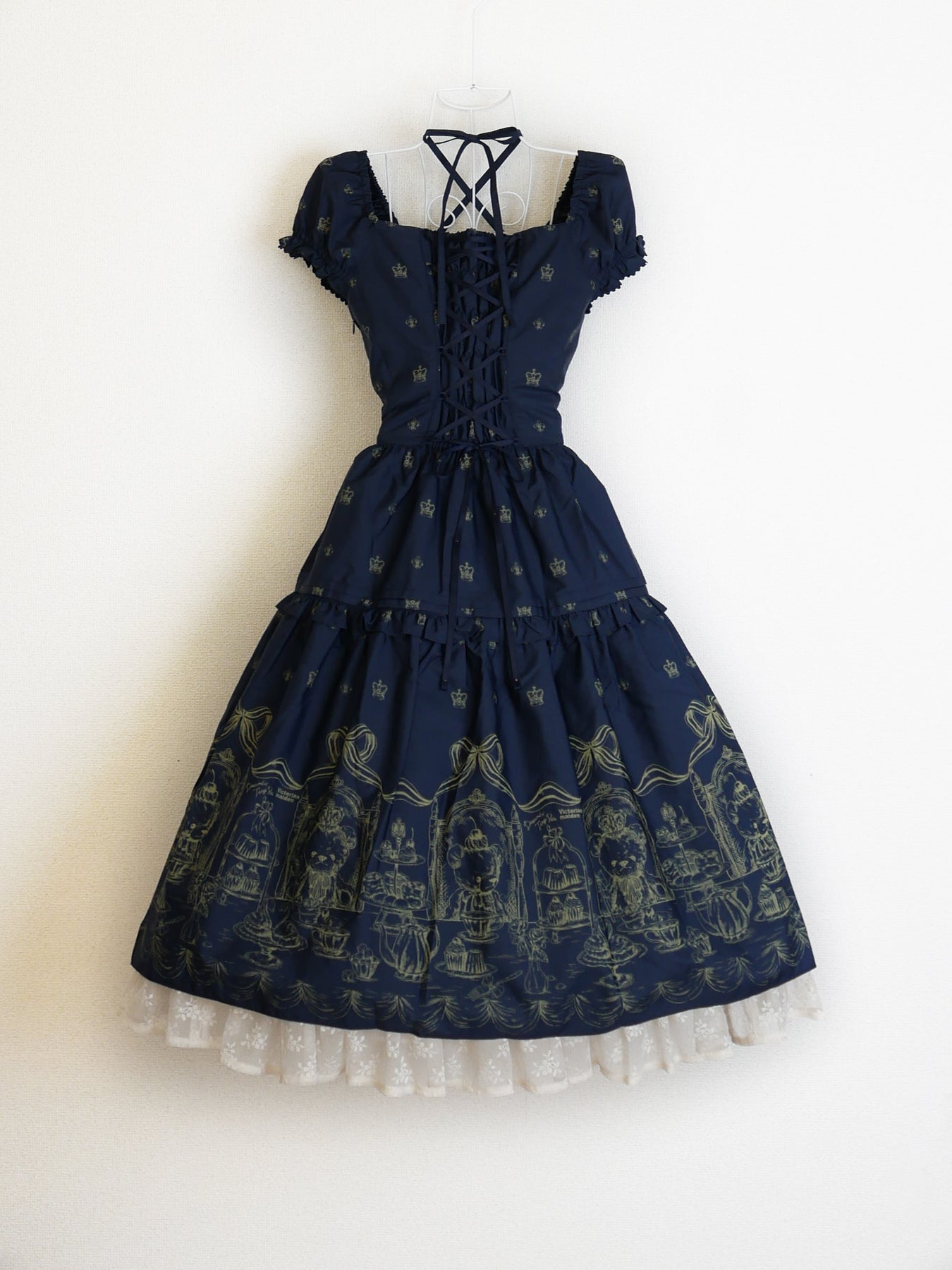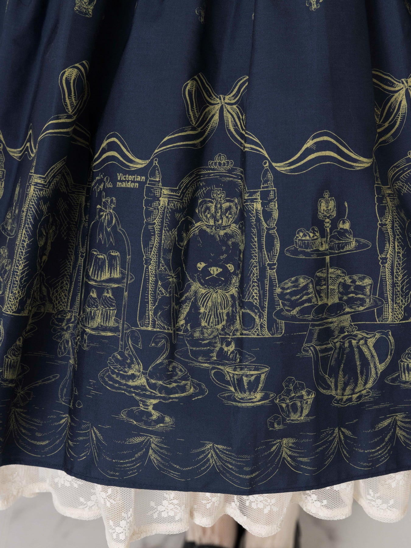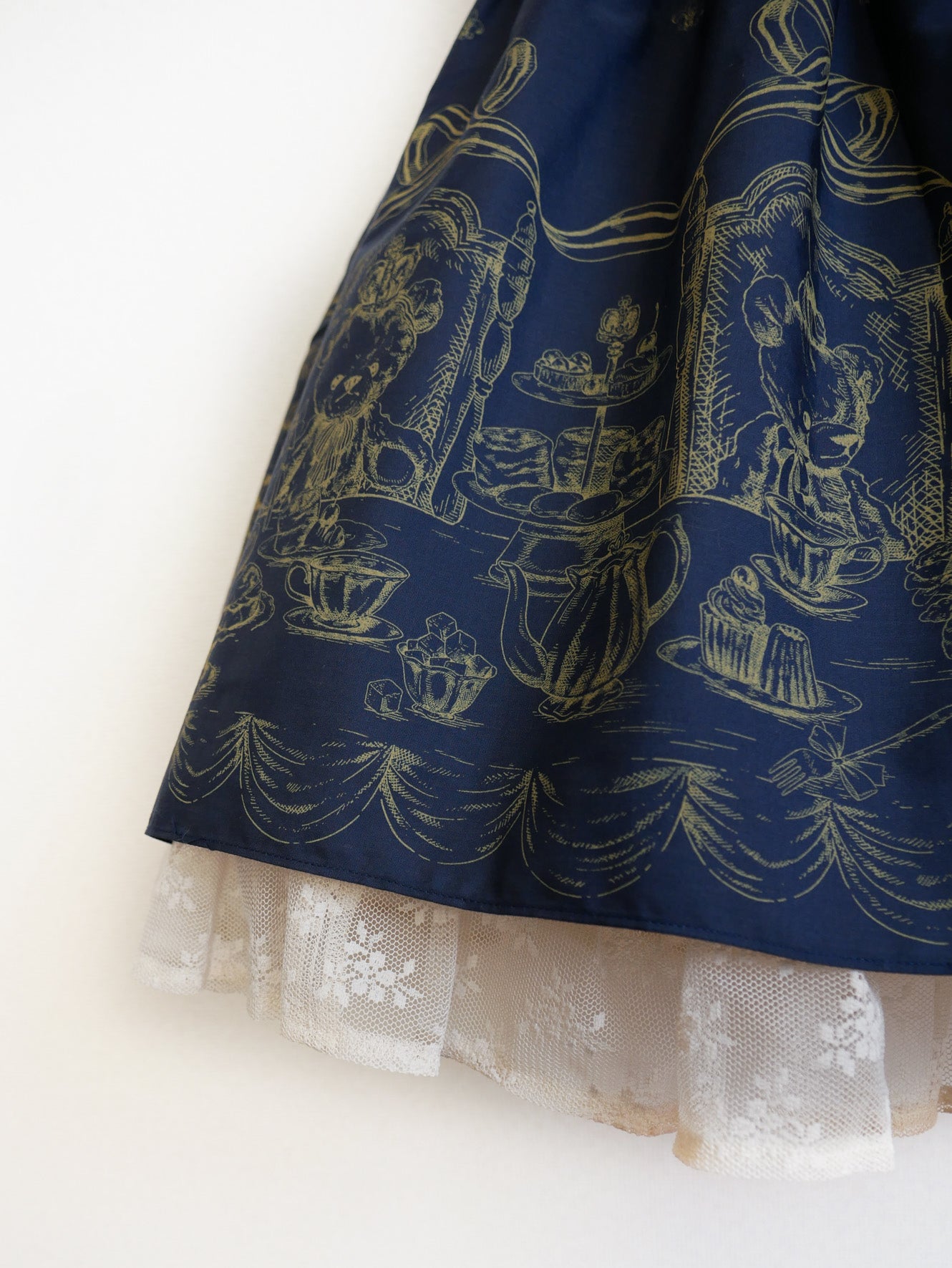 クロップド丈のティアードスカートにアフタヌーンティーを楽しむベアたちを愛らしく描き、裾から覗くアメリアレーシーのフリルが可憐なアクセントとなるドレス。