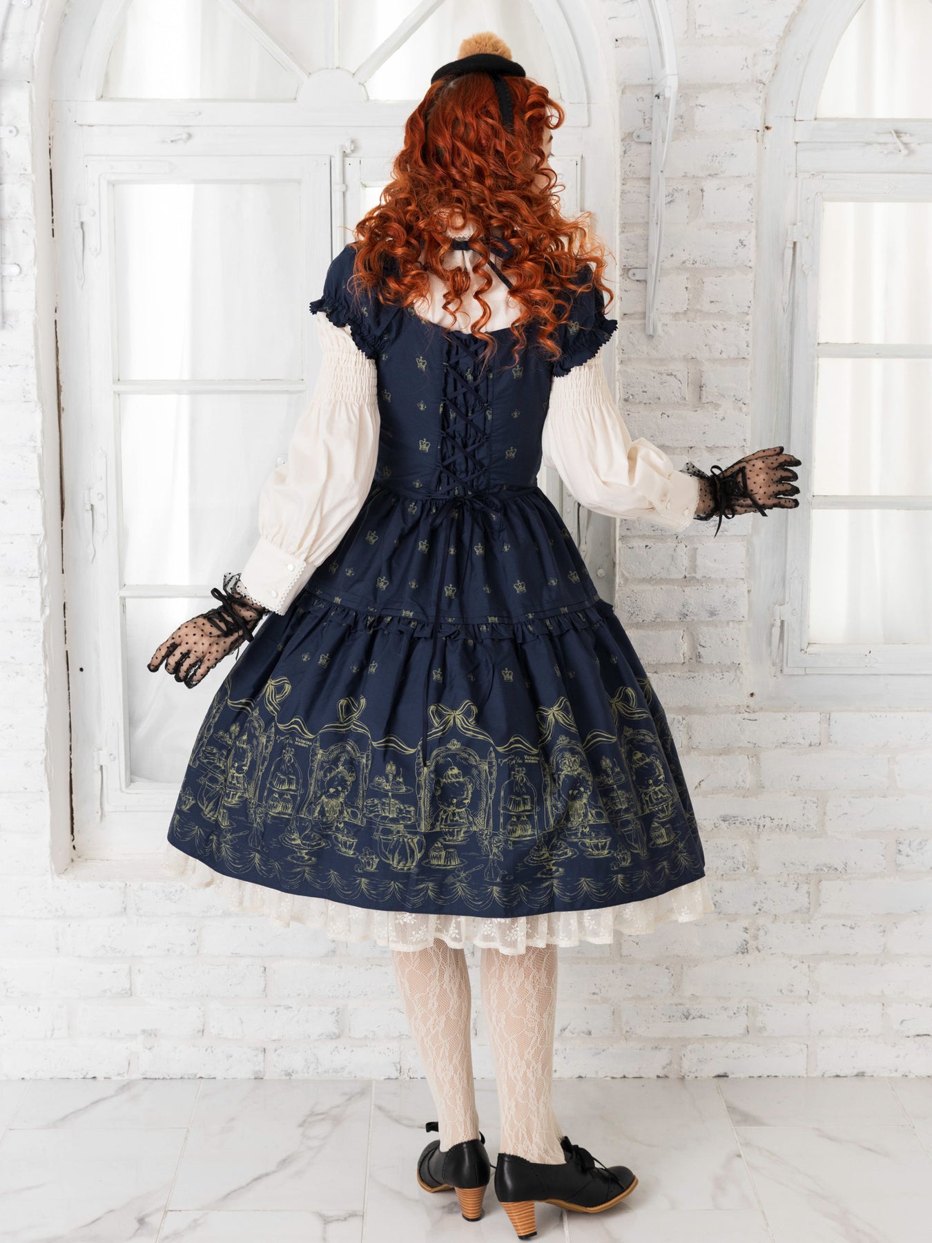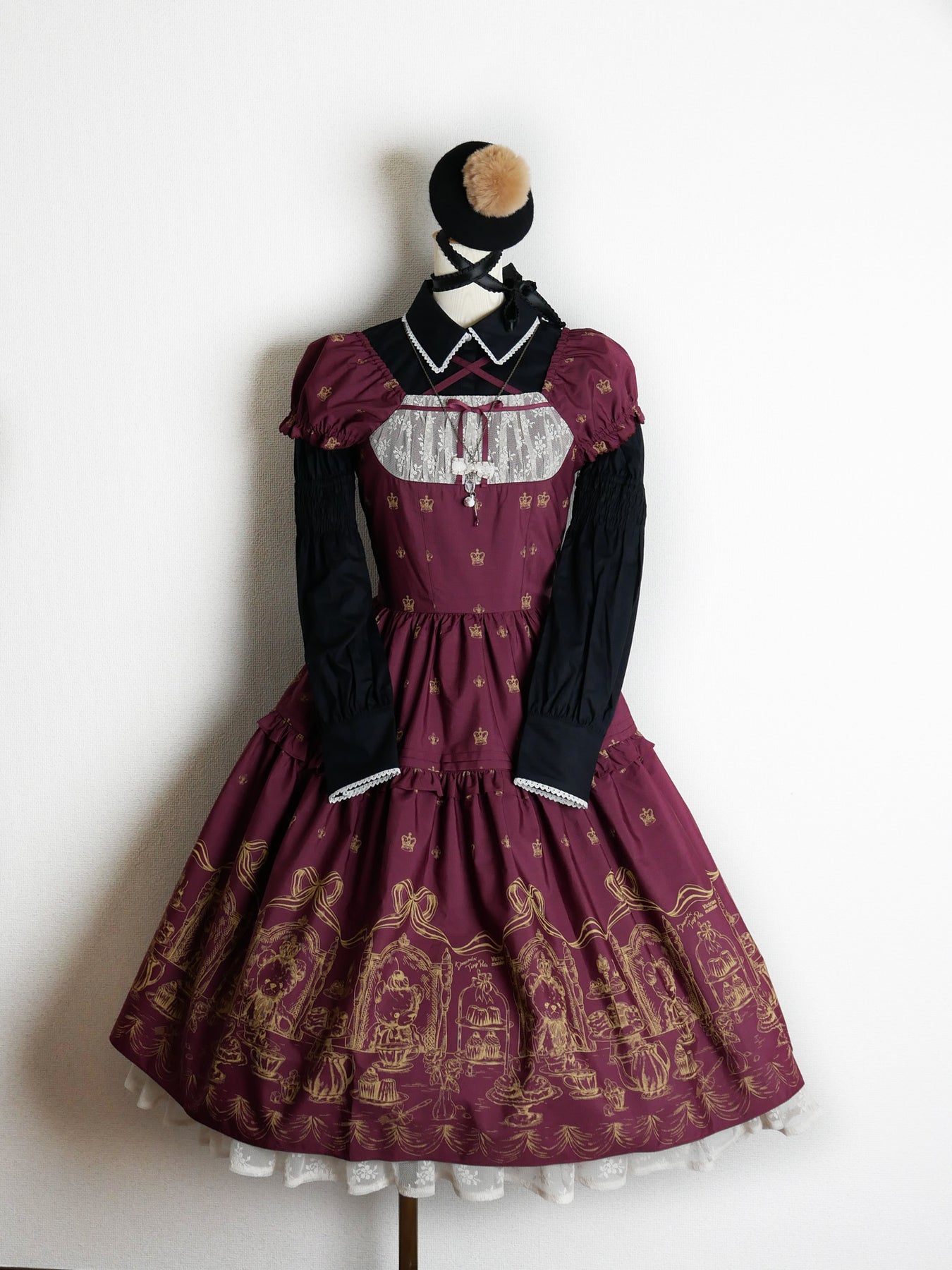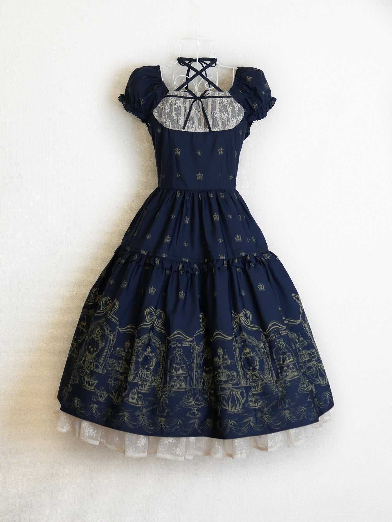 クロップド丈のティアードスカートにアフタヌーンティーを楽しむベアたちを愛らしく描き、裾から覗くアメリアレーシーのフリルが可憐なアクセントとなるドレス。