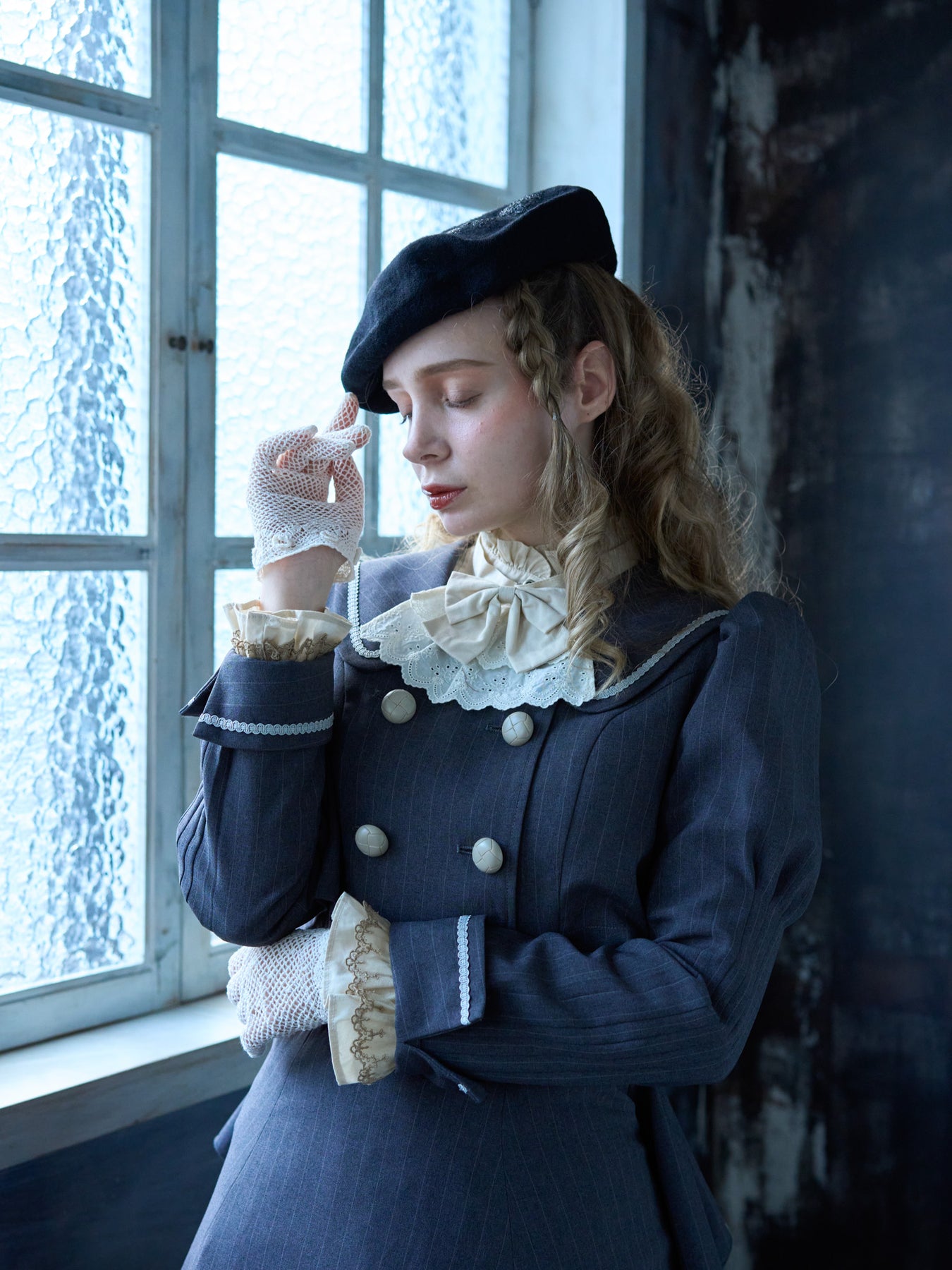 同色の繊細なパールラメの粒がさりげなくきらめき、角度によって表情を変えながら装いにクラシカルな華やぎを添えてくれます。