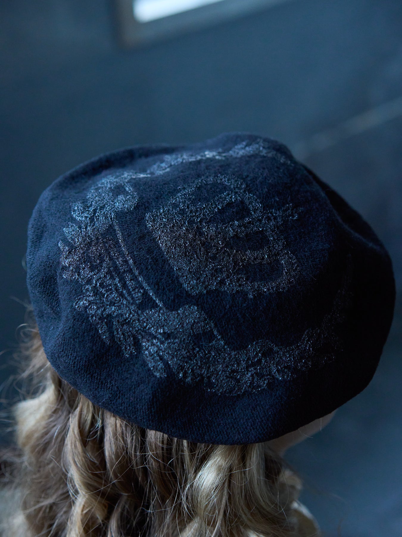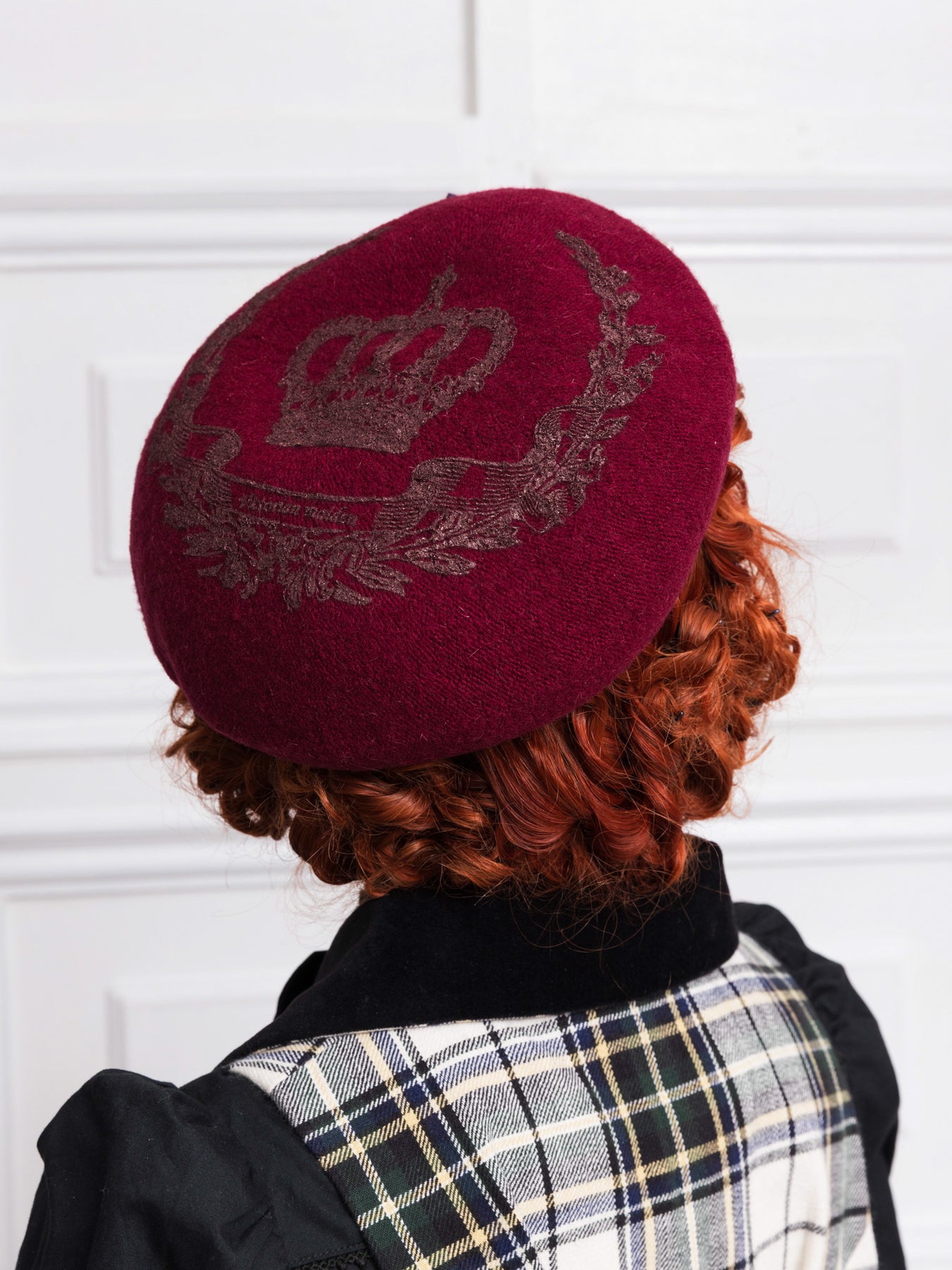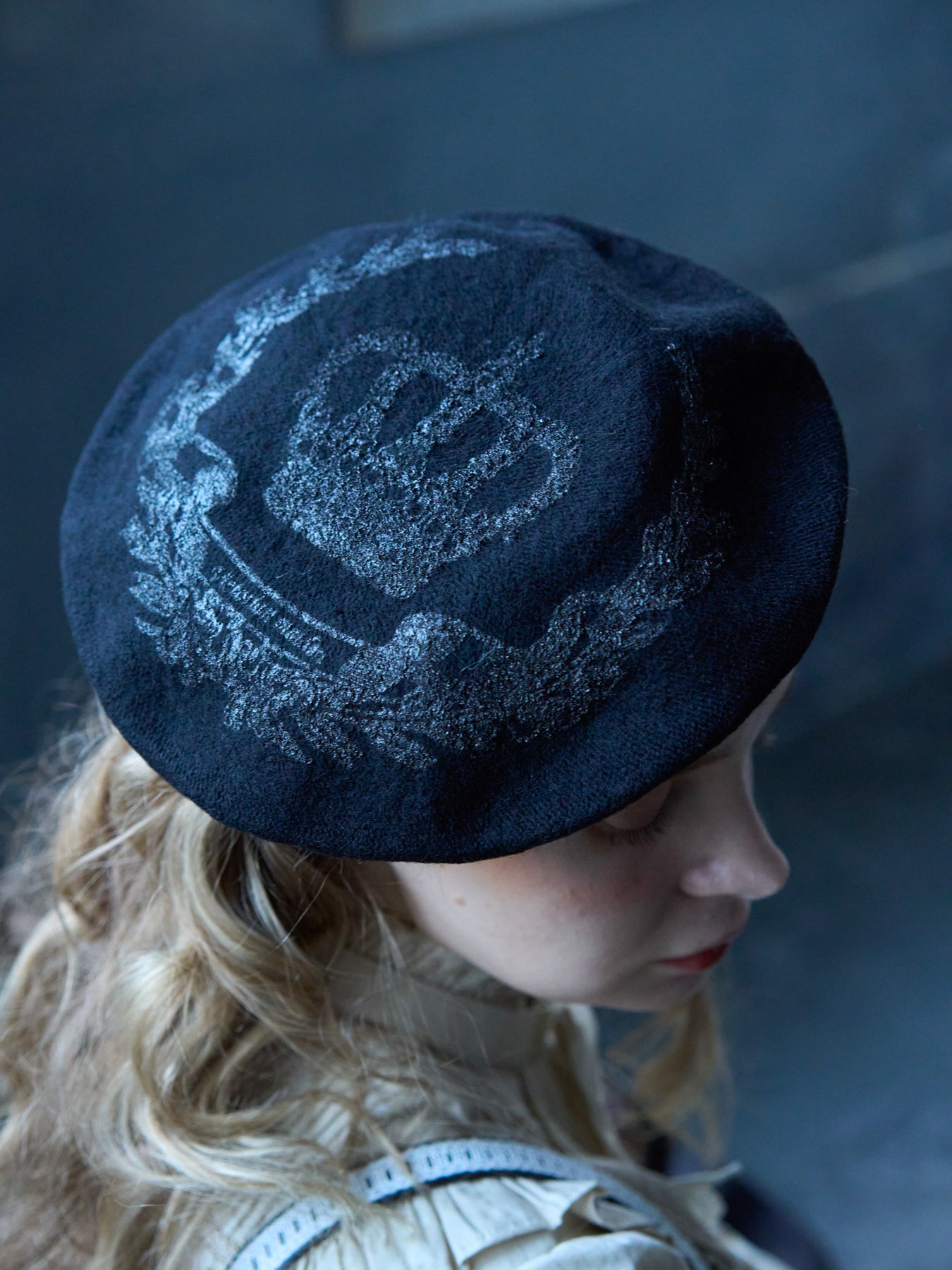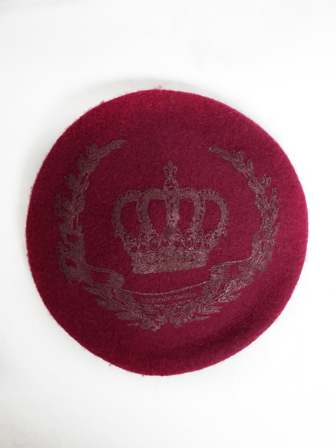 フェルト素材のベレー帽にパール顔料でロイヤルな王冠モチーフを施しました。