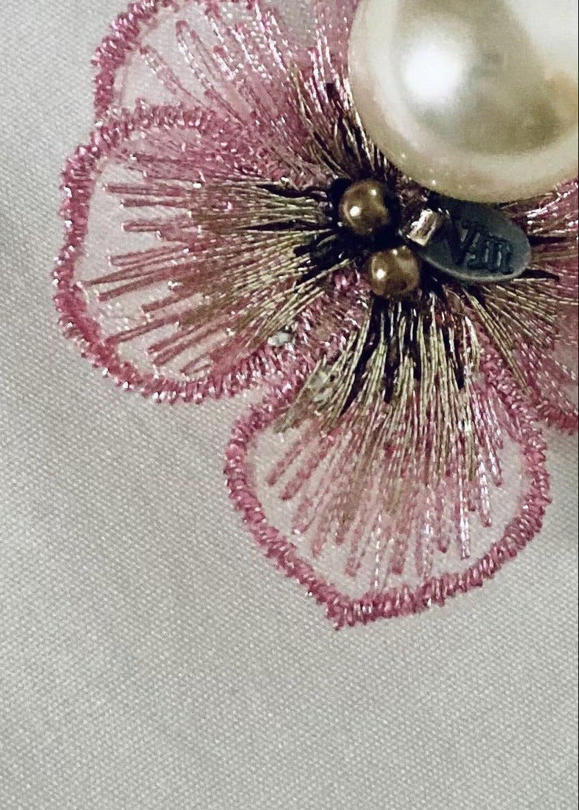 モチーフの中央にはアンティークカラーのパールと薄紫のビーズやブランドロゴの入ったチャーム付き。