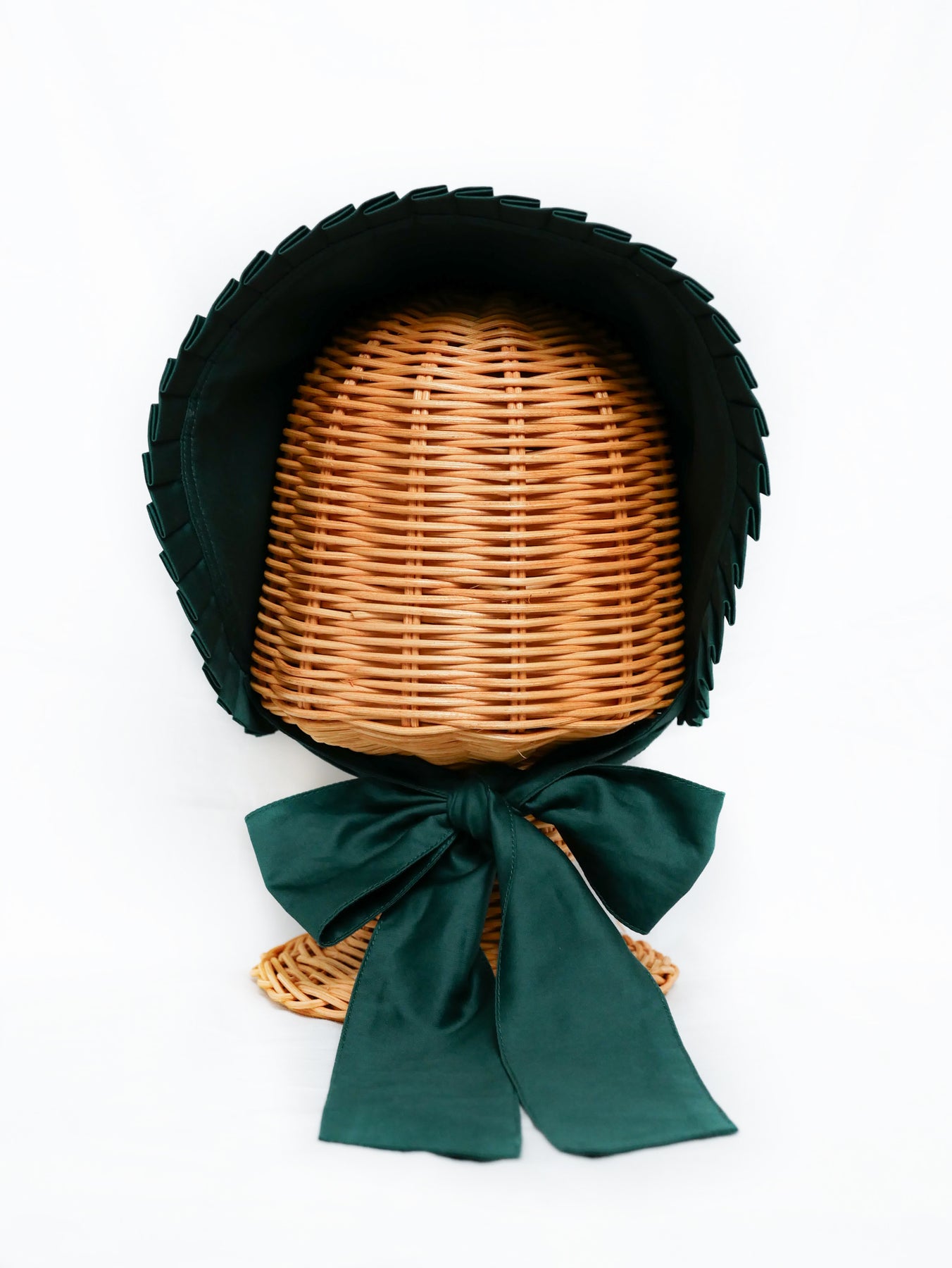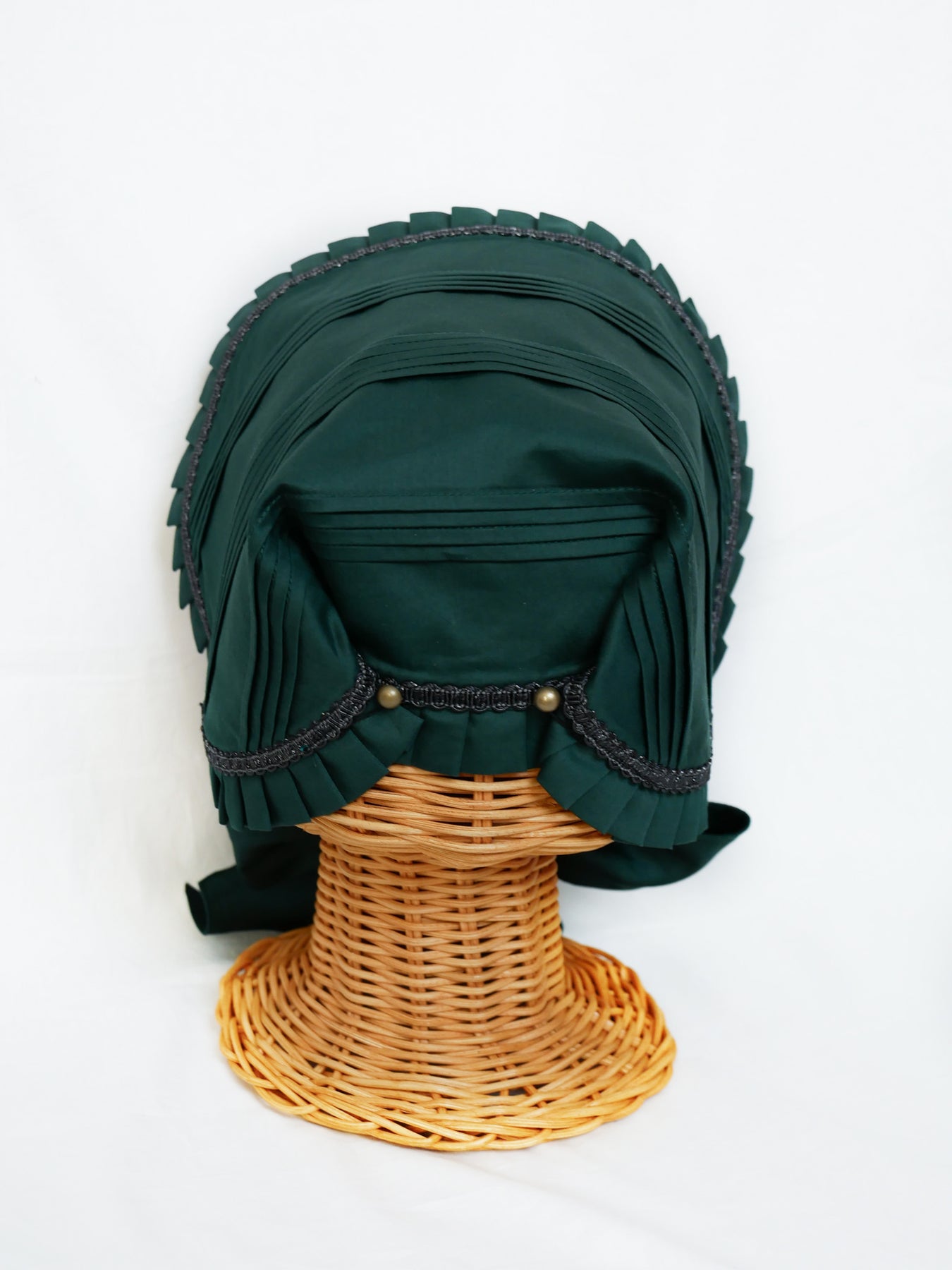 ループにボタンを通していただくとボンネットとして、ボタンを外して半分に畳んでいただくとお顔周りにフィットしたハーフボンネットとしてお召しいただけます。
