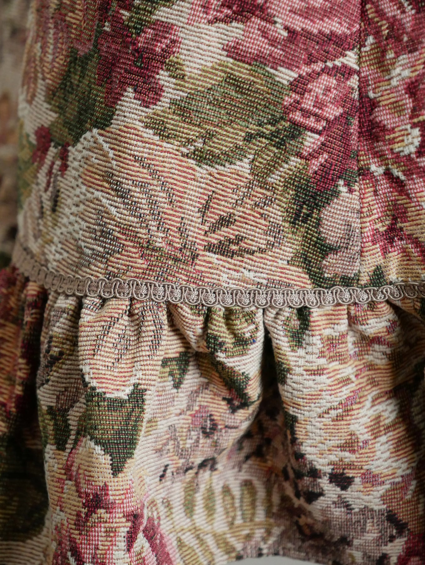 伝統的なゴブラン織りとボルドーのリボンが後ろ姿まで優雅な余韻を残し、裾に施されたフリルが繊細で豪華なデザインです。