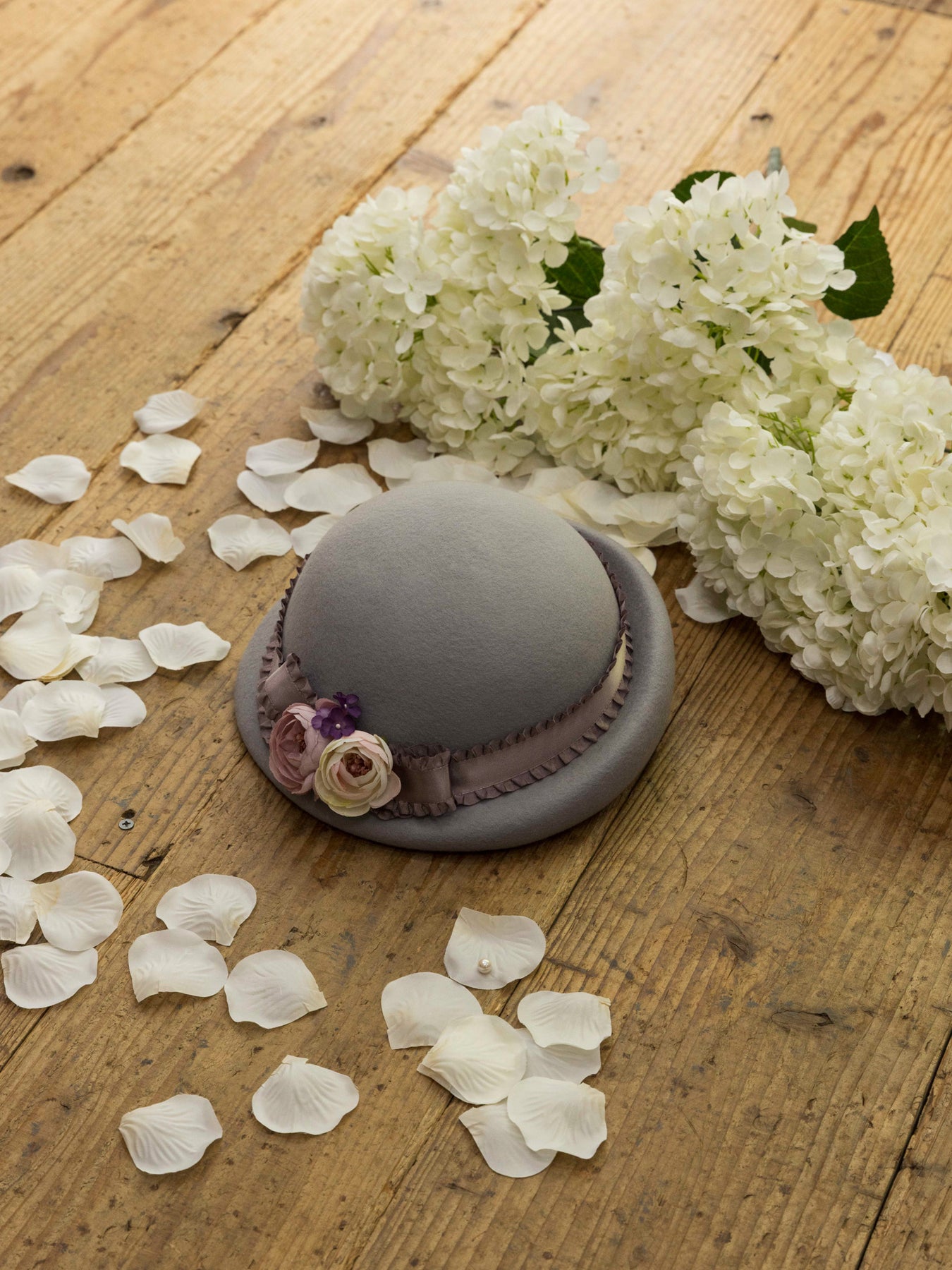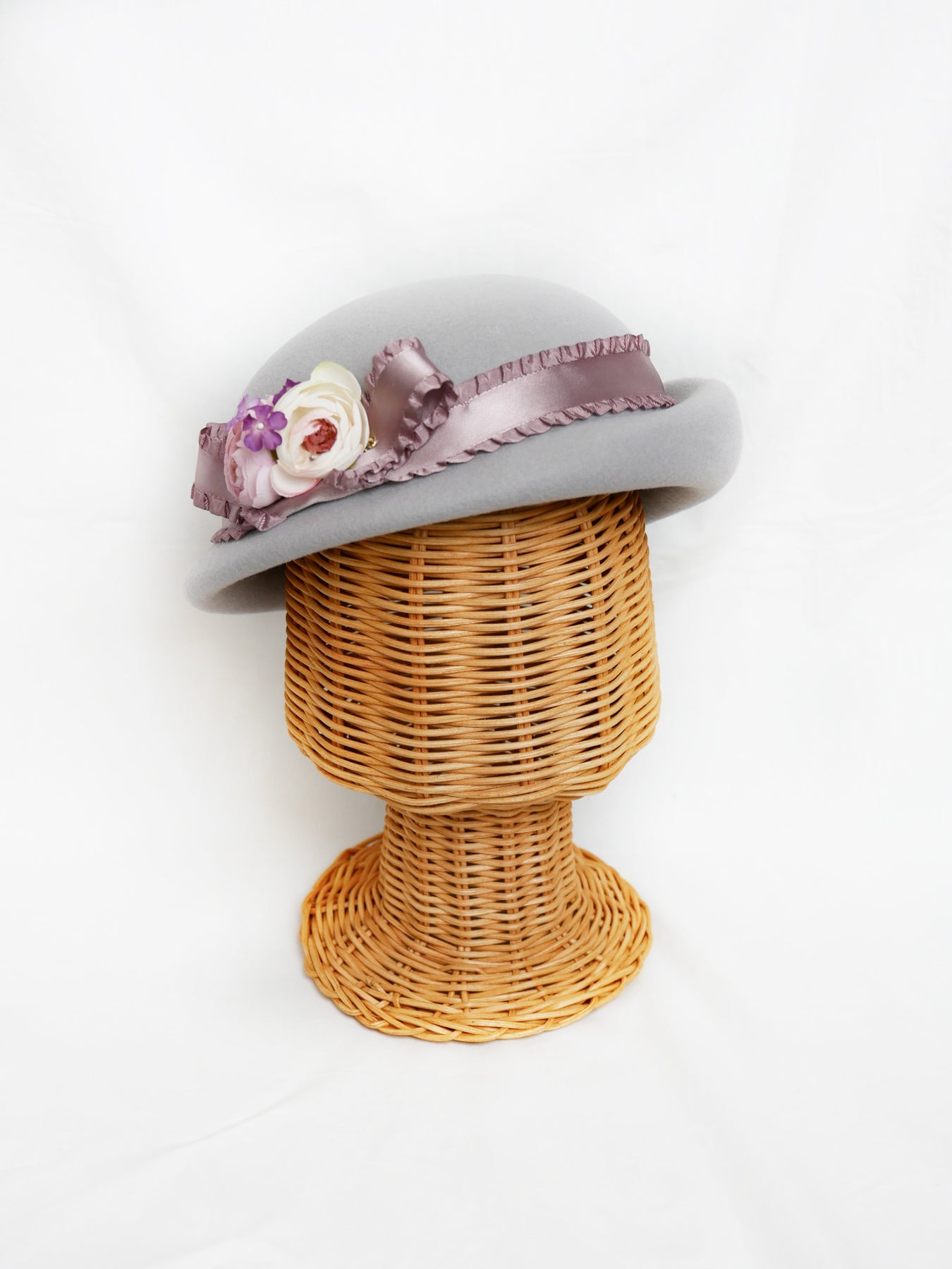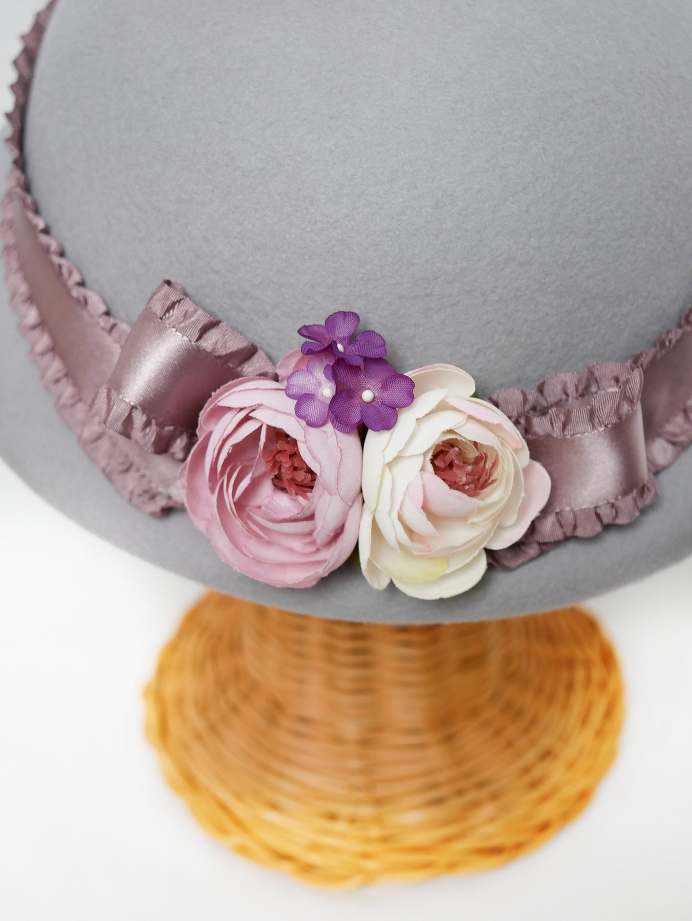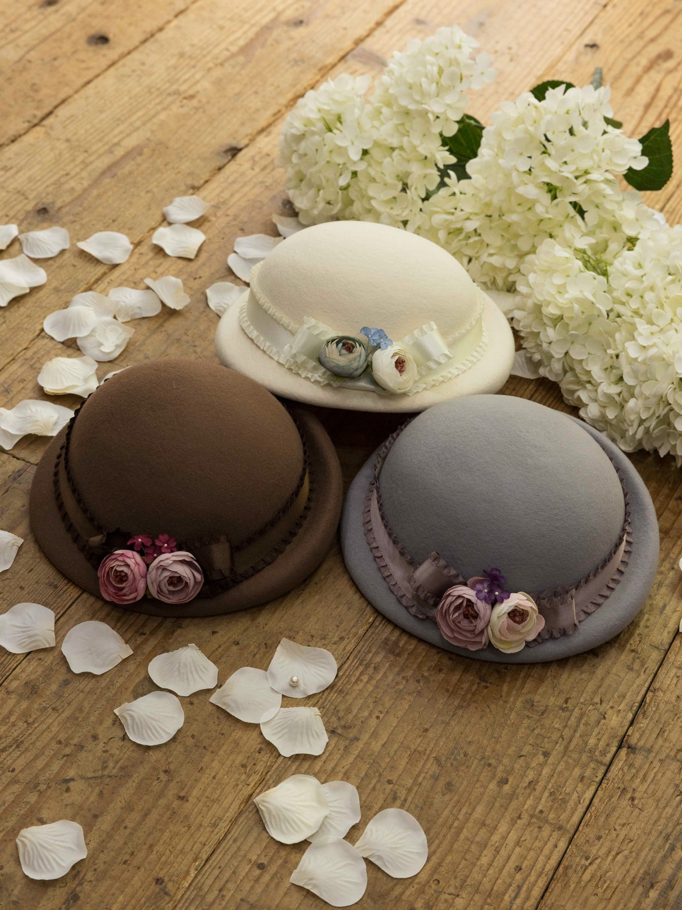 儚い小さなお花が咲き誇るコサージュをあしらい、光沢感のあるフリルサテンリボンが巻かれたニュアンスカラーのアイボリー、ラベンダーグレー、ブリュンヌの3色展開でお仕立てしたハット。