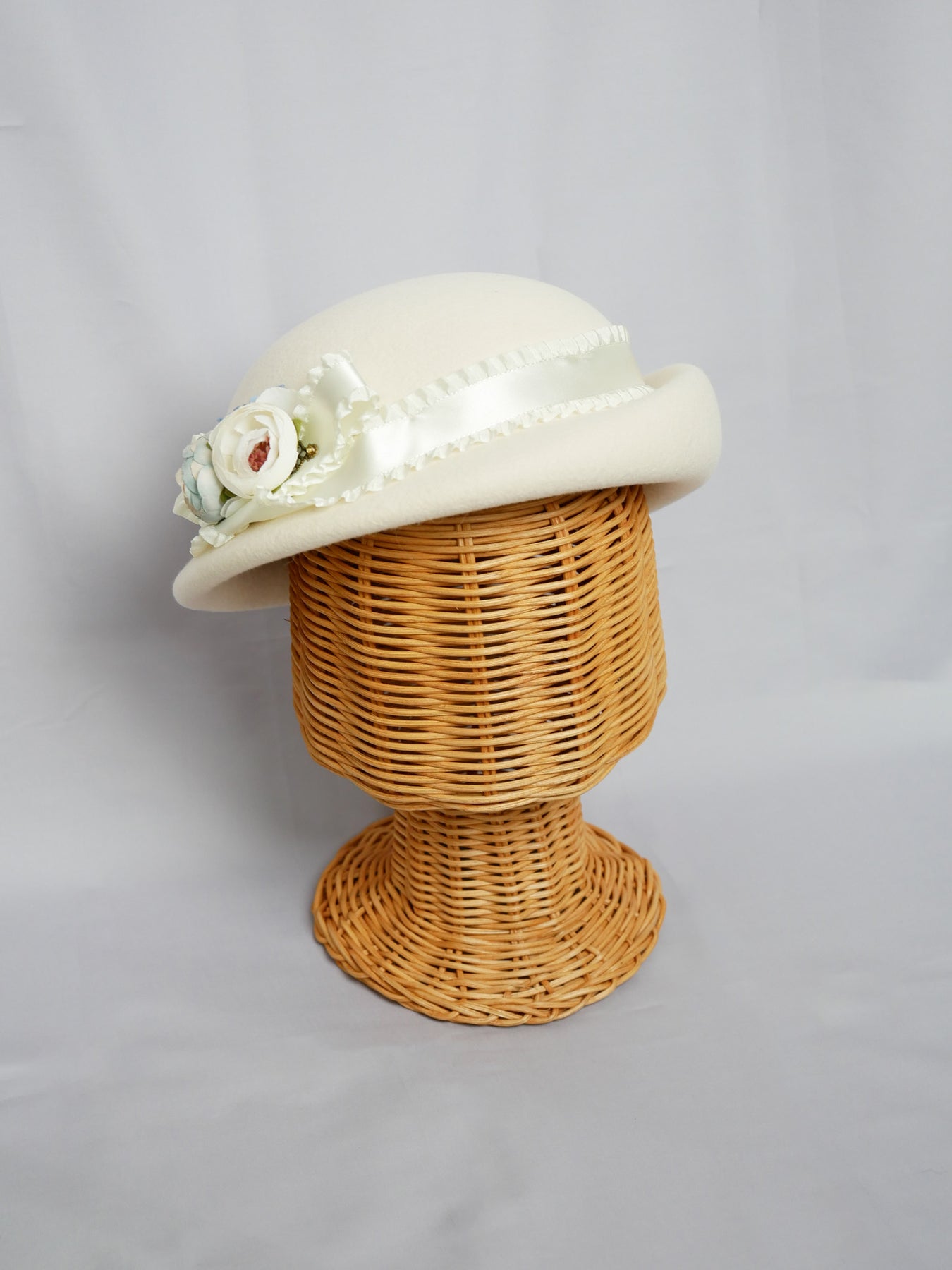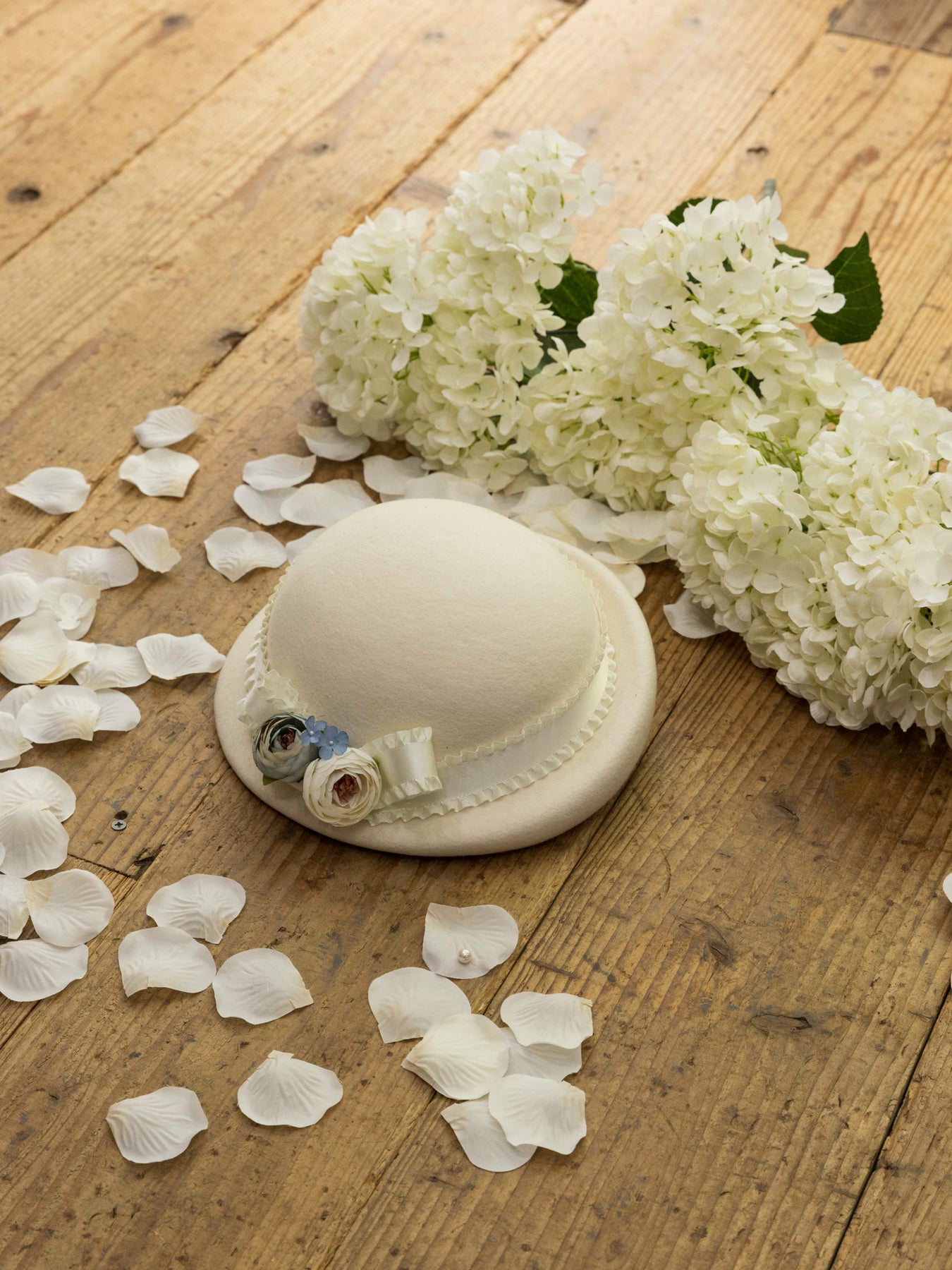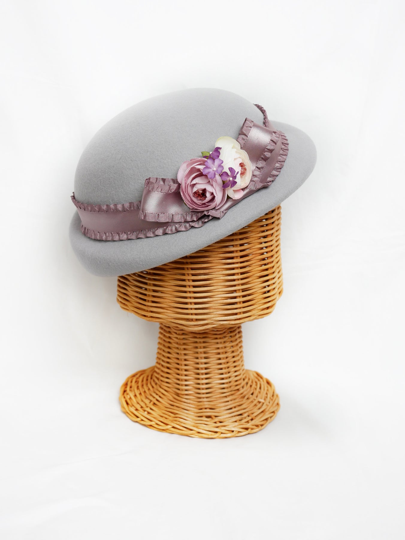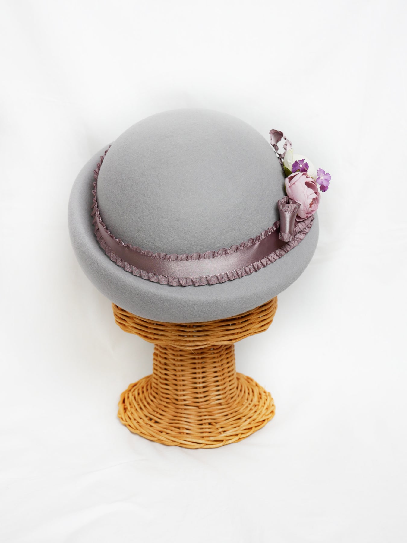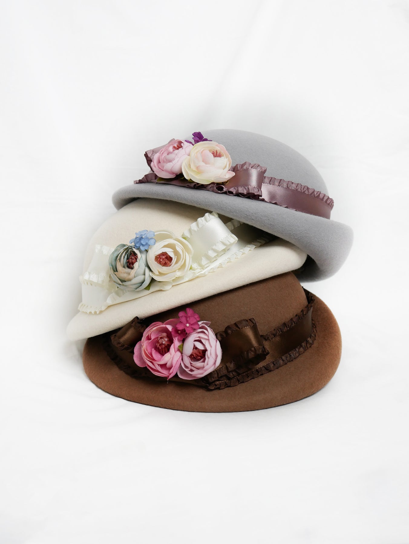 儚い小さなお花が咲き誇るコサージュをあしらい、光沢感のあるフリルサテンリボンが巻かれたニュアンスカラーのアイボリー、ラベンダーグレー、ブリュンヌの3色展開でお仕立てしたハット。