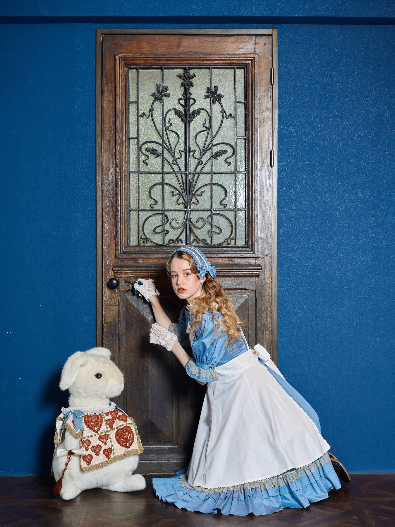 物語の世界観をイメージしたヘッドドレスやエプロン、コットンレースドロワーズをお召しいただくと、よりアリスらしい装いをお楽しみいただけます。