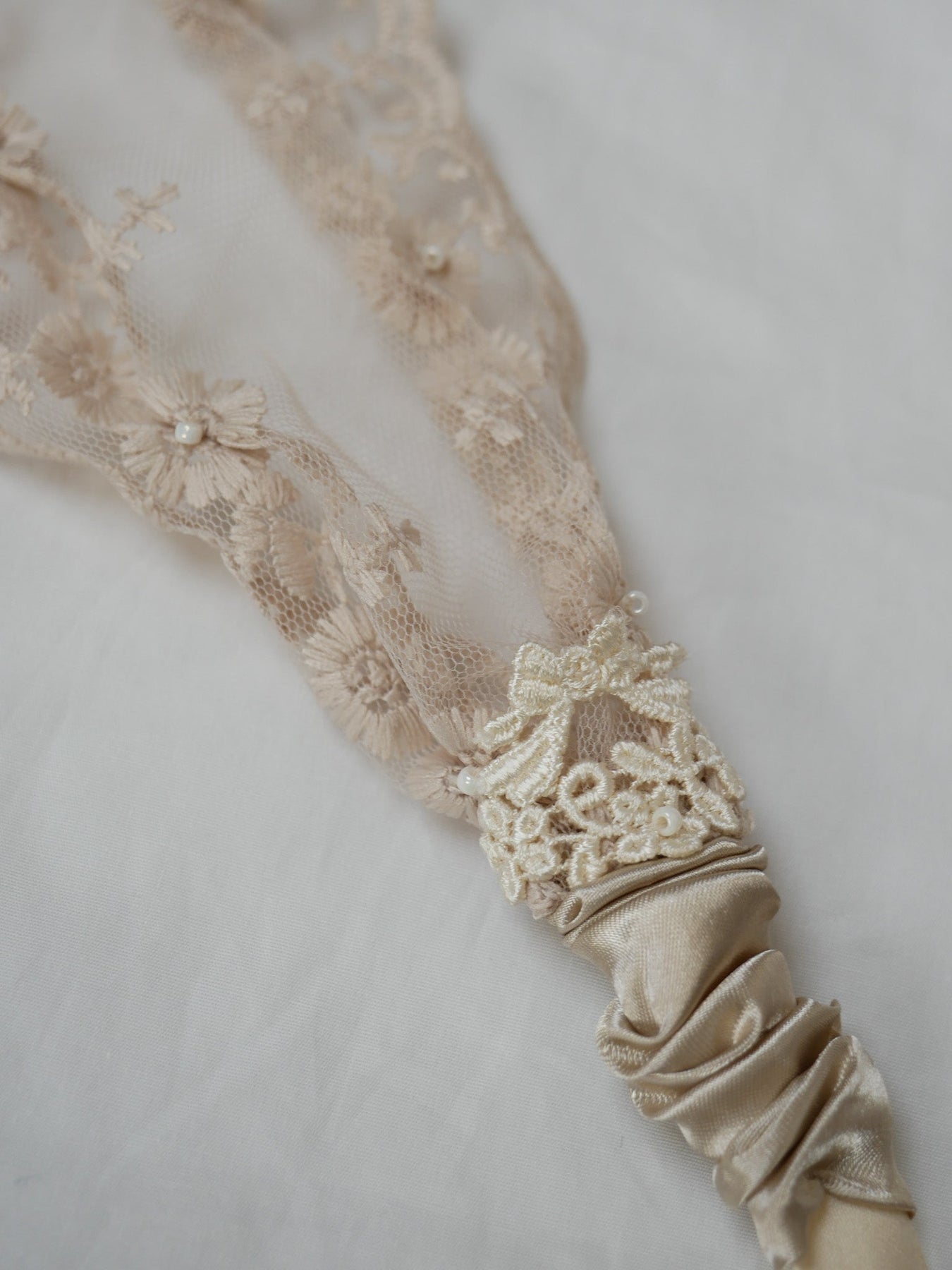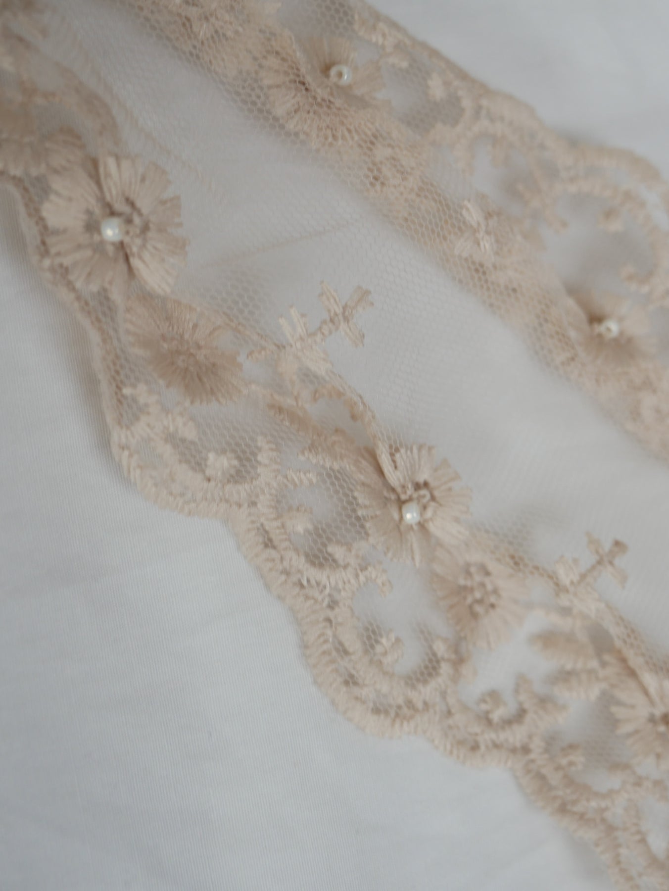 小花が刺繍されたチュールレース生地を立体感を持たせる為にクリアビーズで1点1点留め付けました。