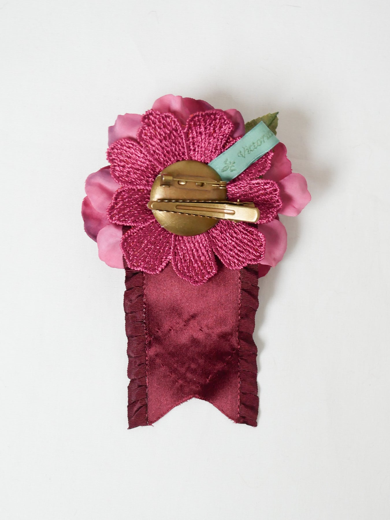 花芯に見立てた3粒の異なる大きさのパールやVmロゴ入りの王冠レースがアクセントとして施されています。コサージュとしては勿論、ヘアクリップとしても着用可能な2way仕様です。帽子などのワンポイントとしてもコーディネイトを魅力的に惹き立てます。