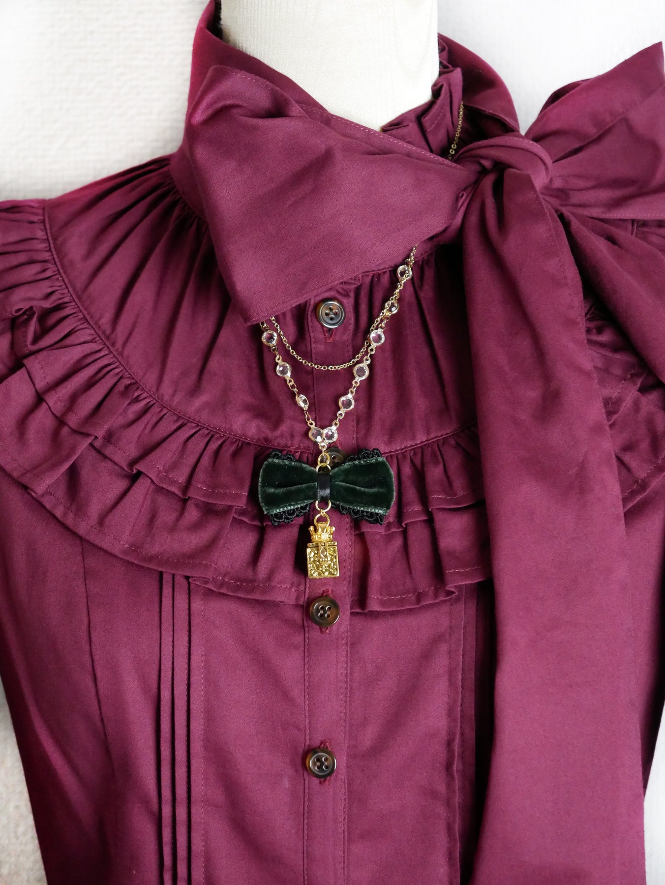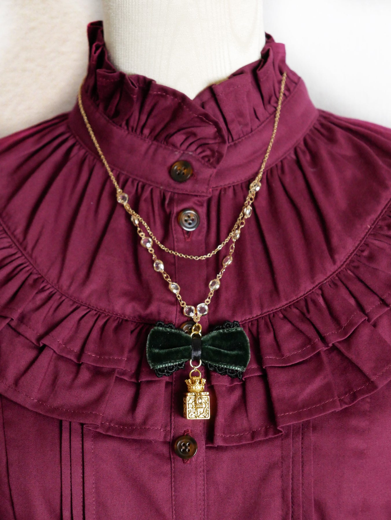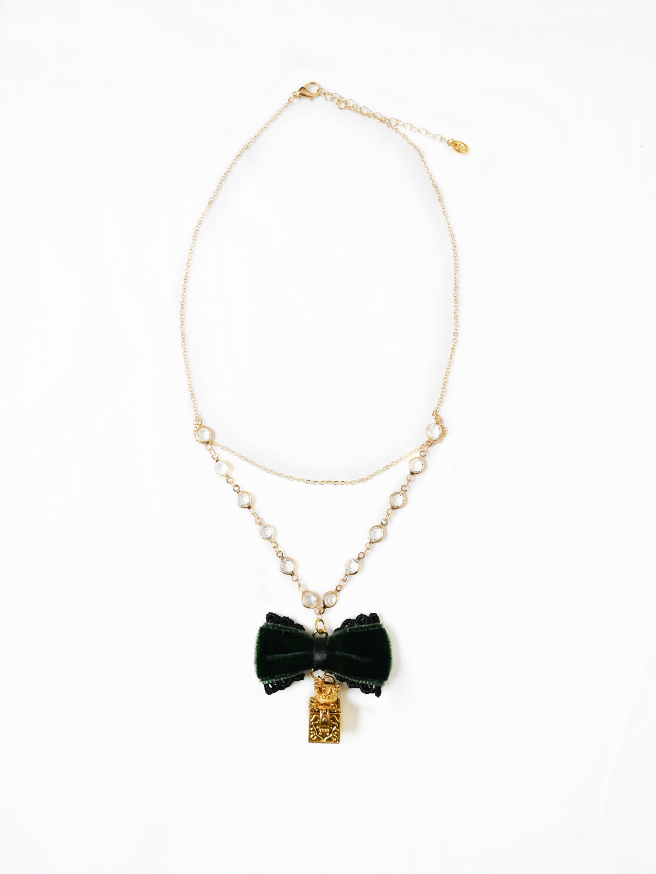 煌びやかなラインストーンと繊細な2連のチェーンがさり気なく首元に輝きを与え、深みのあるグリーンのリボンがよりモチーフの煌めきを惹きたてます。