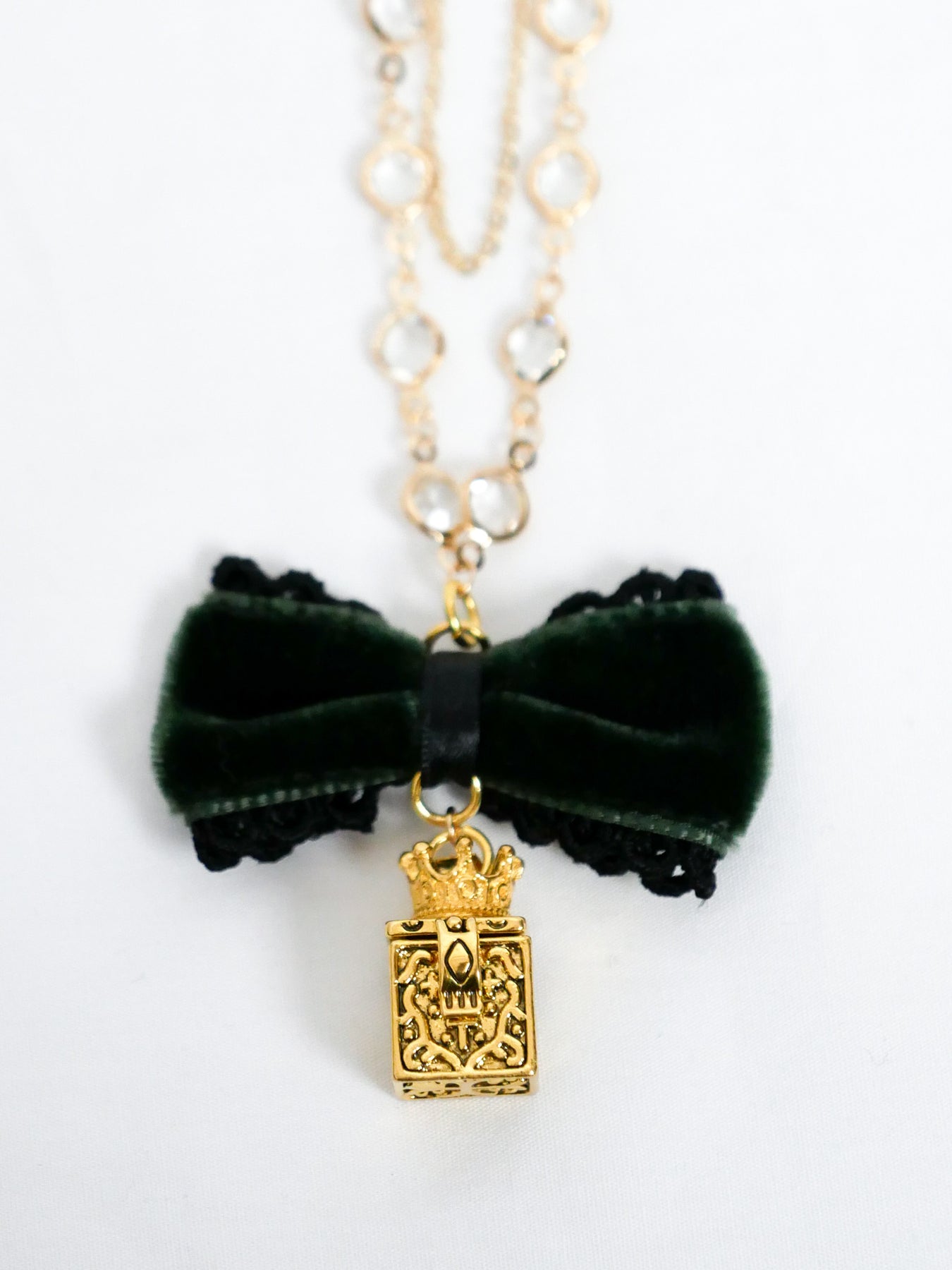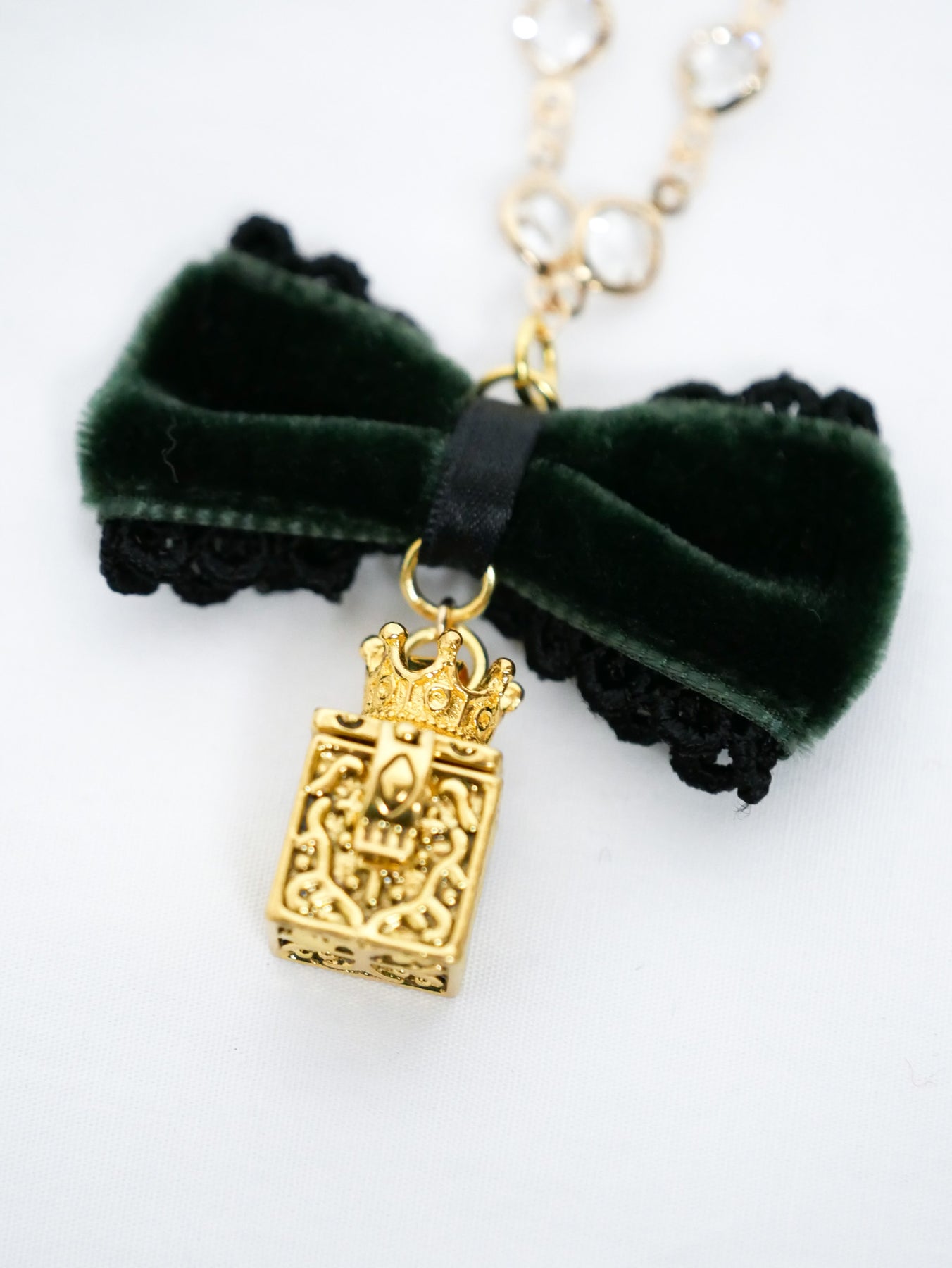 ノーブルサテンシリーズに合わせたトラディショナルな雰囲気を纏った、深みのあるモスグリーンのリボンに、輝く王冠と宝箱のようなギフトボックスのモチーフを施したネックレス。