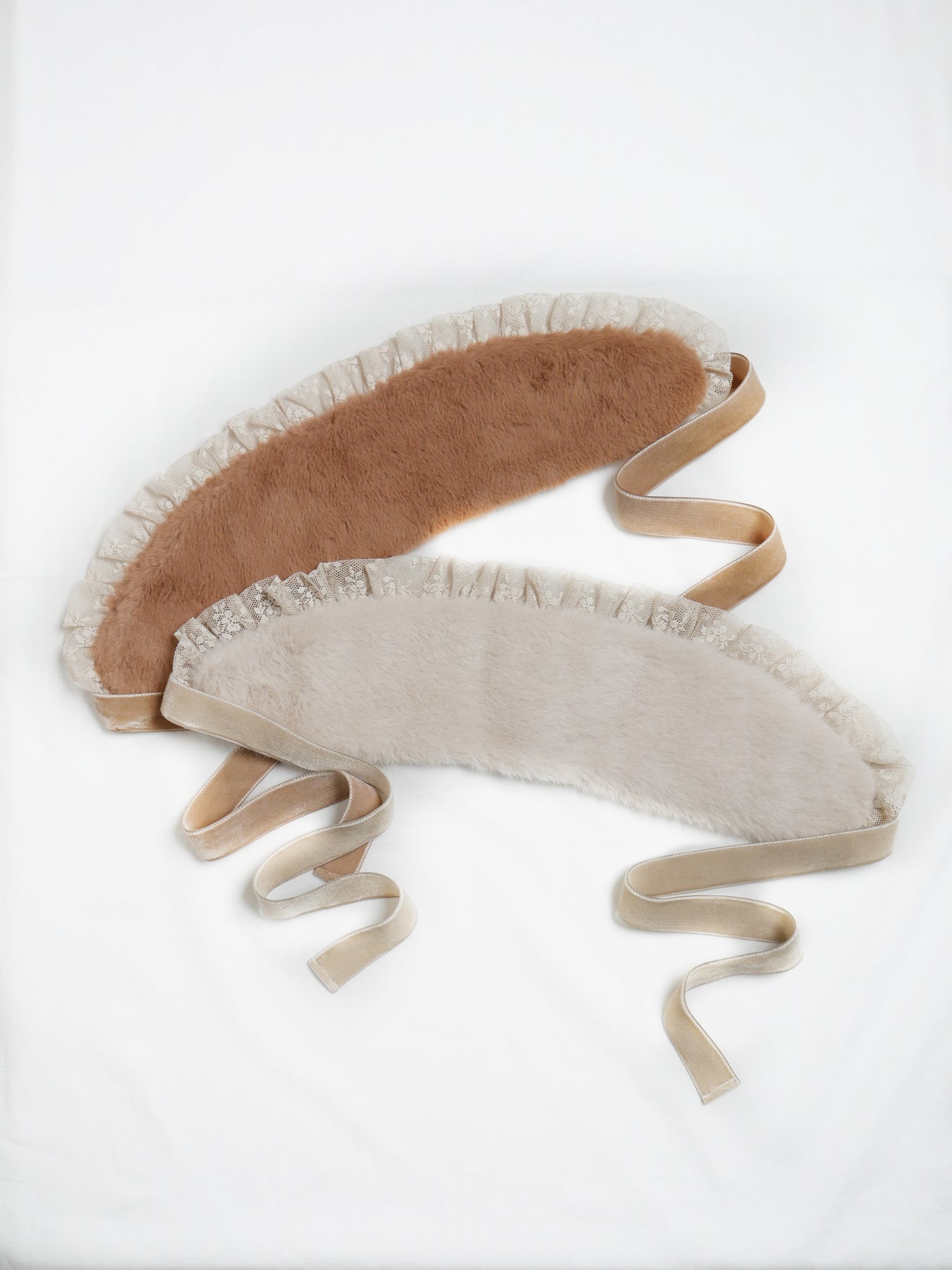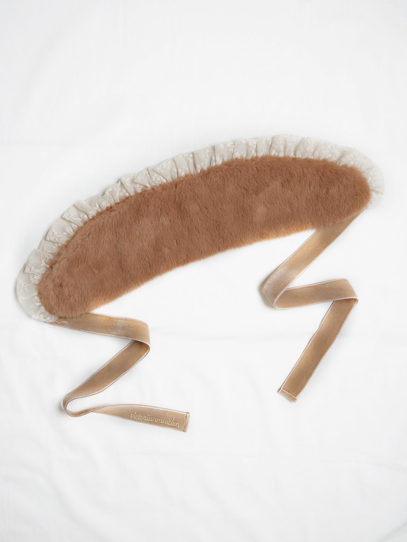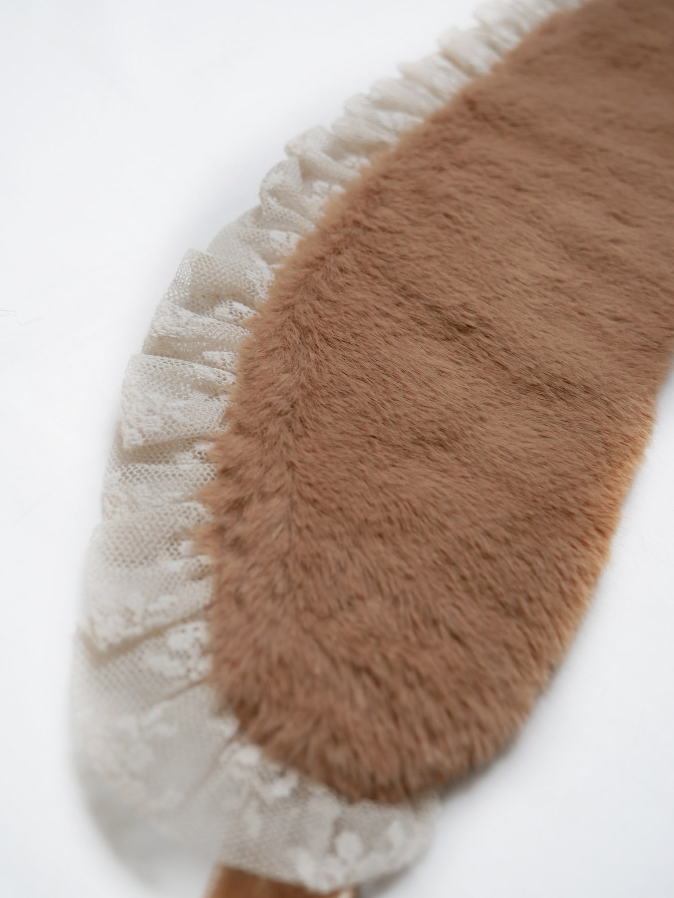 レース側を上にして頂くと優しい温もりに包まれ、さり気なく隙間から覗く柔らかいフェイクファーがお顔周りを魅力的に惹きたててくれます。