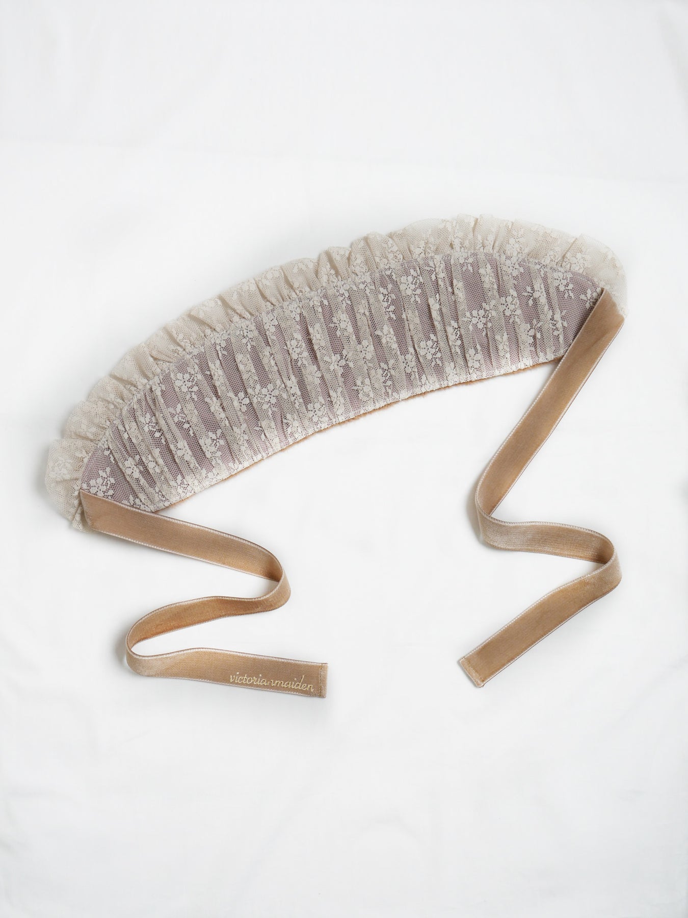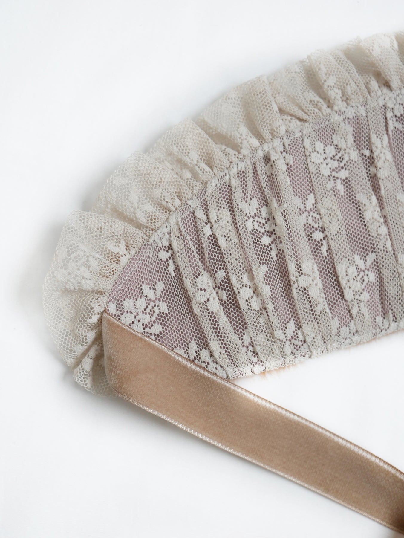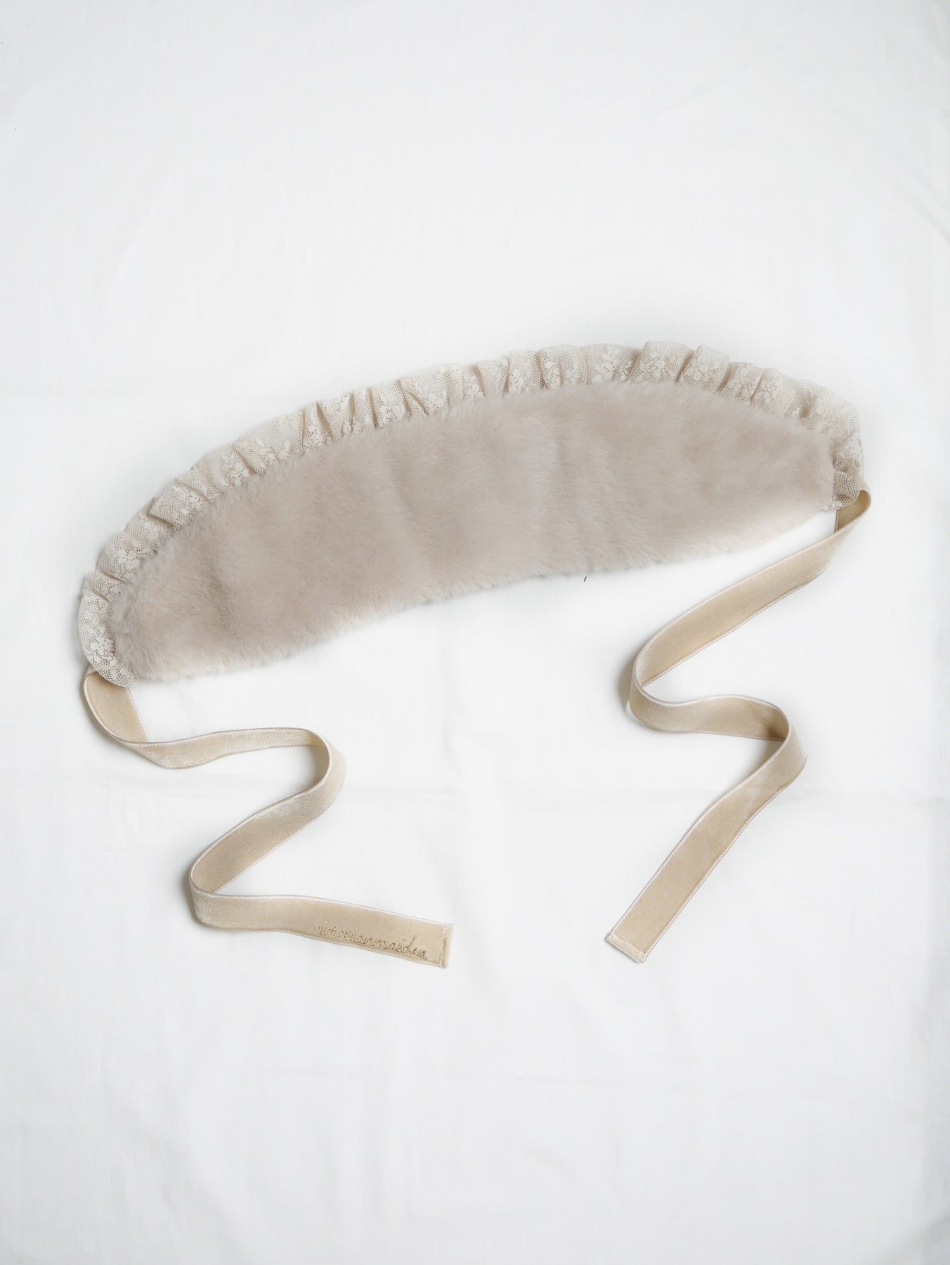 レース側を上にして頂くと優しい温もりに包まれ、さり気なく隙間から覗く柔らかいフェイクファーがお顔周りを魅力的に惹きたててくれます。