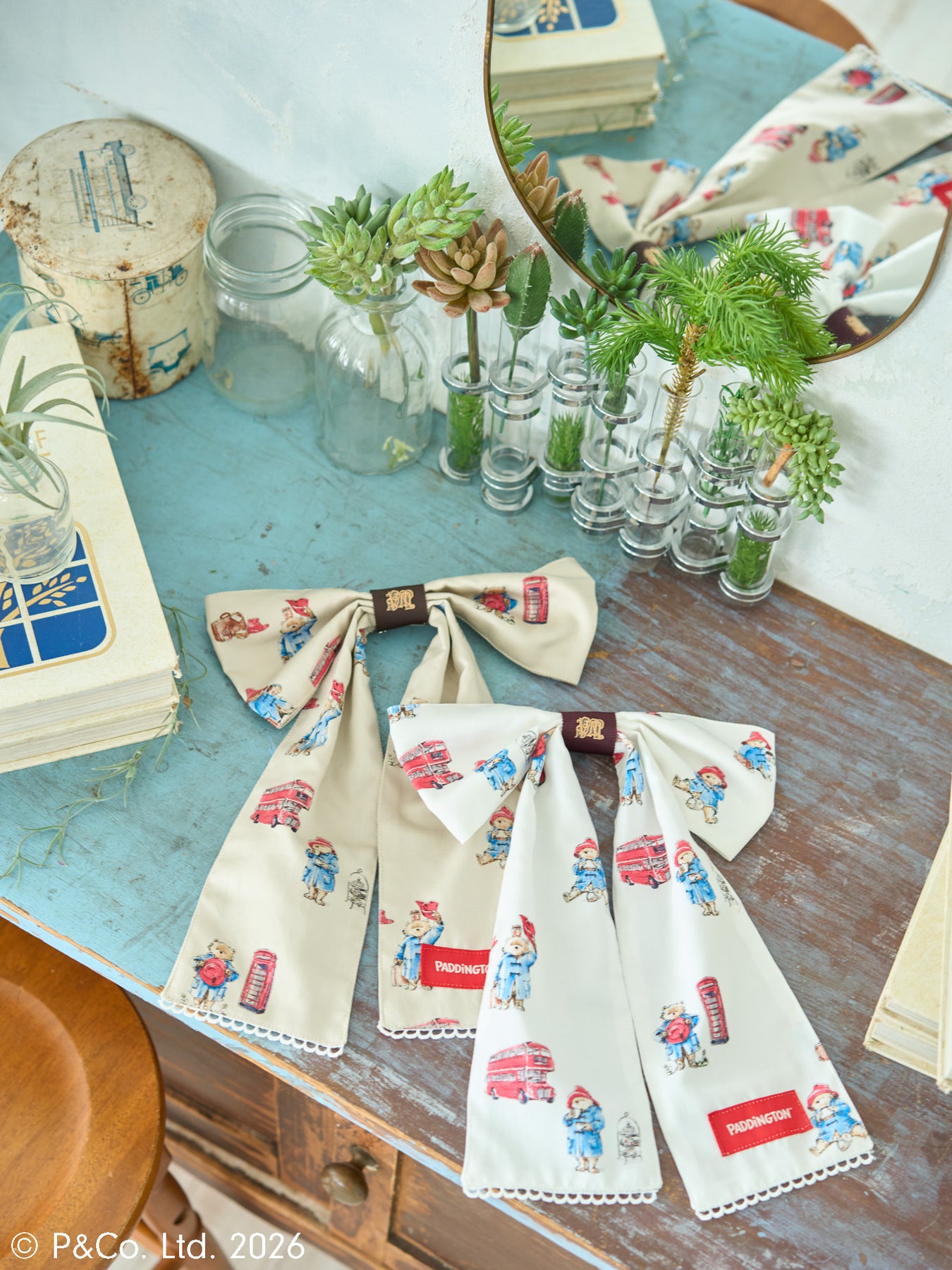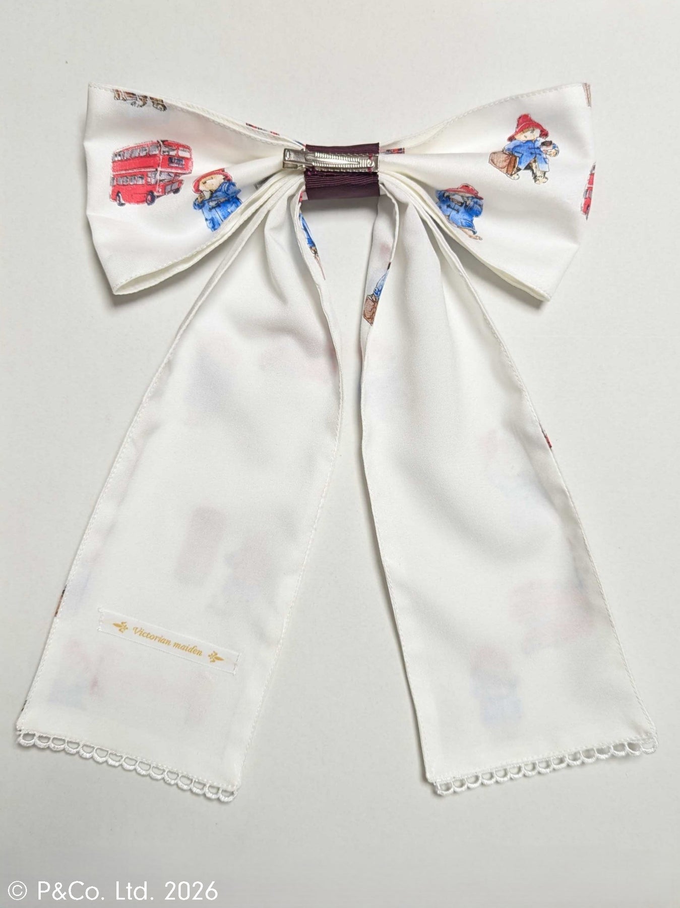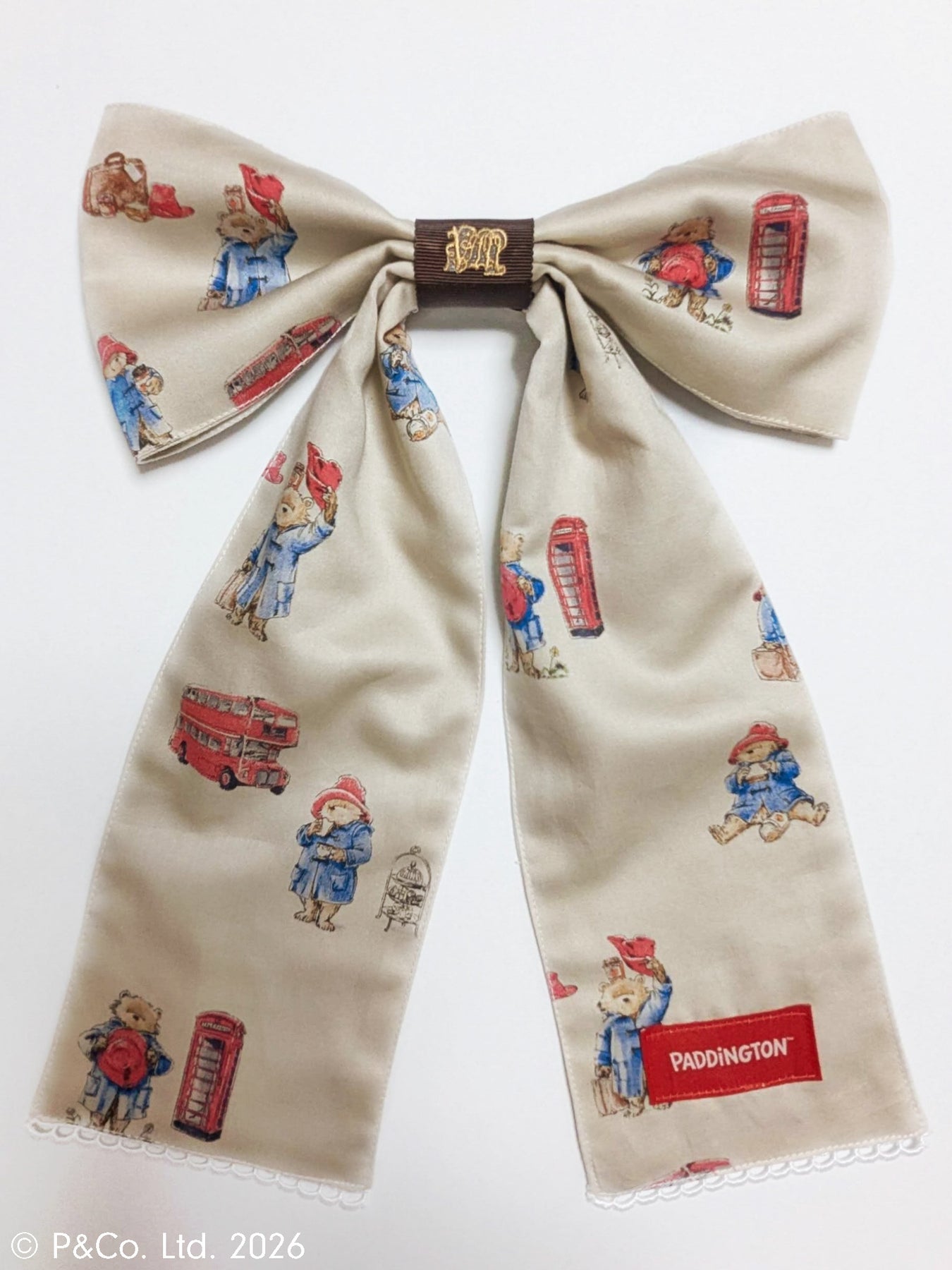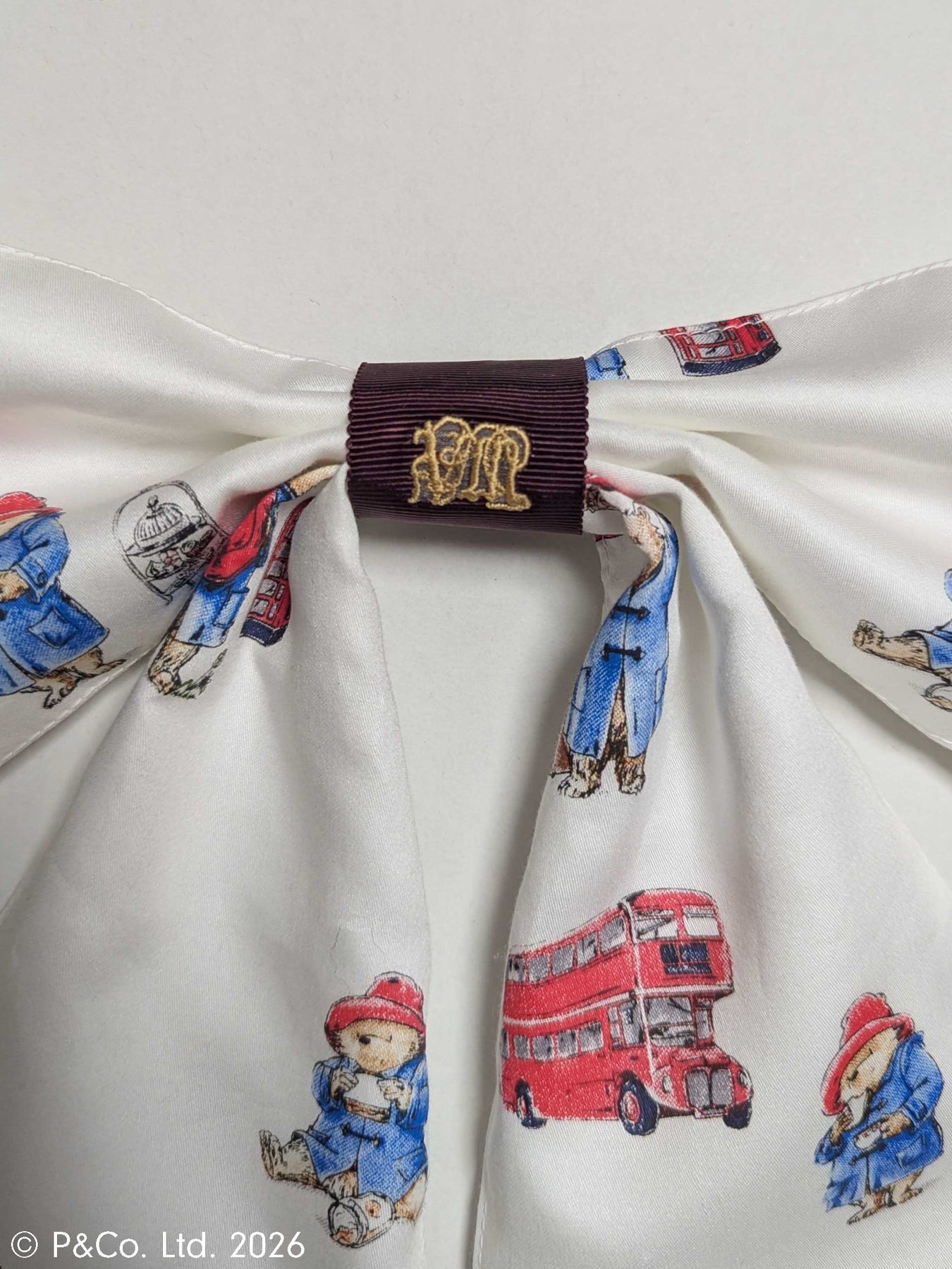 沢山のポーズのパディントンとロンドンモチーフが散りばめられたオリジナルテキスタイルを使用した、見た目にささやかな甘さを添える大きなリボン。