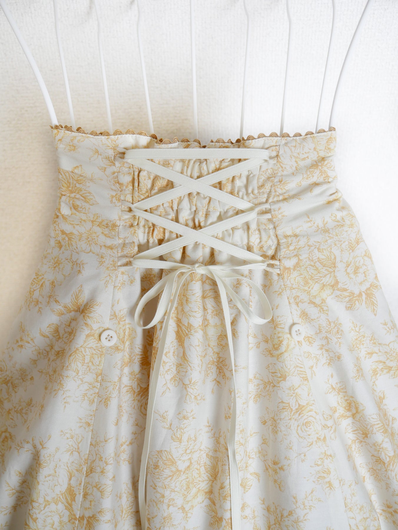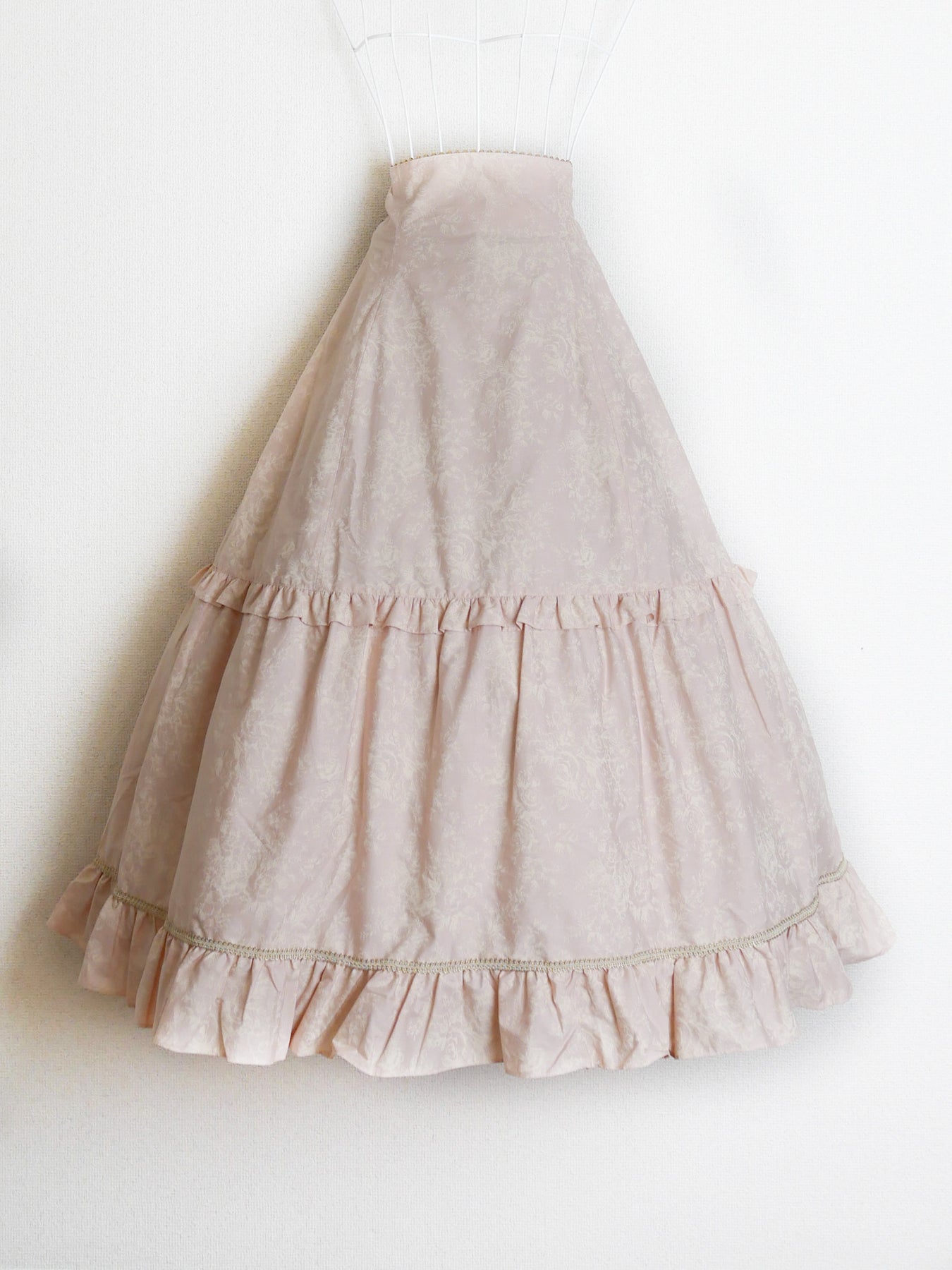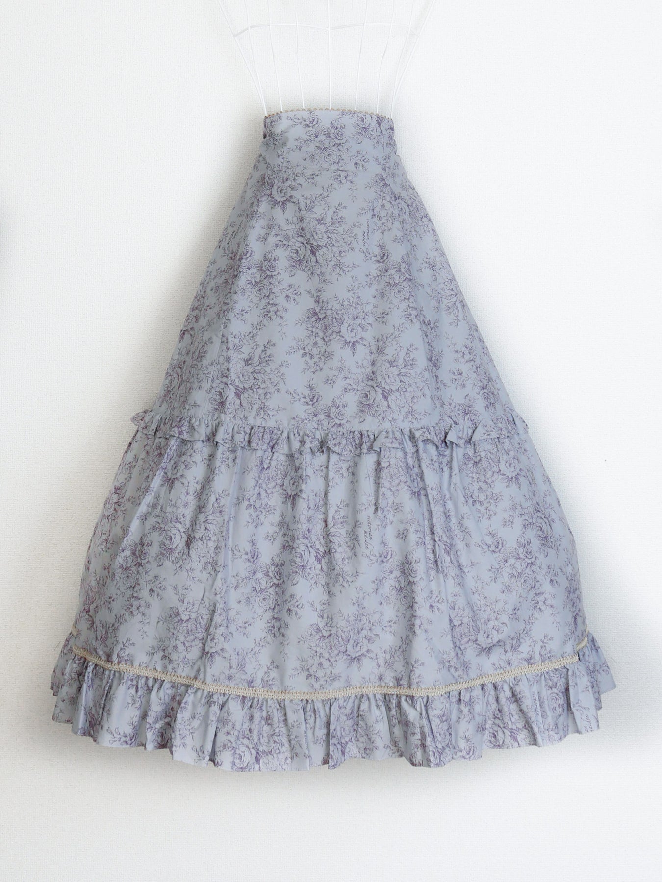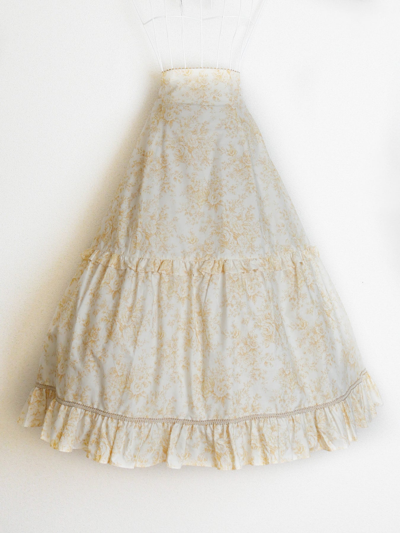 可憐な”フレグランスロココ”柄のオリジナルプリントに二段のフリルとゴールドのブレードが優雅なデザインのスカート。