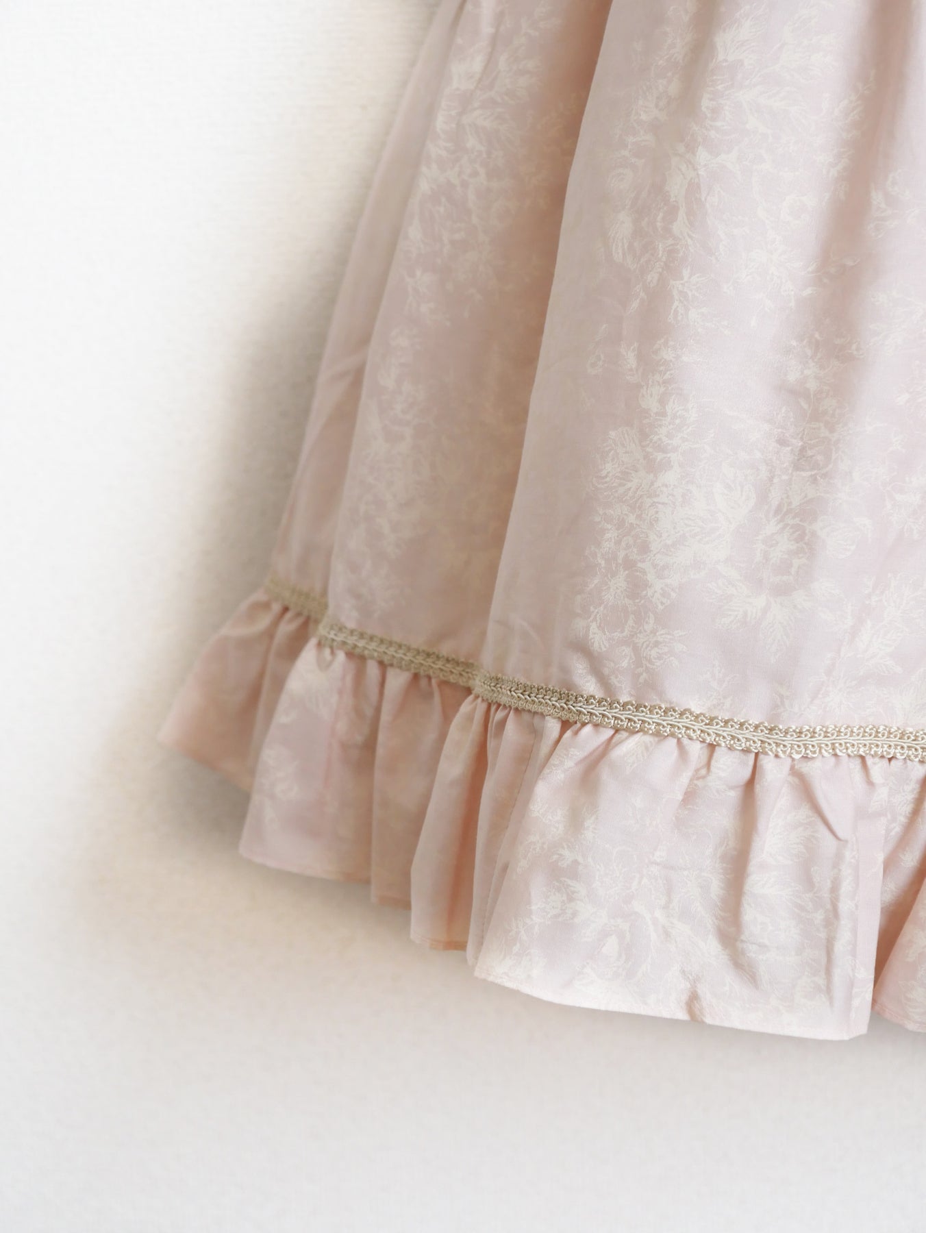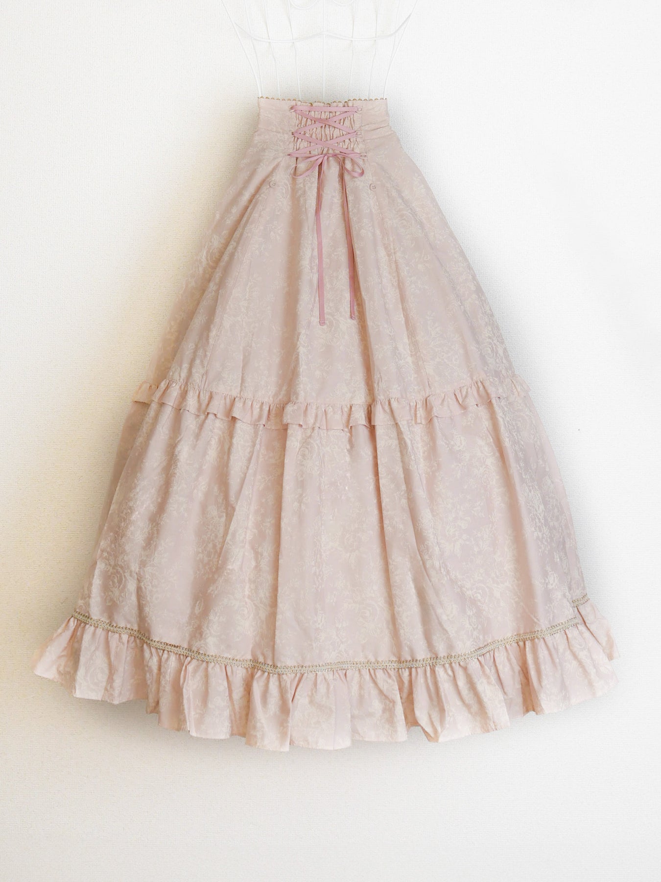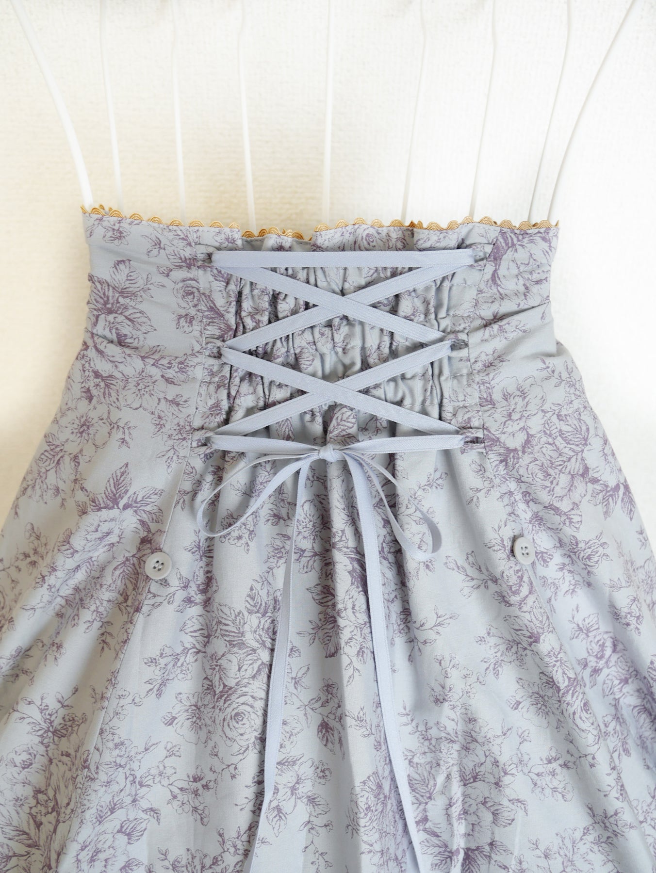 可憐な”フレグランスロココ”柄のオリジナルプリントに二段のフリルとゴールドのブレードが優雅なデザインのスカート。