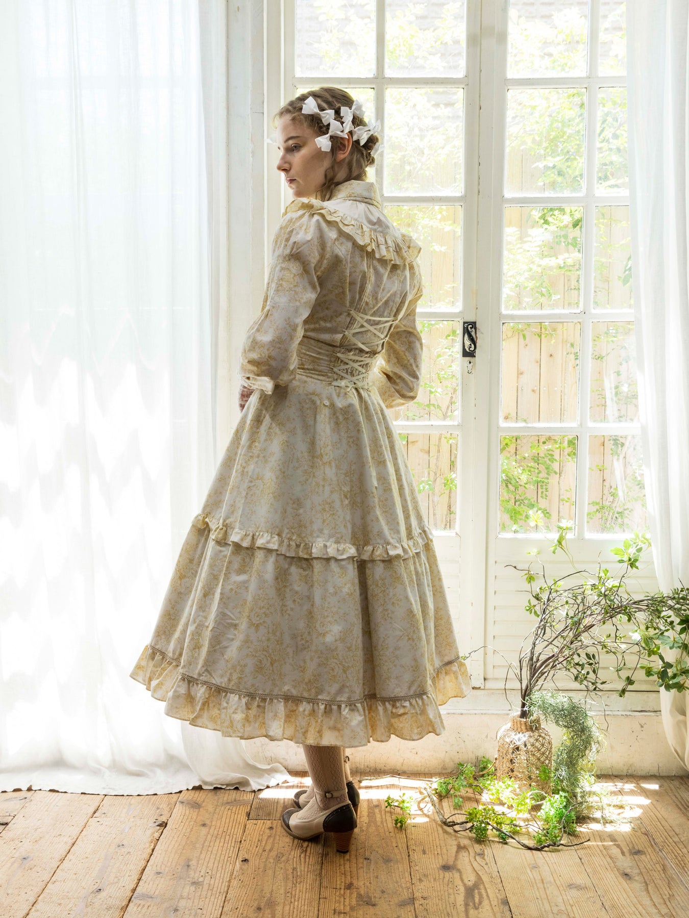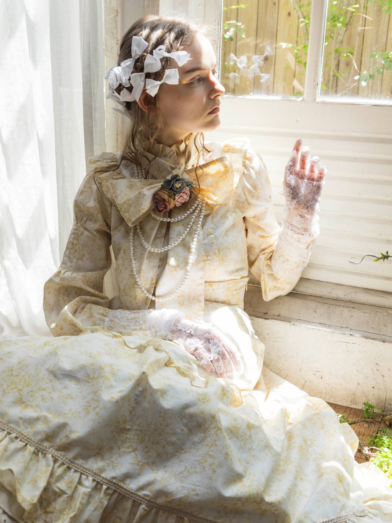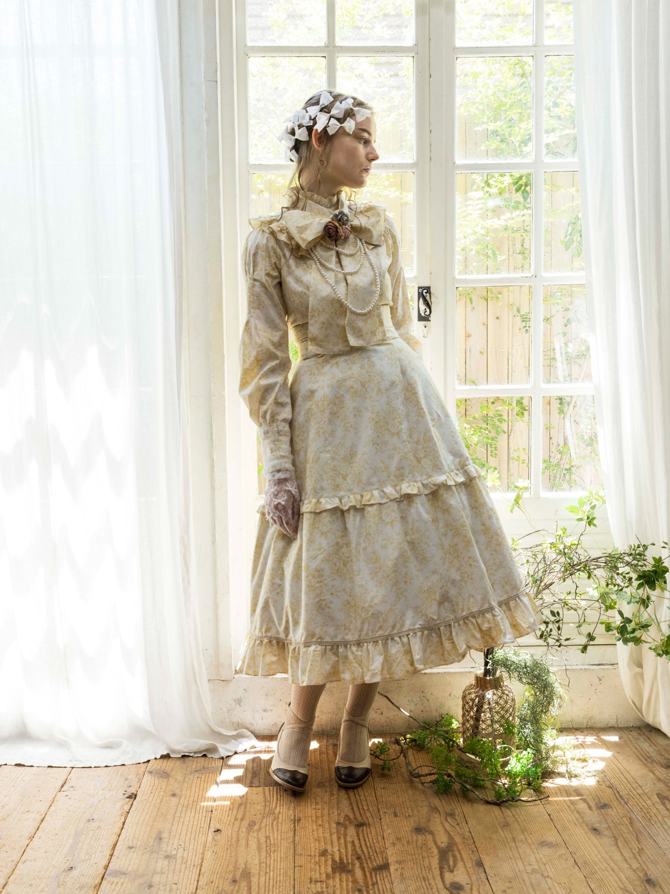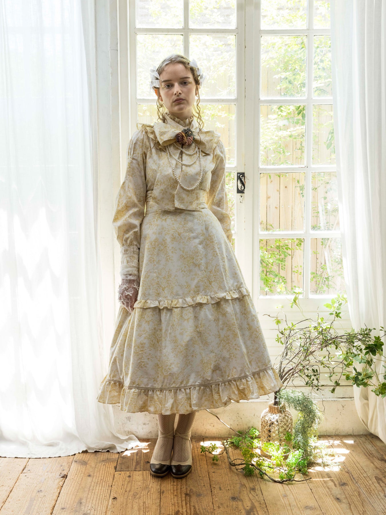 可憐な”フレグランスロココ”柄のオリジナルプリントに二段のフリルとゴールドのブレードが優雅なデザインのスカート。