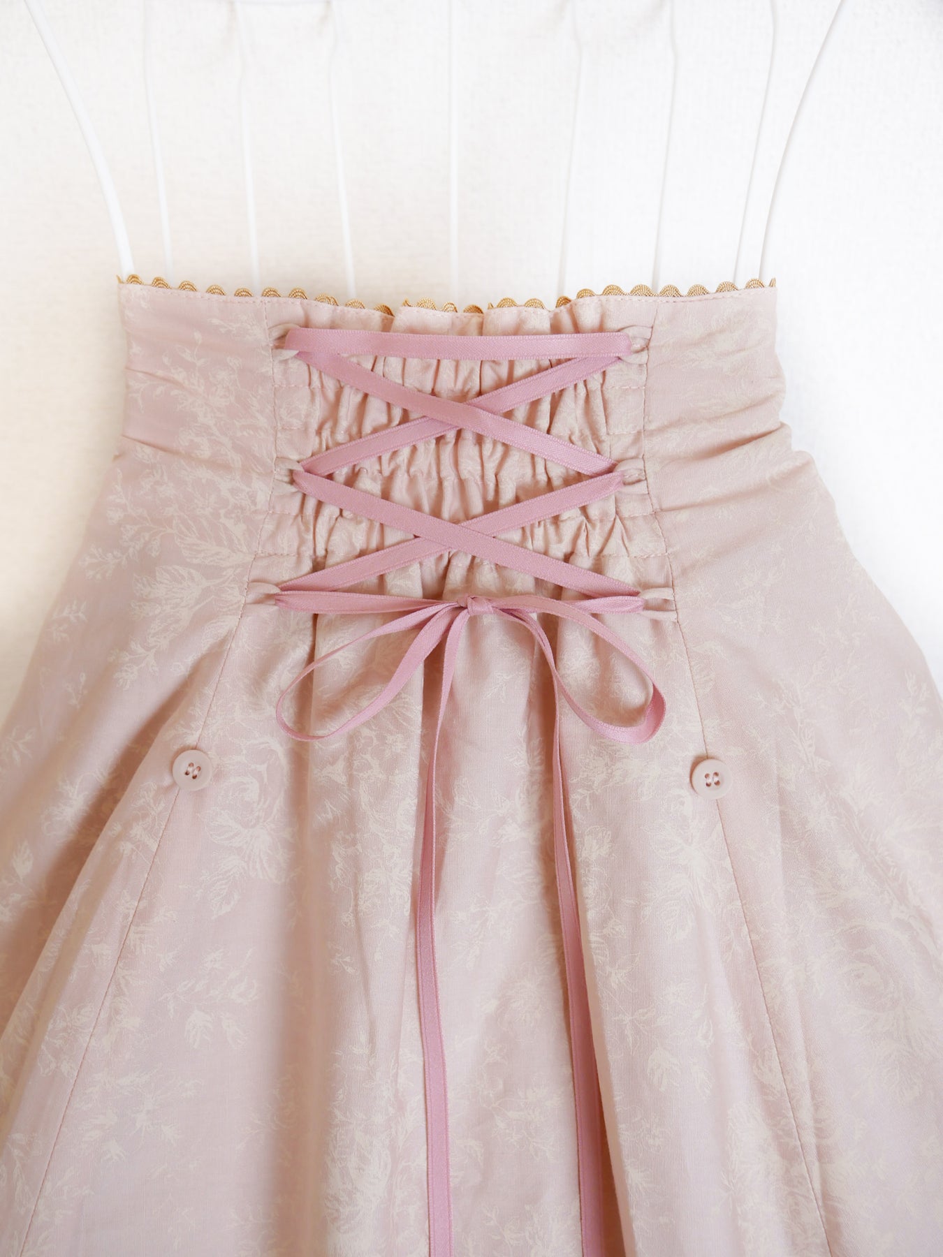 背面はゴムシャーリングされた編上げ仕様になっており、ウェストラインが強調されたハイウエストで美しいシルエットが魅力です。