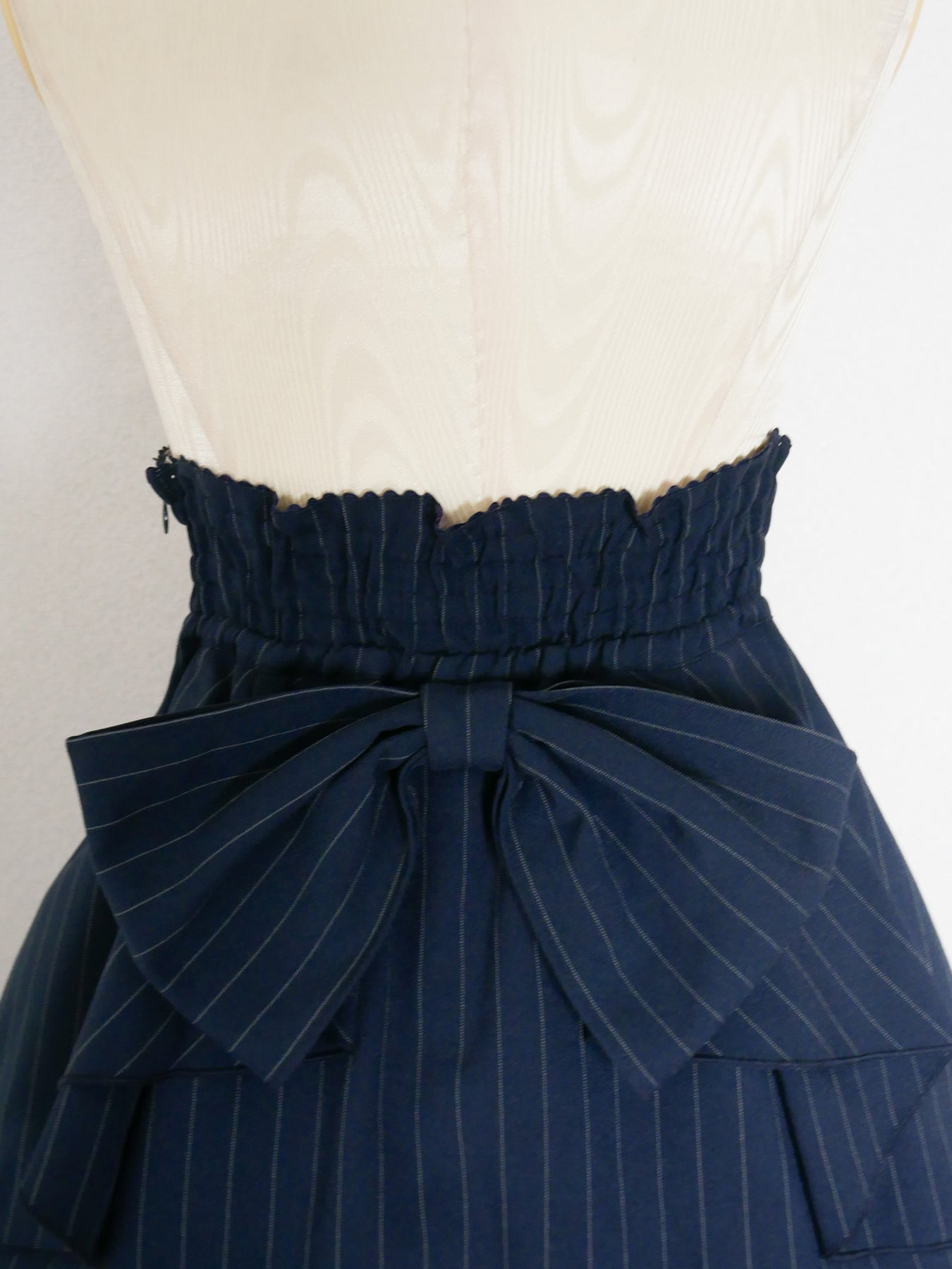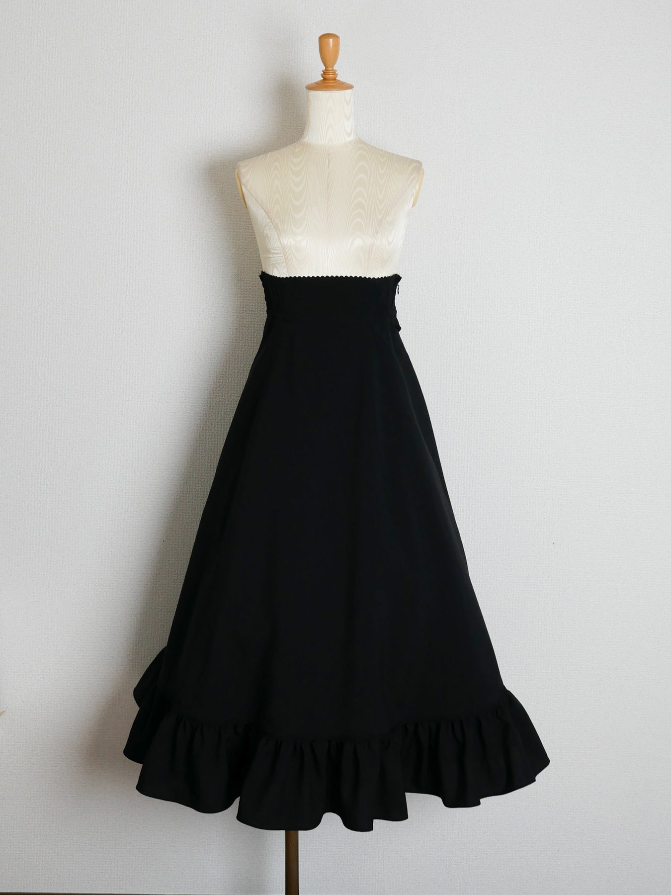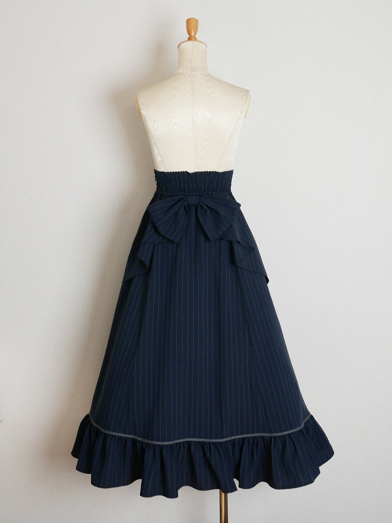 バックスタイルの大きなリボンとラッフルフリルがポイントの、縦のラインが強調された美しいウエストラインを惹き立てるロングスカート。