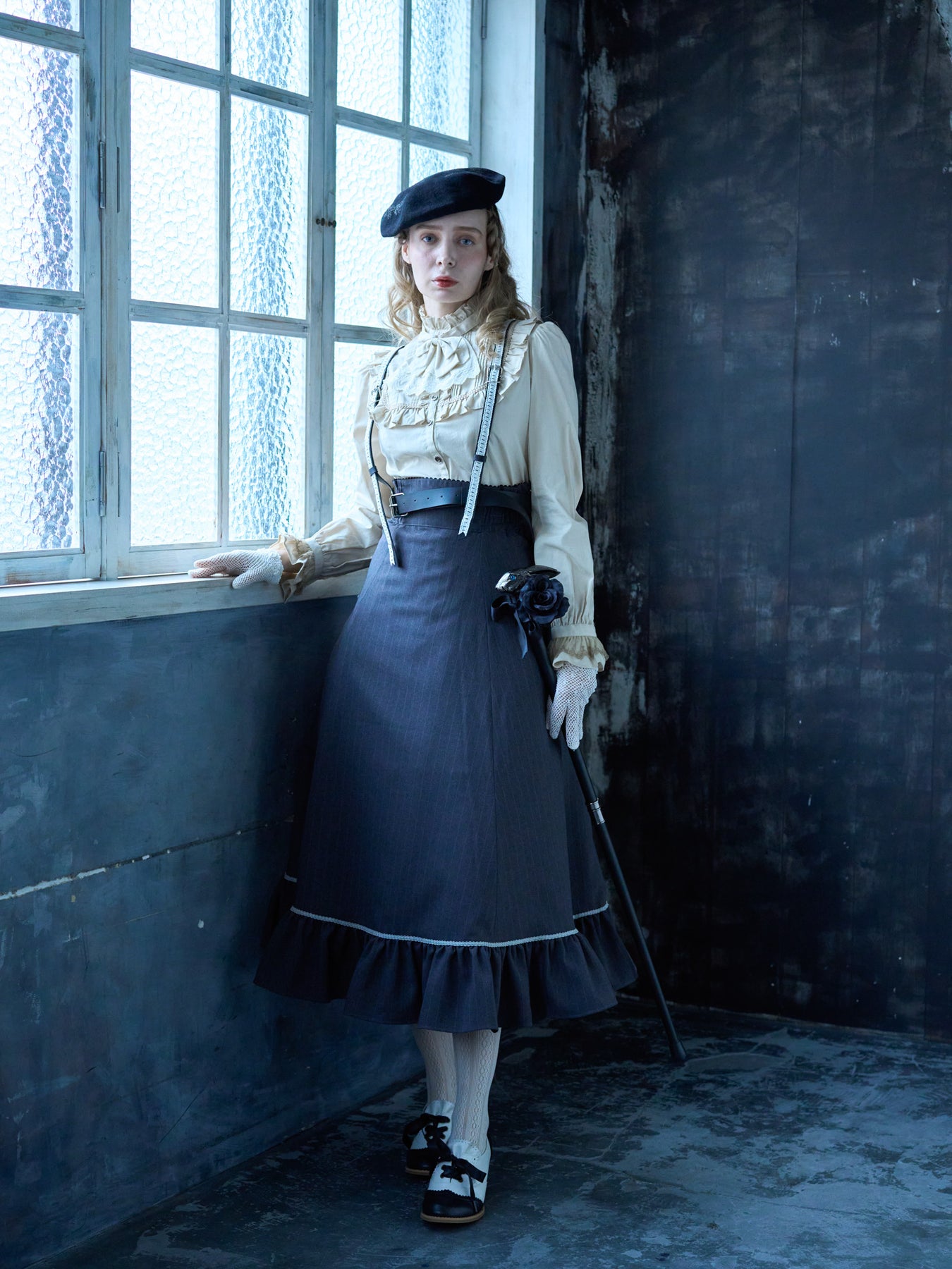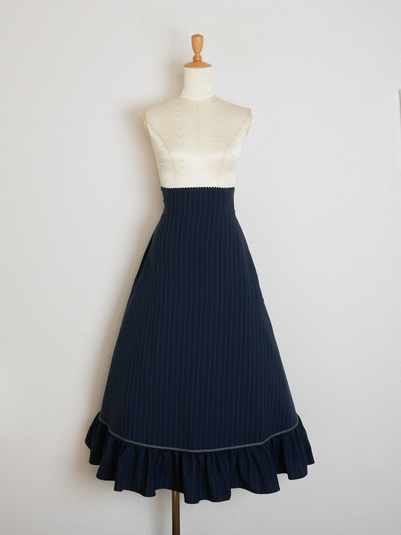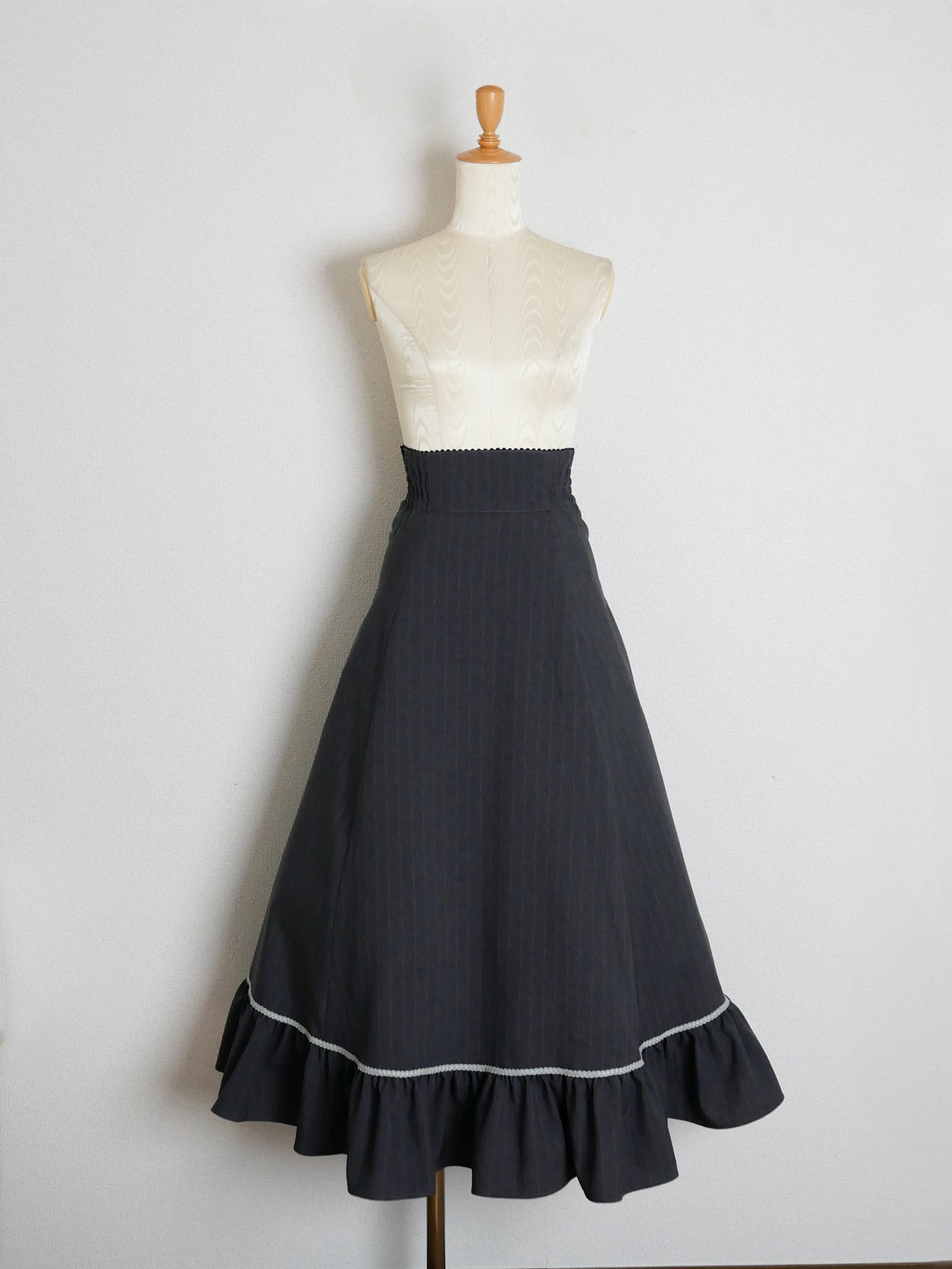 バックスタイルの大きなリボンとラッフルフリルがポイントの、縦のラインが強調された美しいウエストラインを惹き立てるロングスカート。