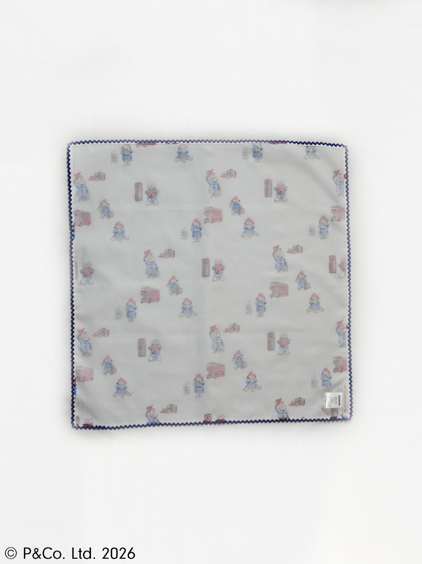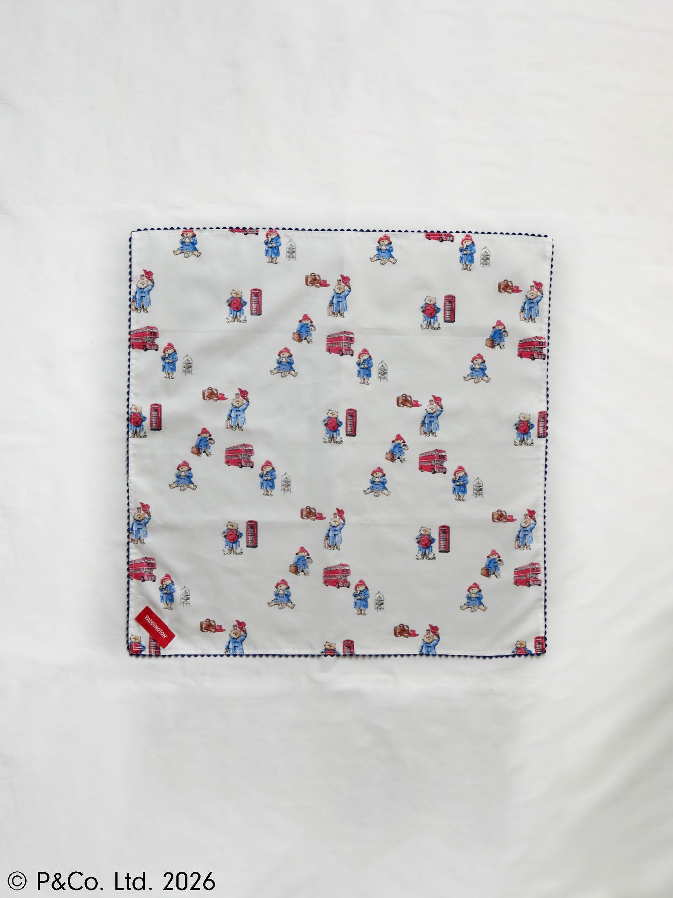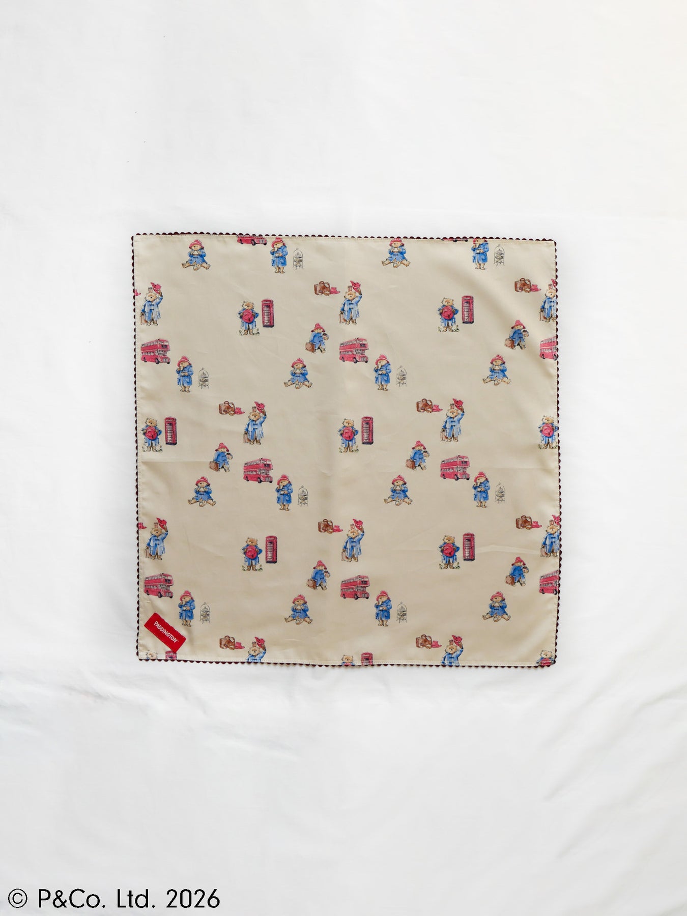 沢山のポーズのパディントンとロンドンモチーフが散りばめられたオリジナルテキスタイルを使用した、英国の余韻を添える大判スカーフ。