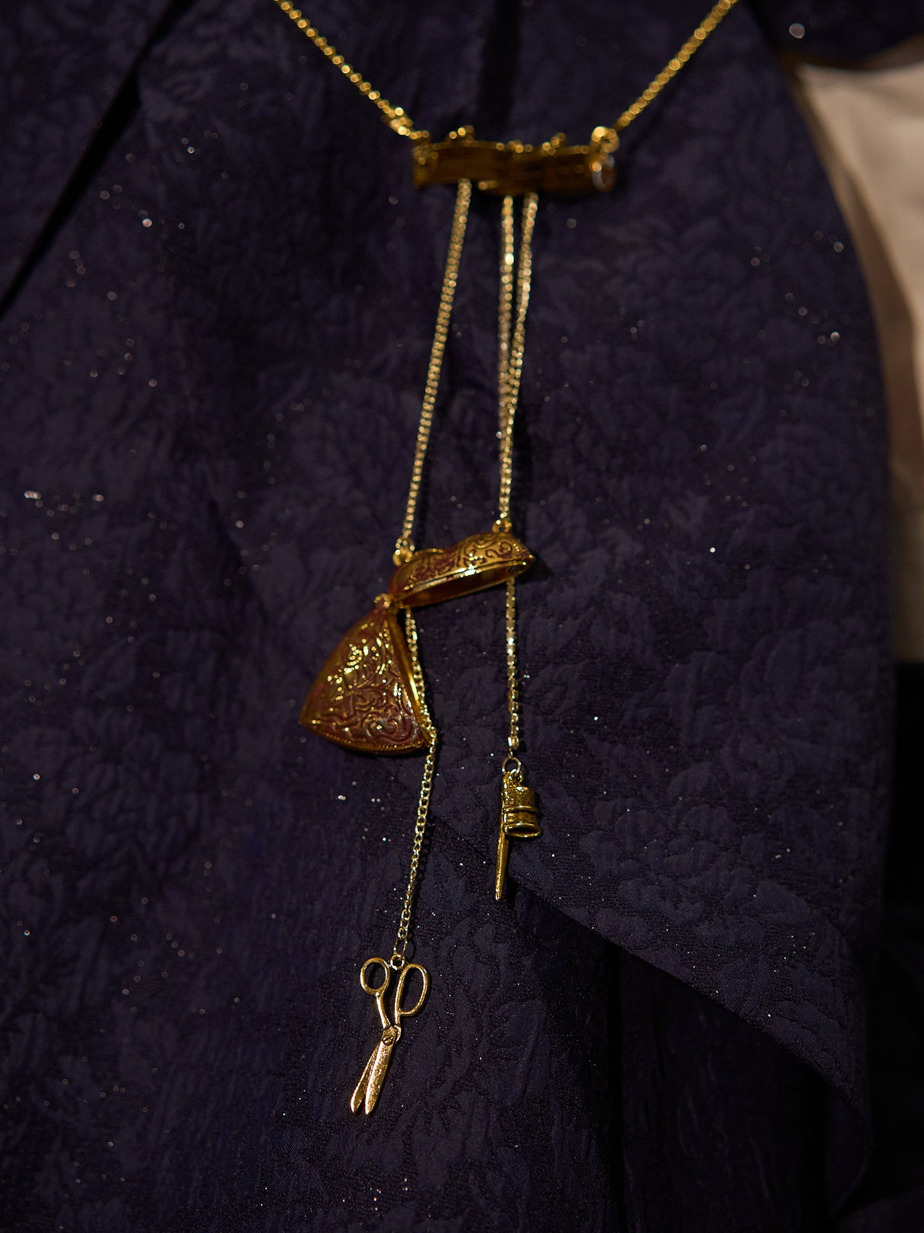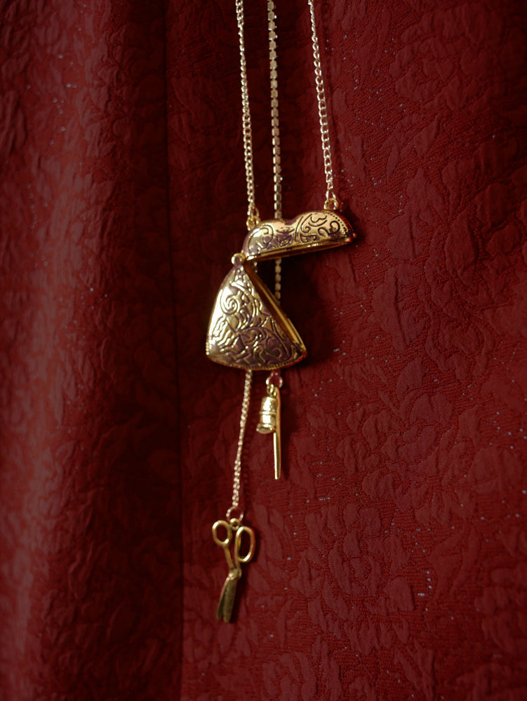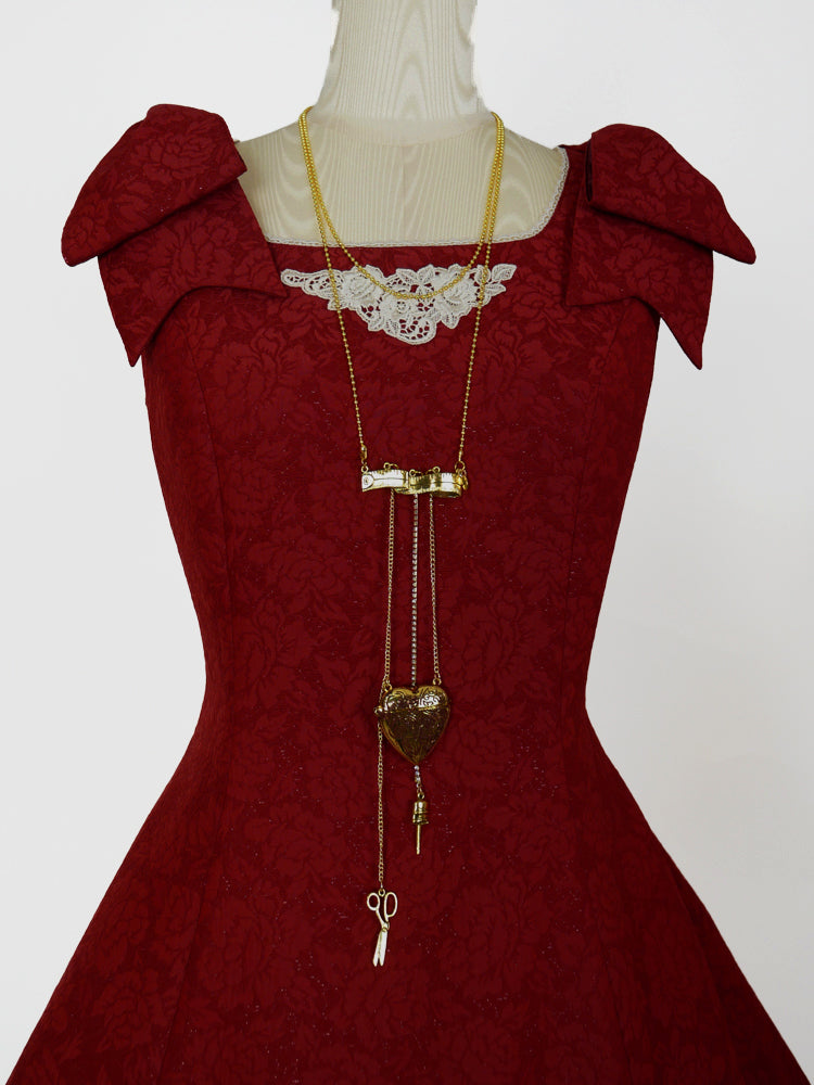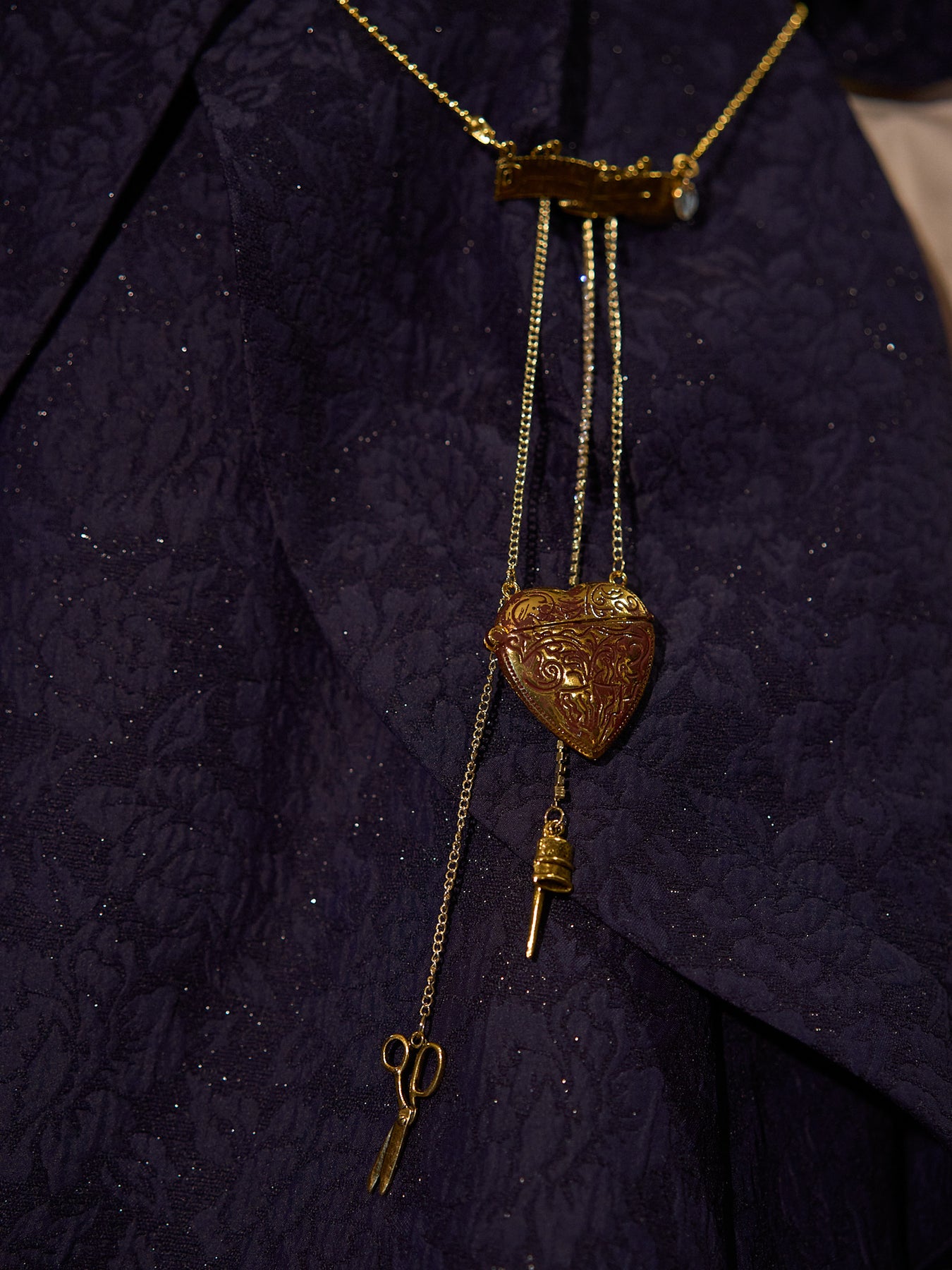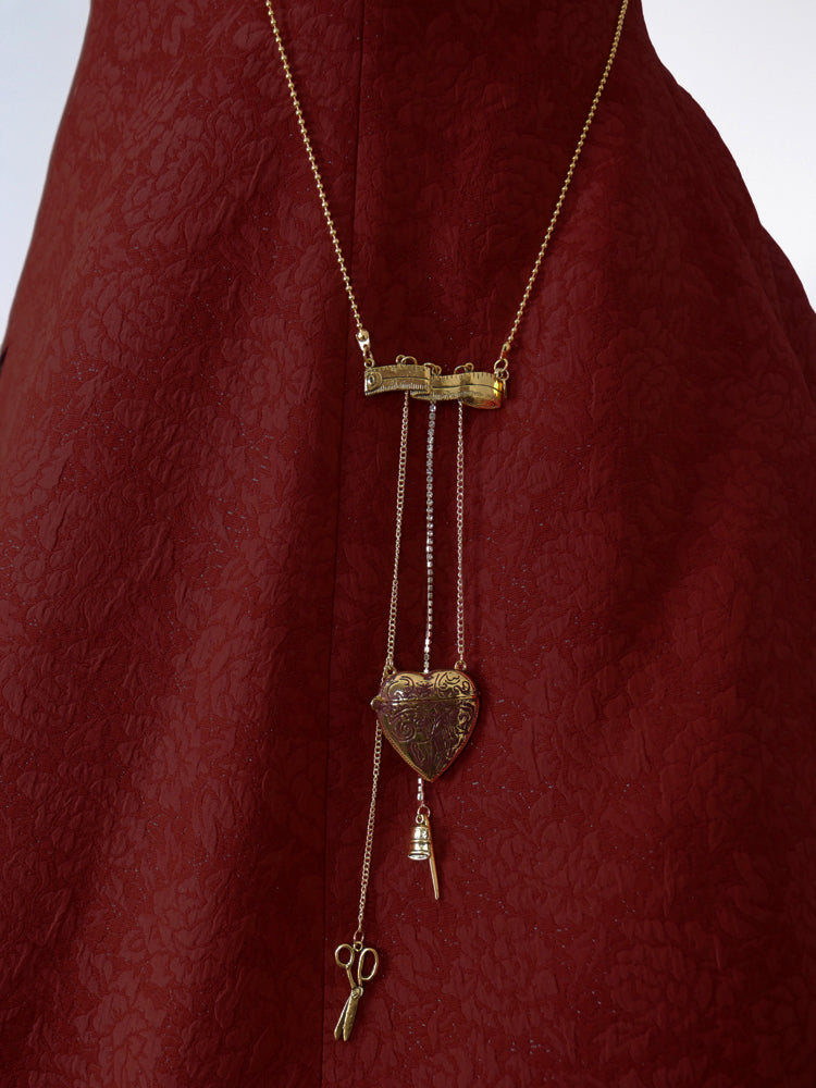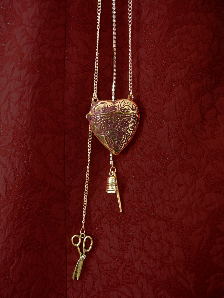 メジャー、ハサミ、指ぬき、針、Vmロゴなどのゴールドチャームとダークボルドーの炭付の大きめなハート。