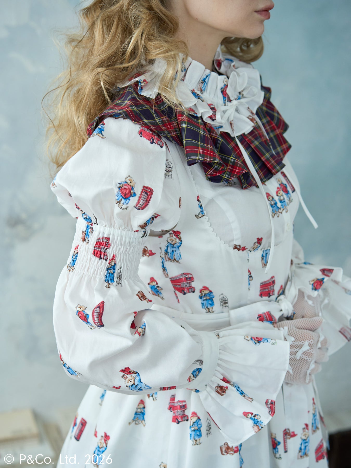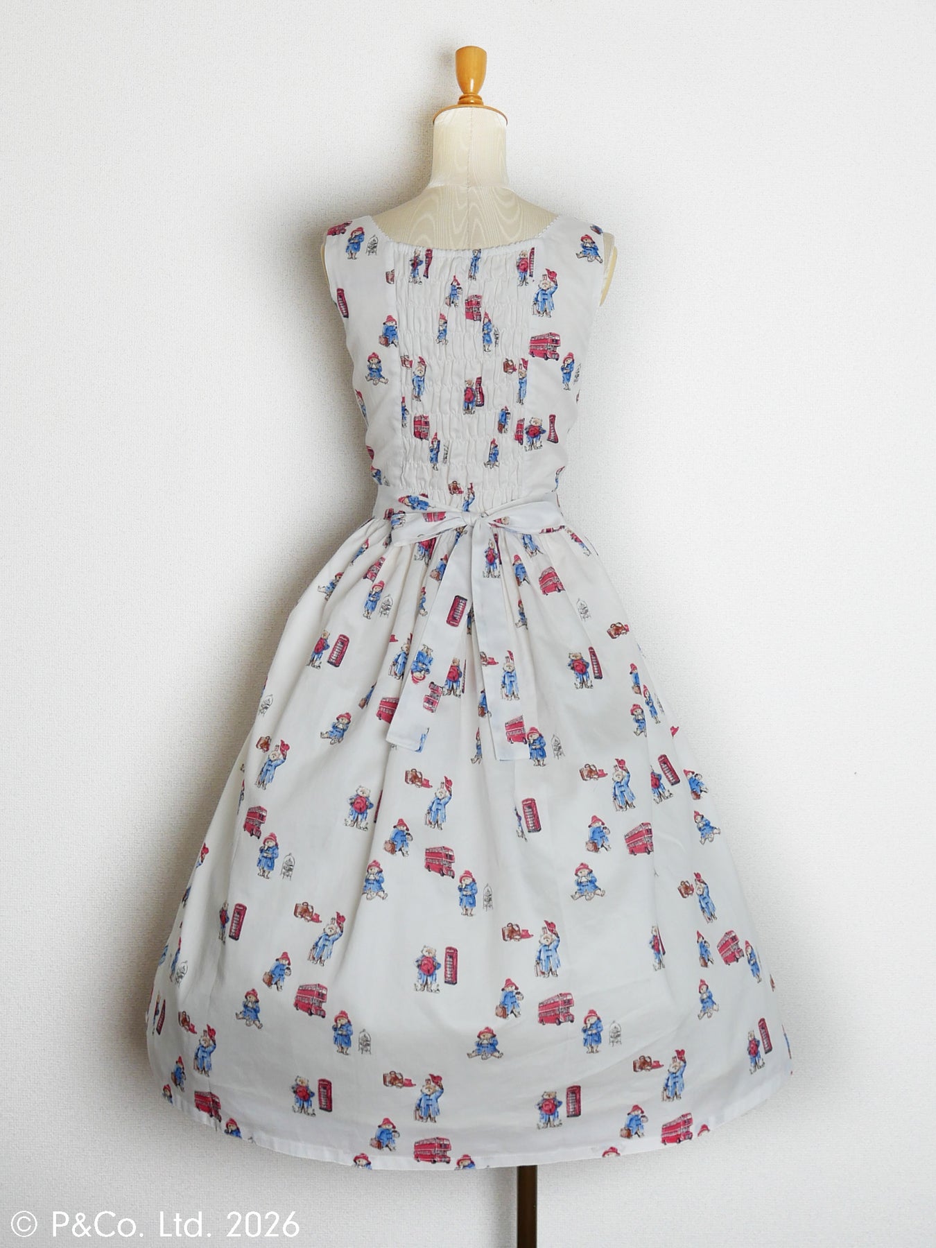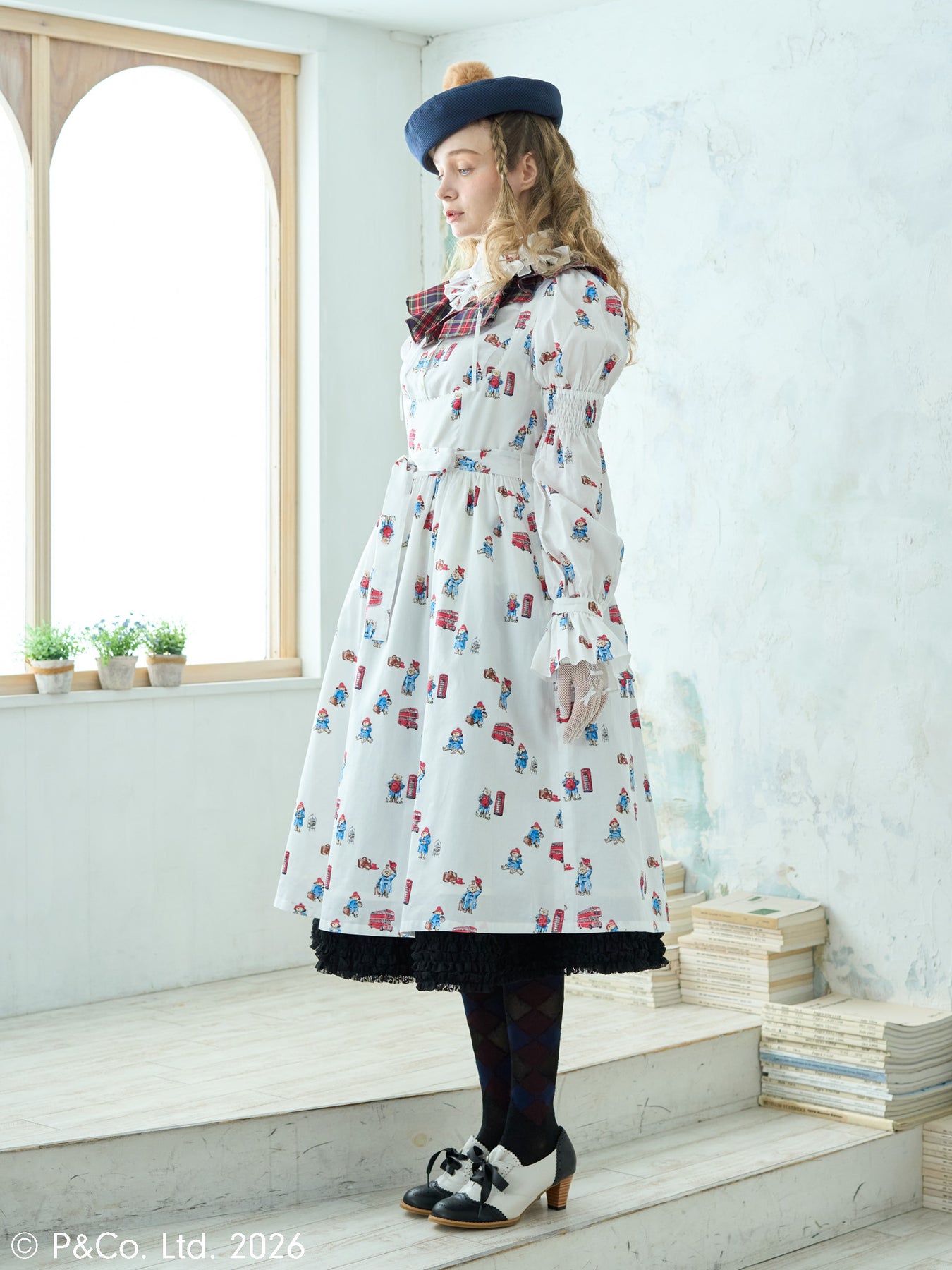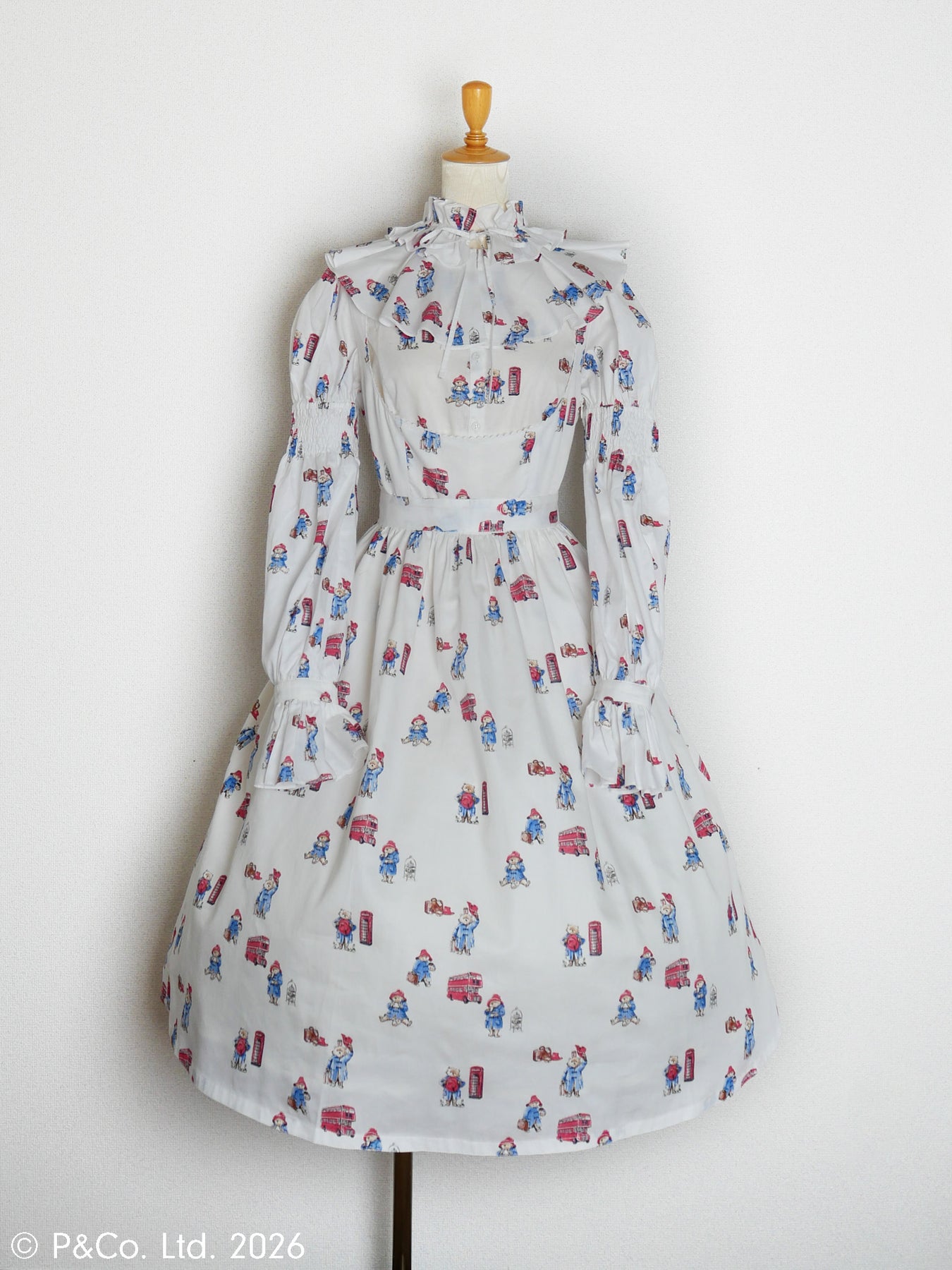 沢山のポーズのパディントンとロンドンモチーフが散りばめられたオリジナルテキスタイルを使用した、大きく開いた胸元が印象的な、Victorian maidenならではのエプロンドレス。
