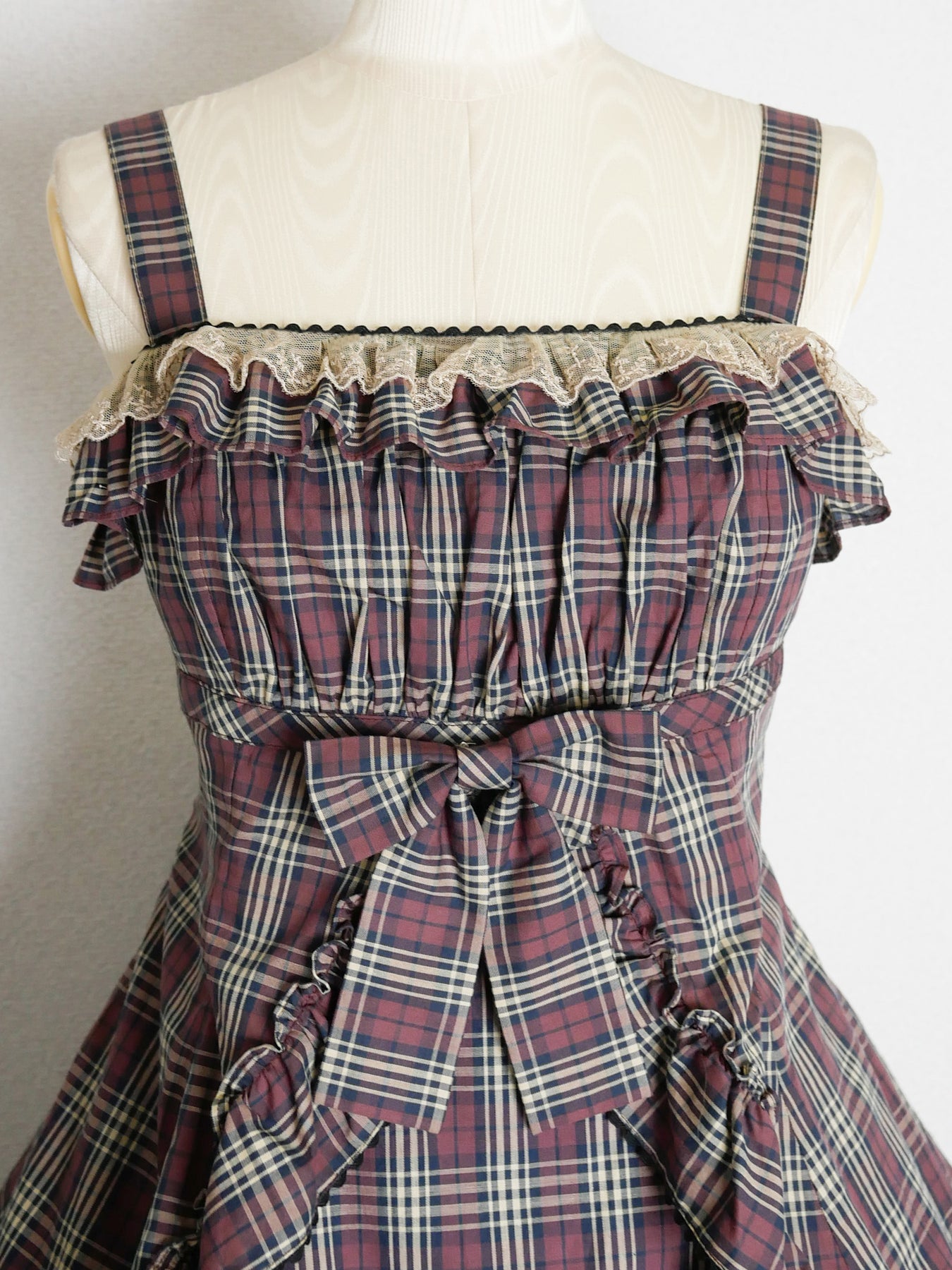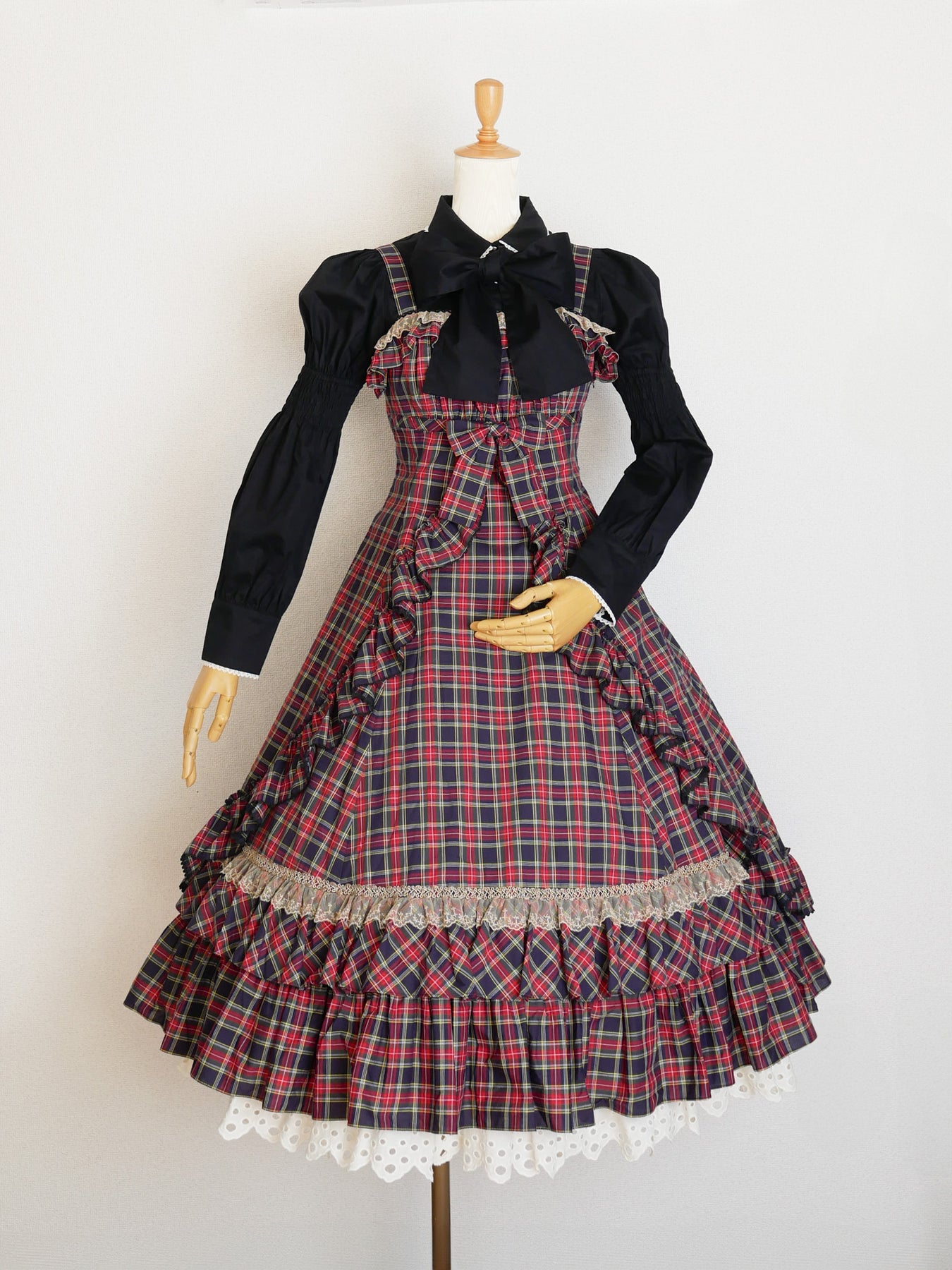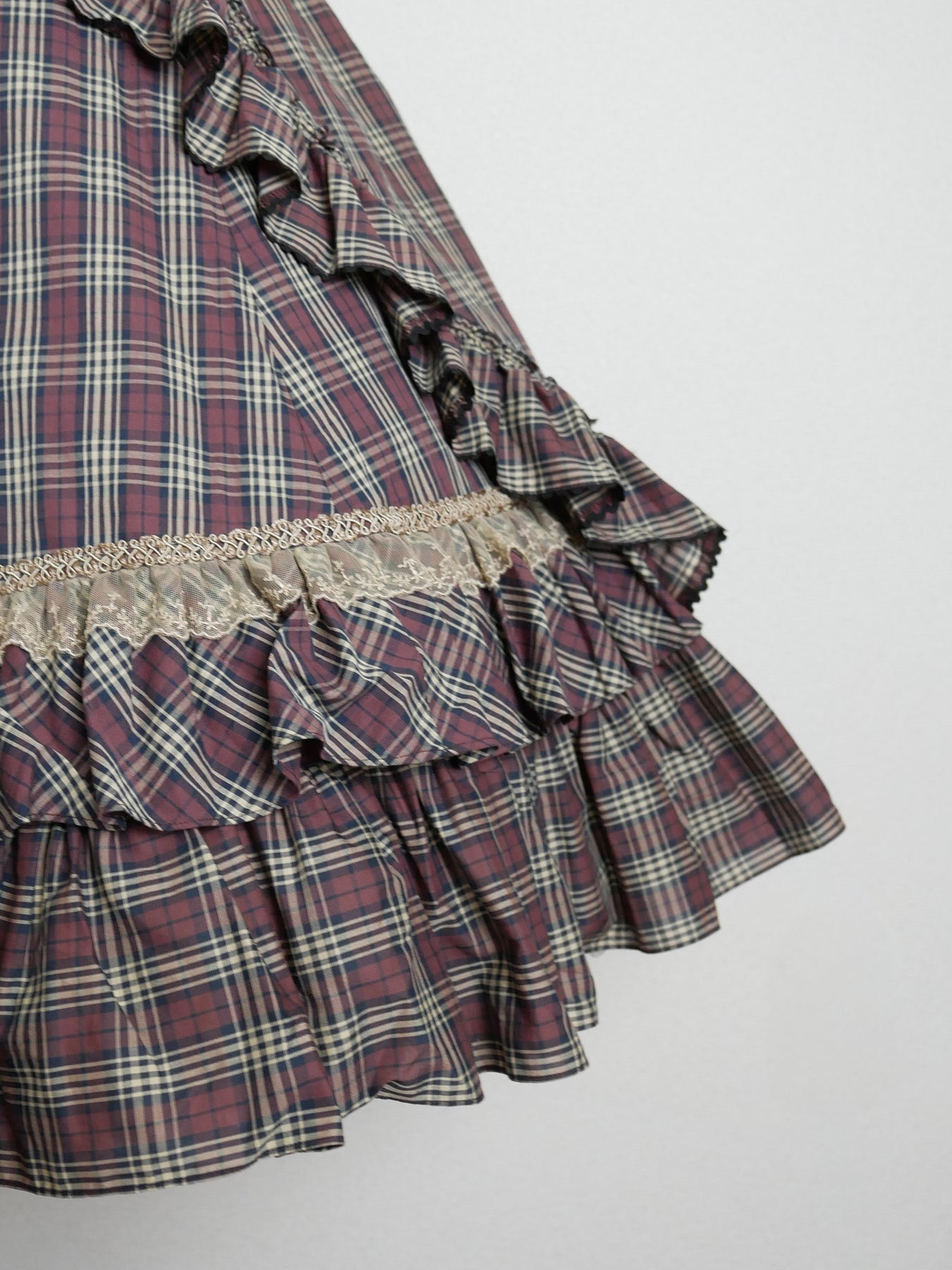 フロント部分にボリュームたっぷりのフリルをあしらった定番型ともいえるフリルジャンスカ型を、大人っぽいクラッシックな色調のタータンチェック柄で控えめな可愛らしいニュアンスに。