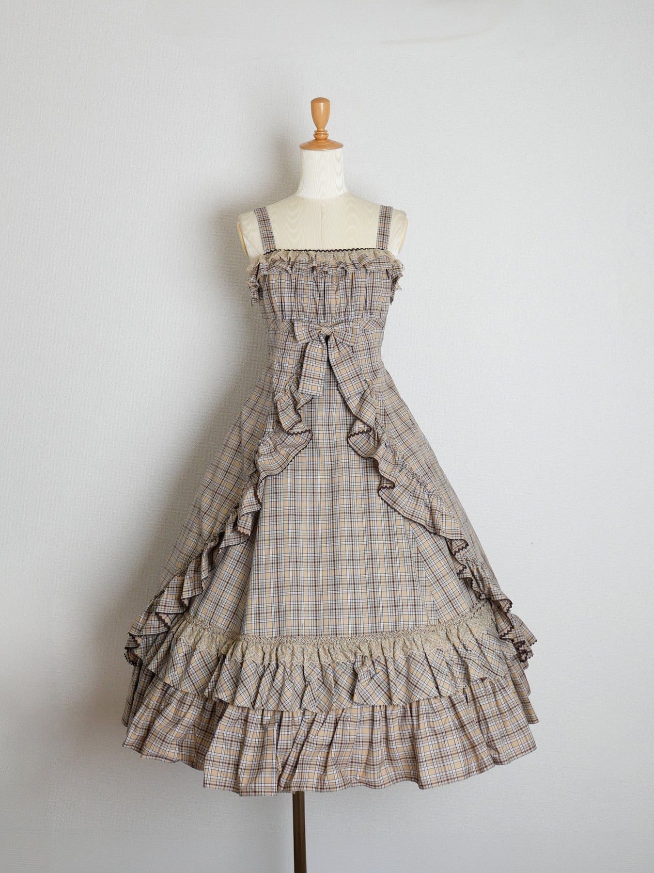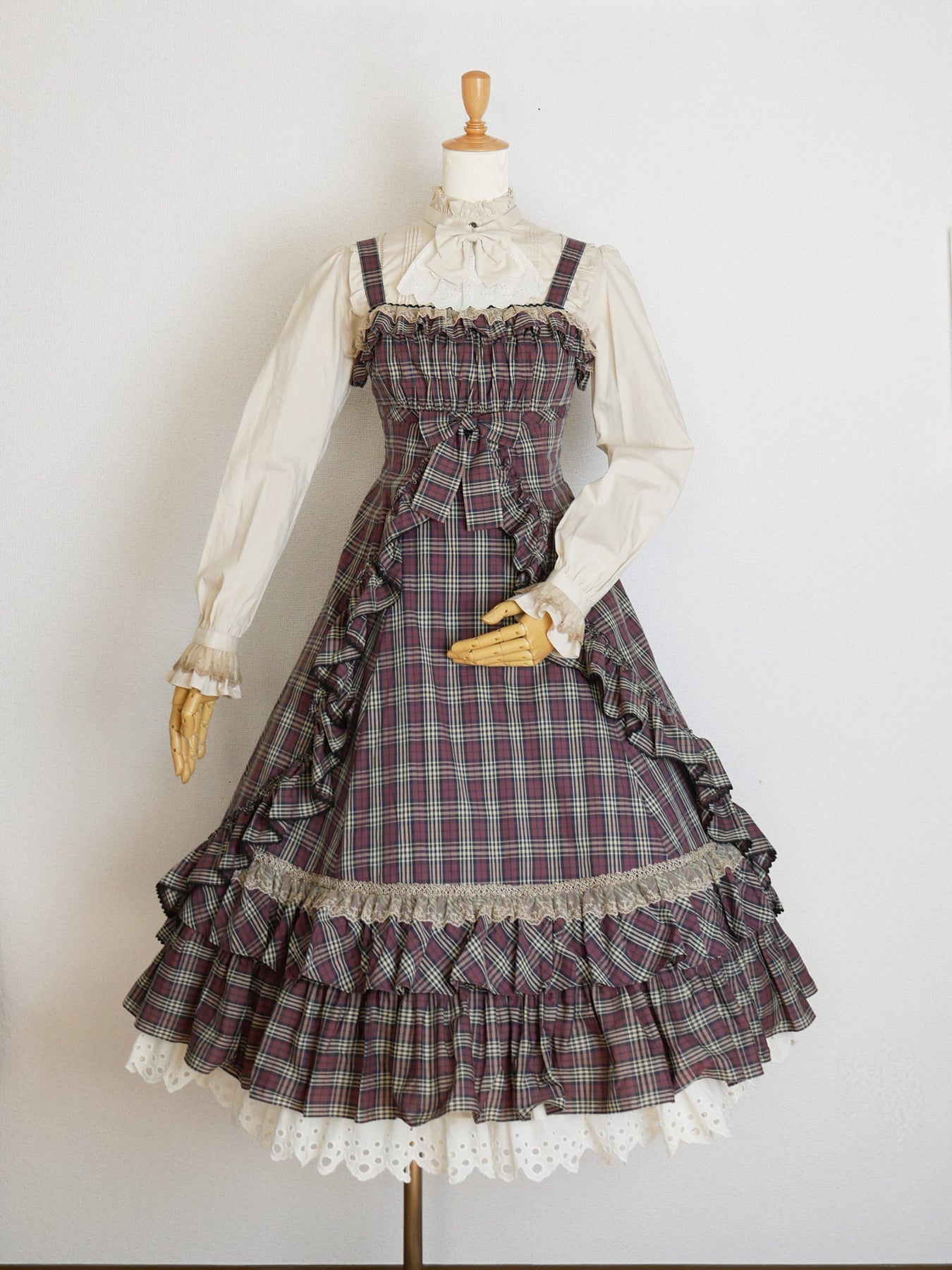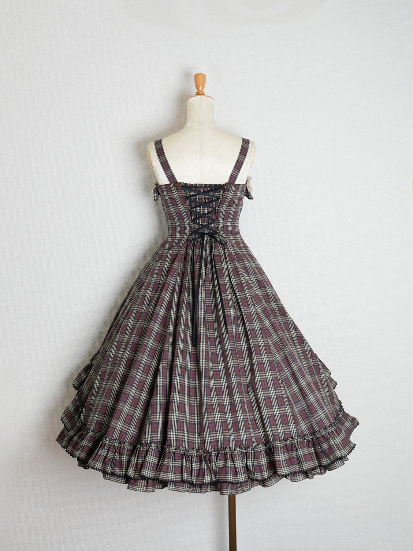 フロント部分にボリュームたっぷりのフリルをあしらった定番型ともいえるフリルジャンスカ型を、大人っぽいクラッシックな色調のタータンチェック柄で控えめな可愛らしいニュアンスに。