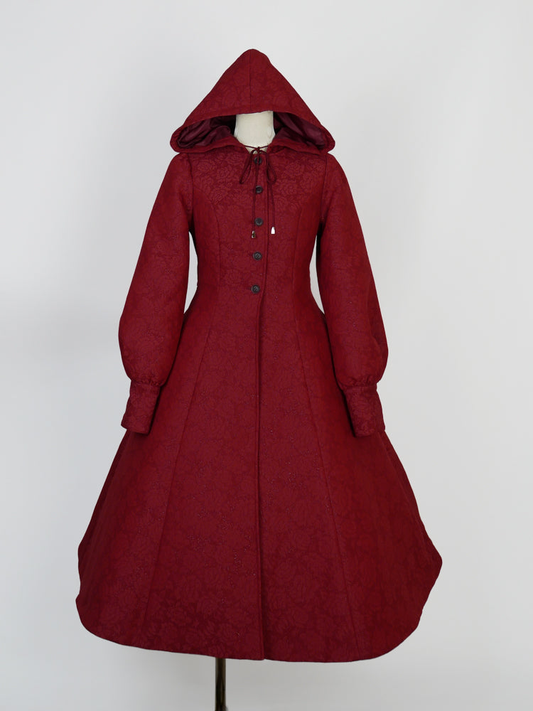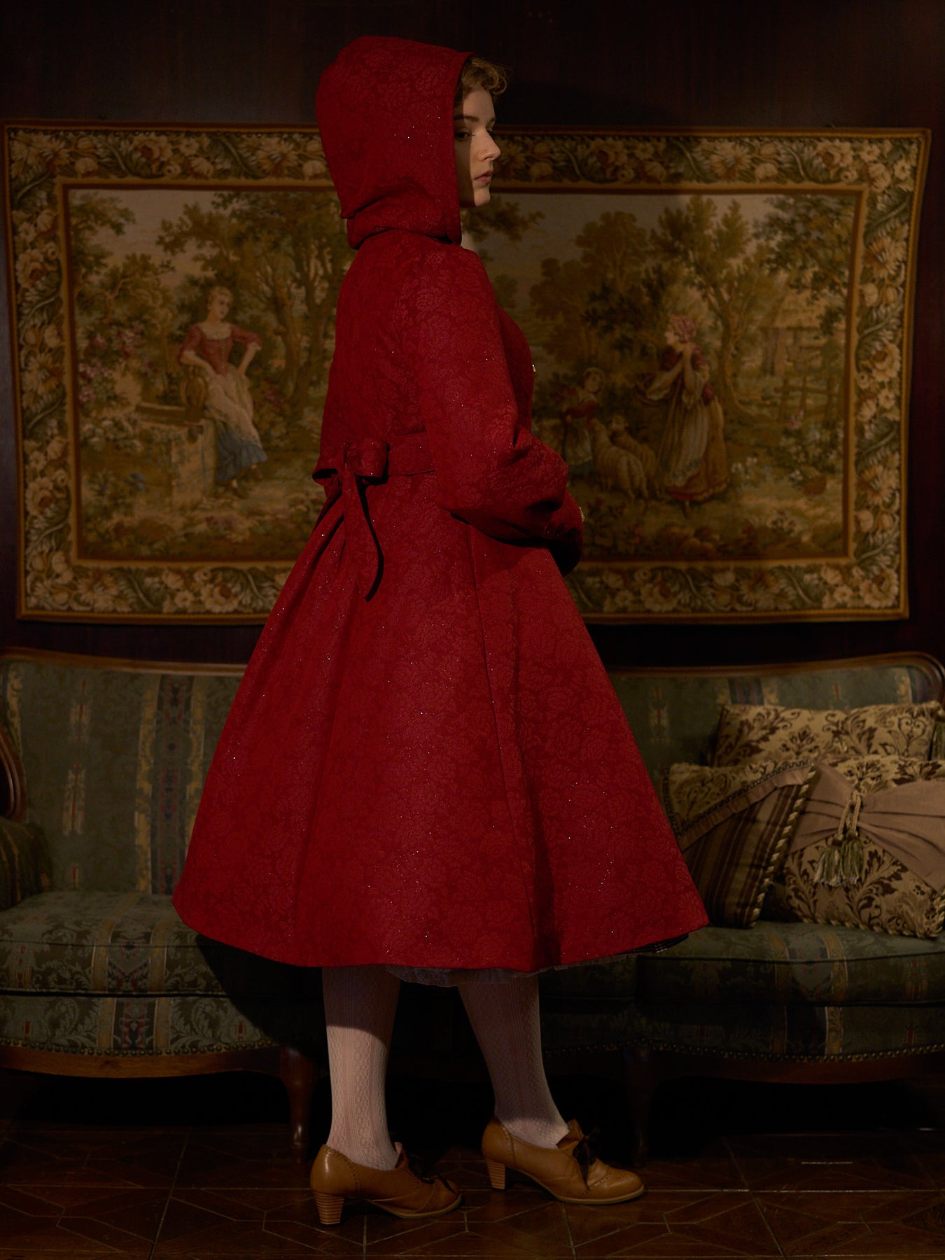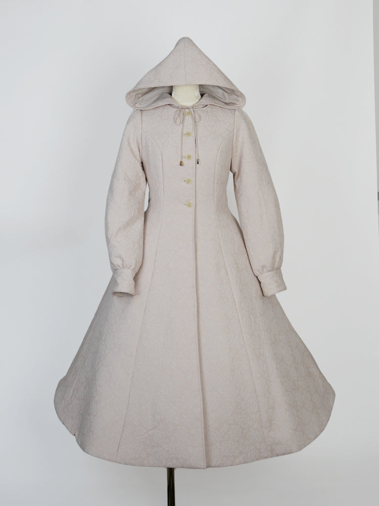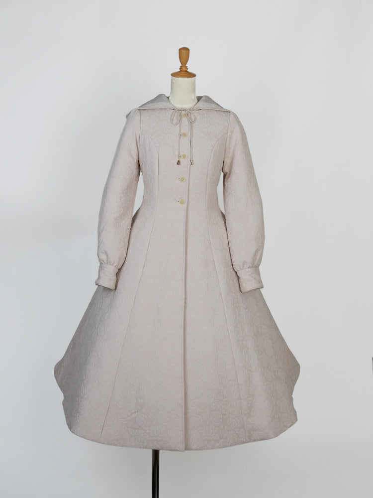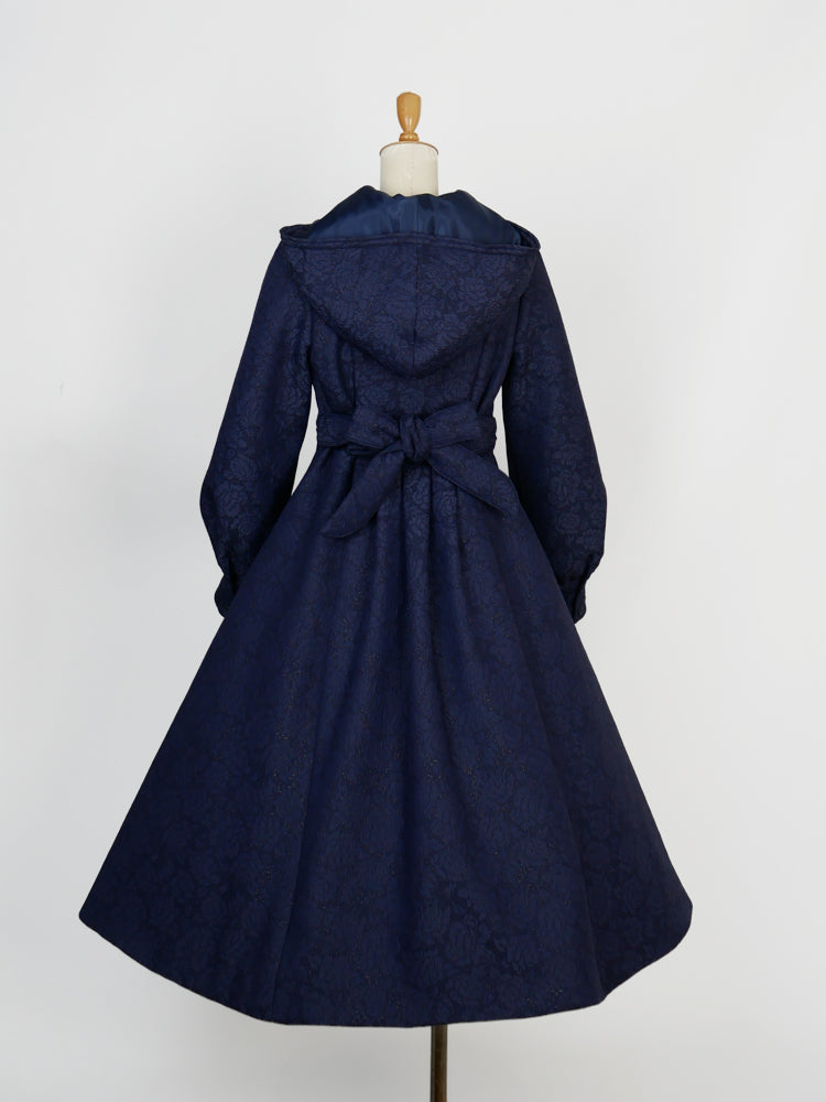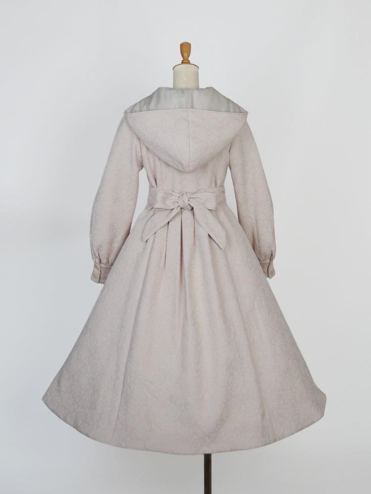 童話の主人公から着想してデザインした取り外し可能な大きなフードは、ファンタジームードを漂わせ、たっぷりとした蹴回しのドレスのようなロングコート。