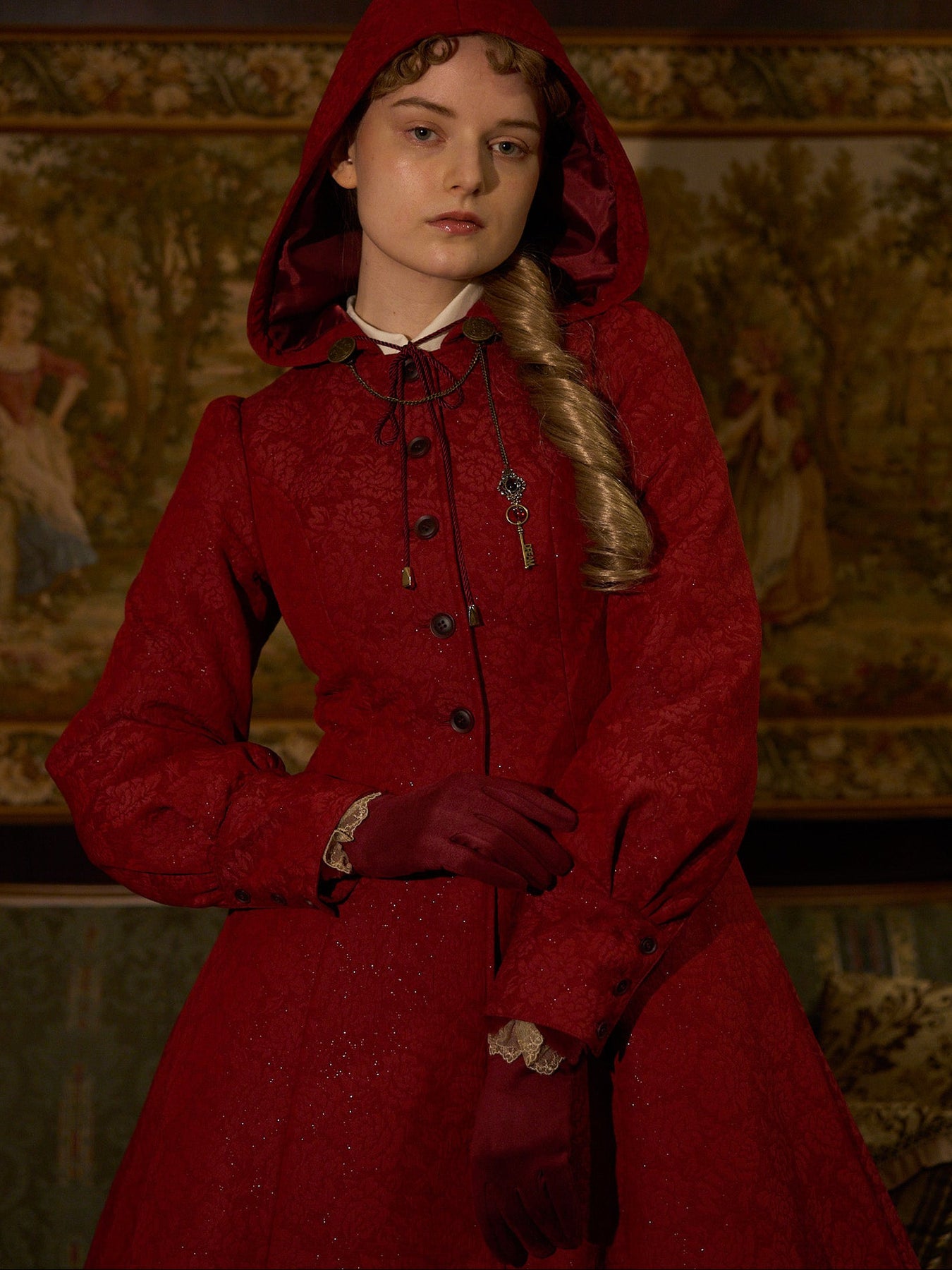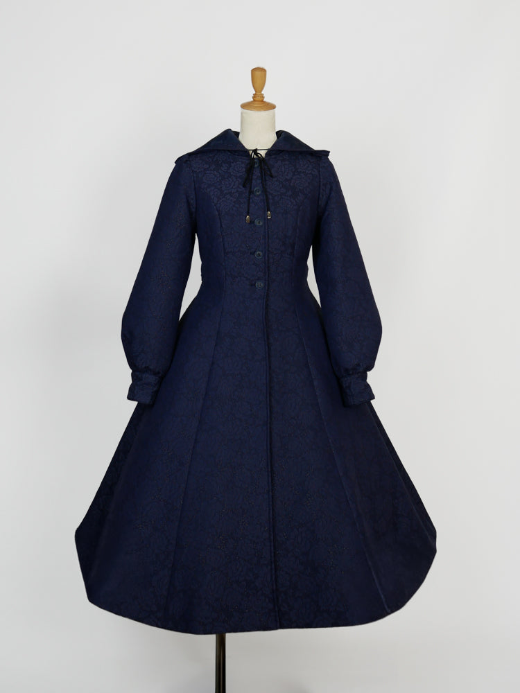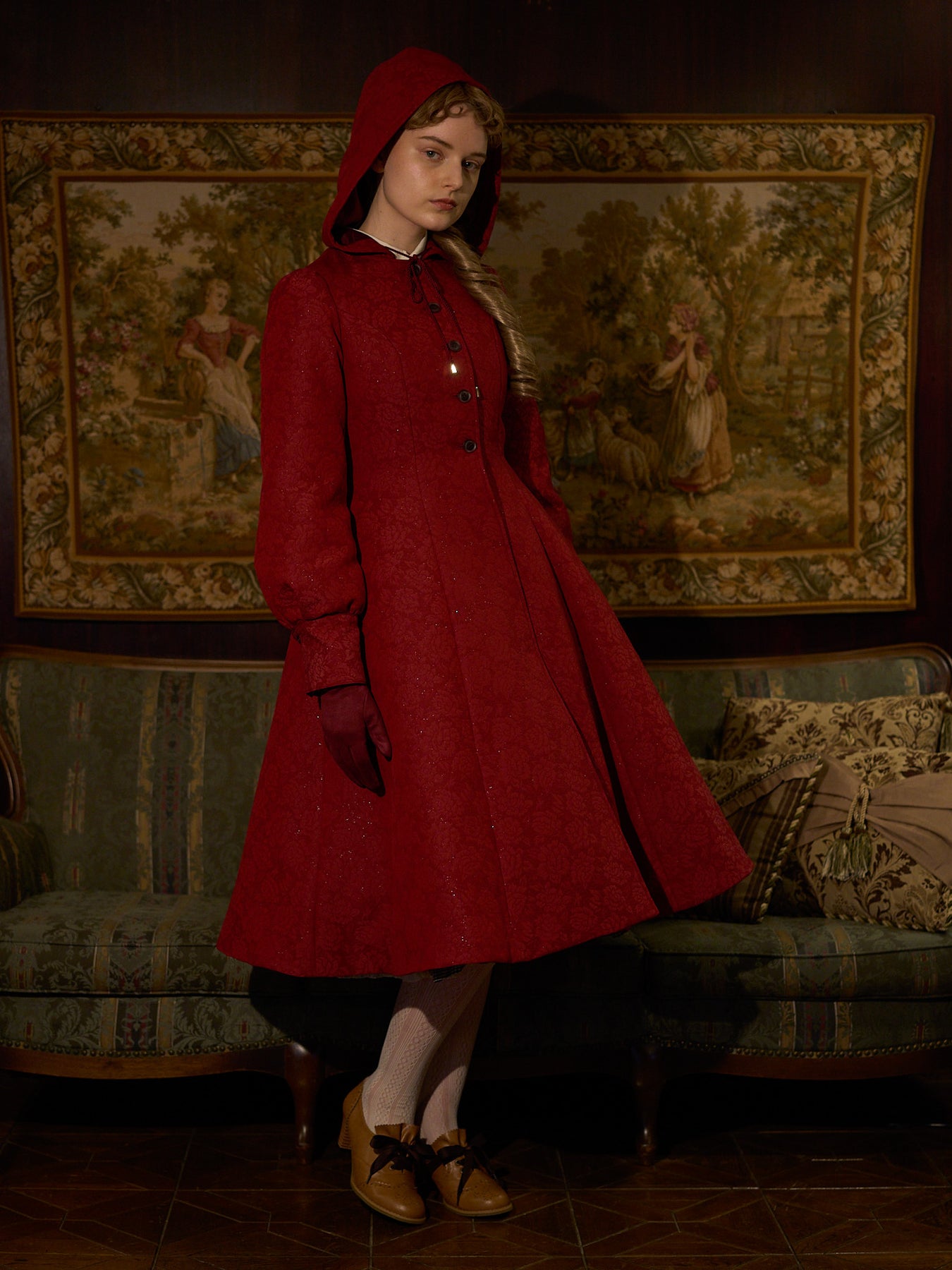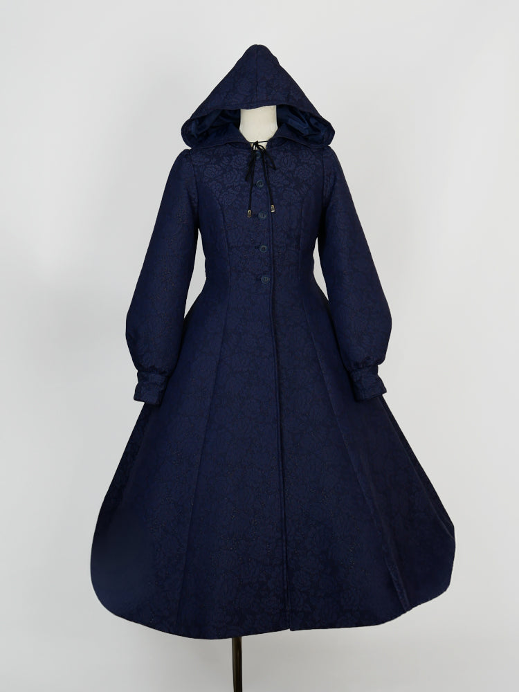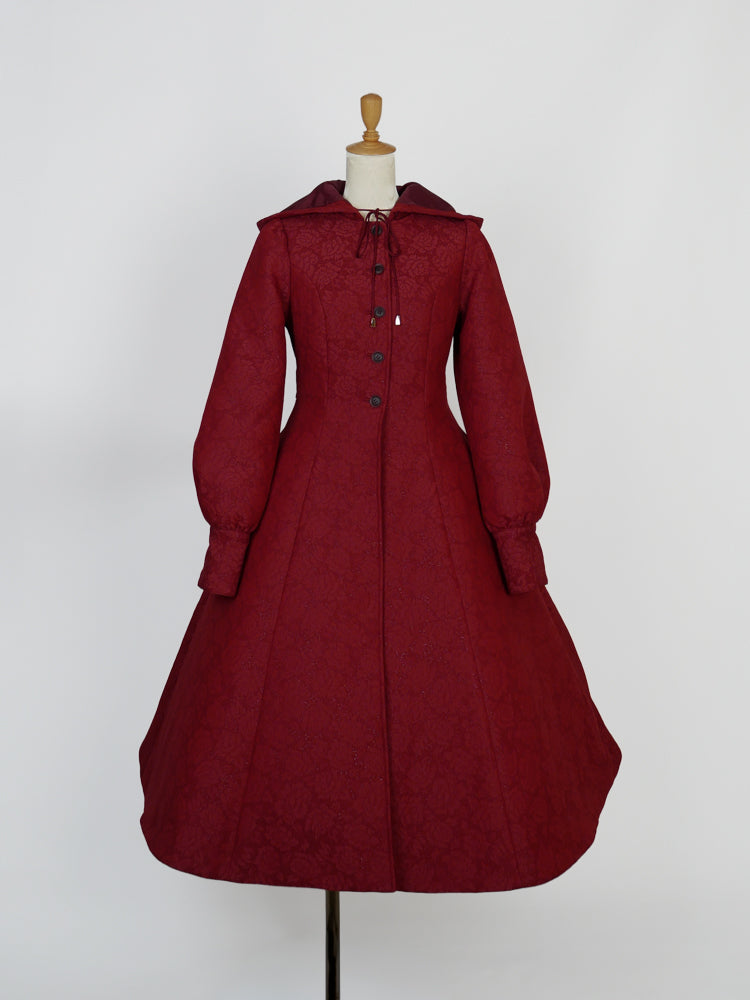 童話の主人公から着想してデザインした取り外し可能な大きなフードは、ファンタジームードを漂わせ、たっぷりとした蹴回しのドレスのようなロングコート。