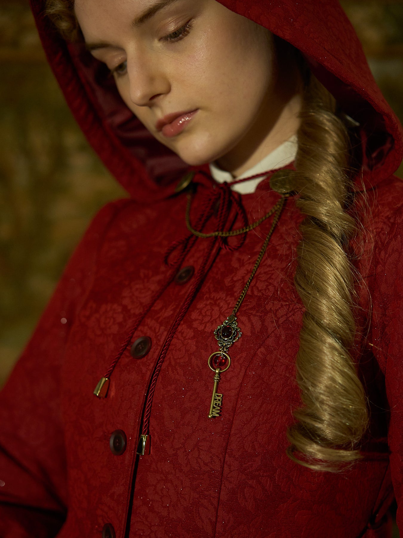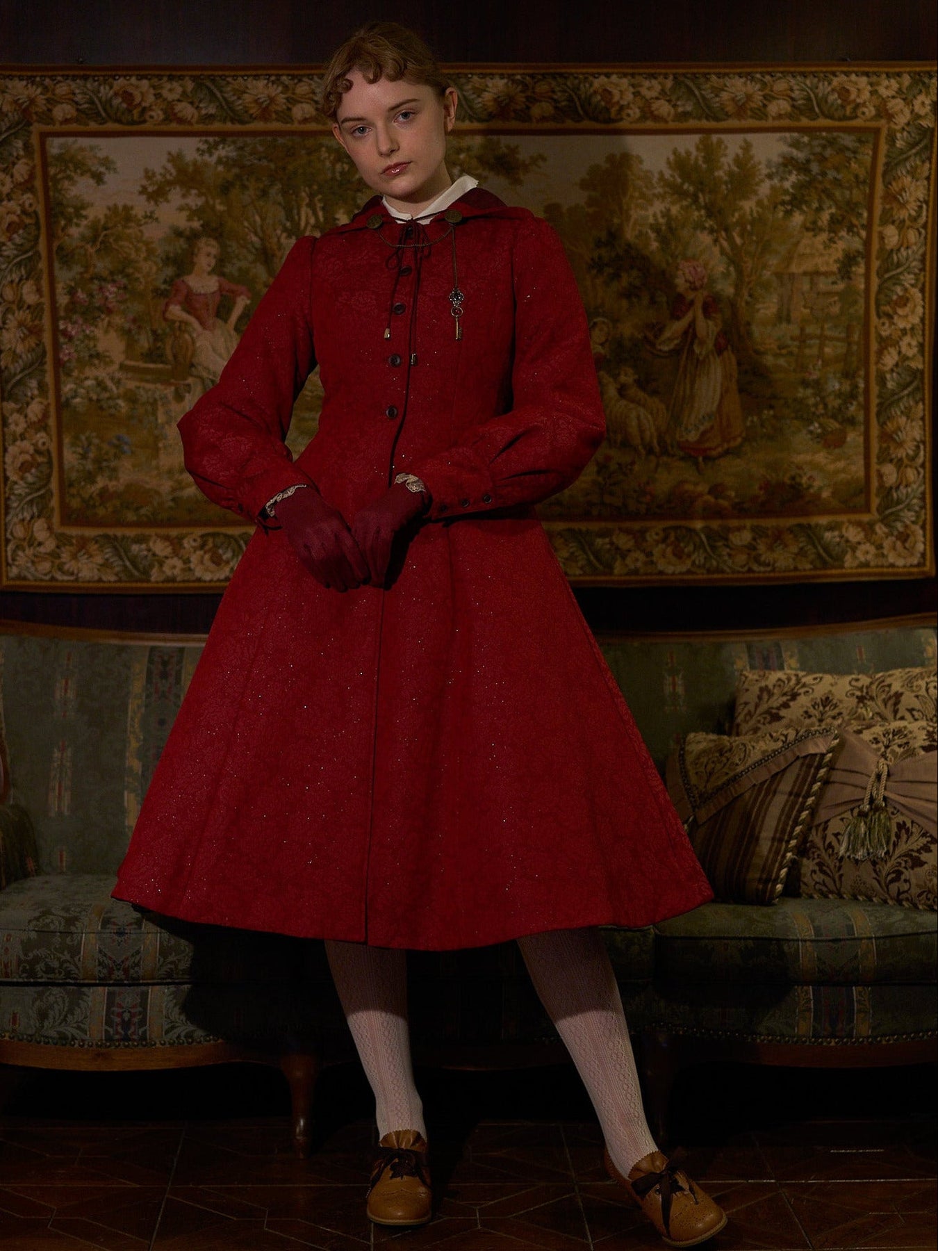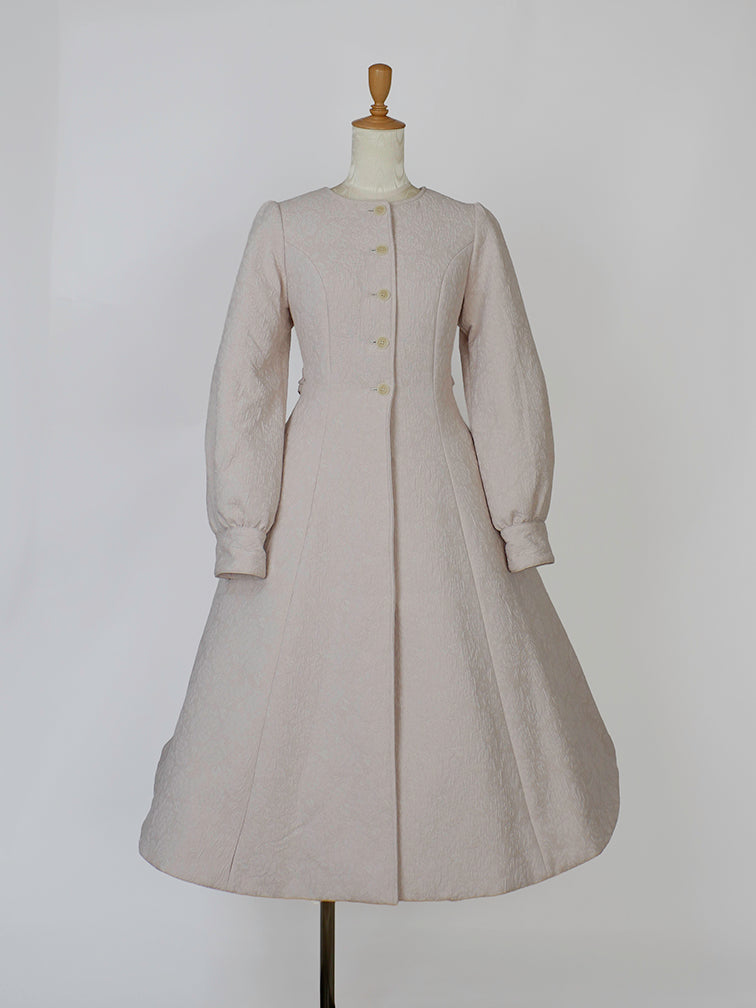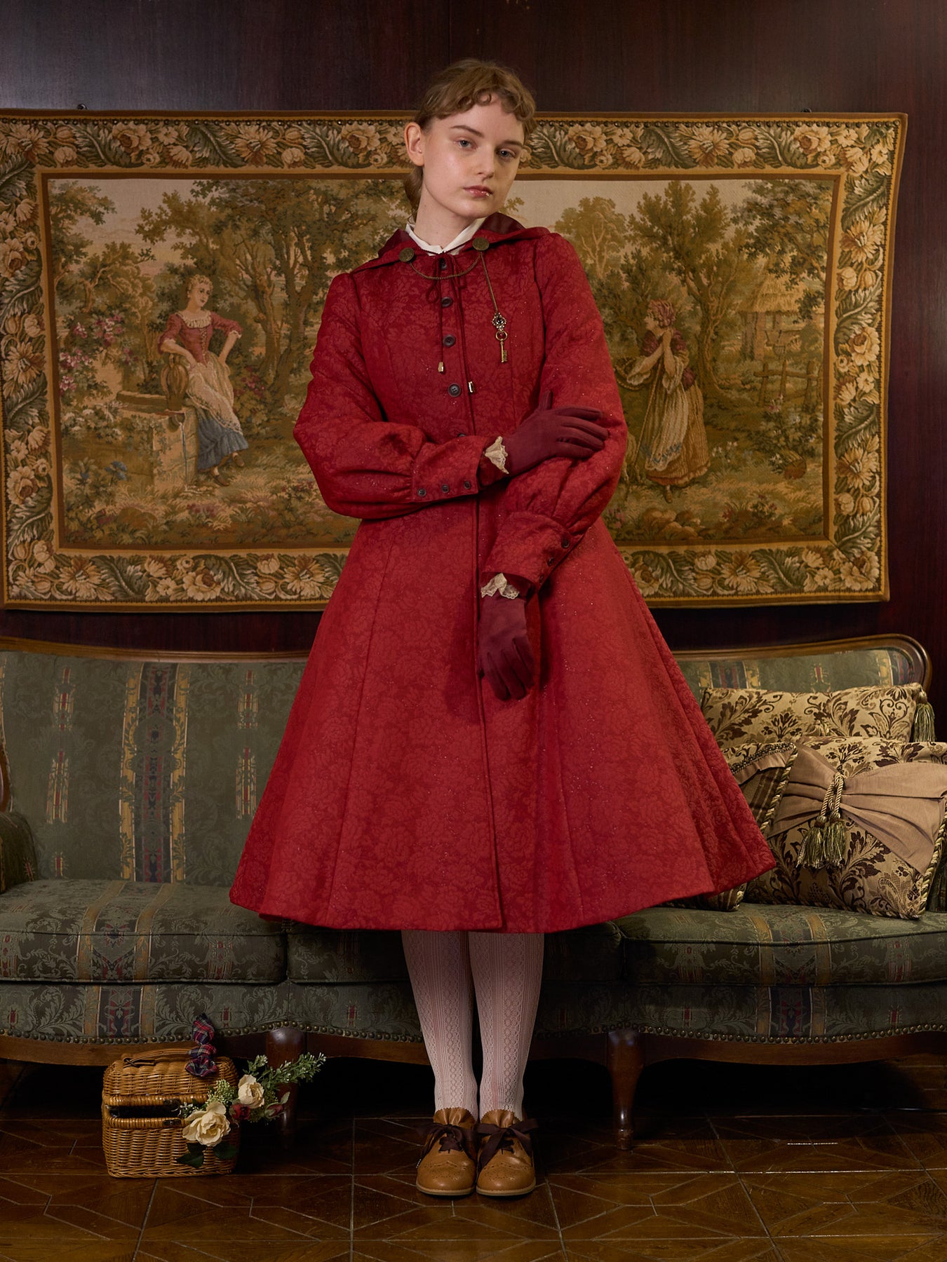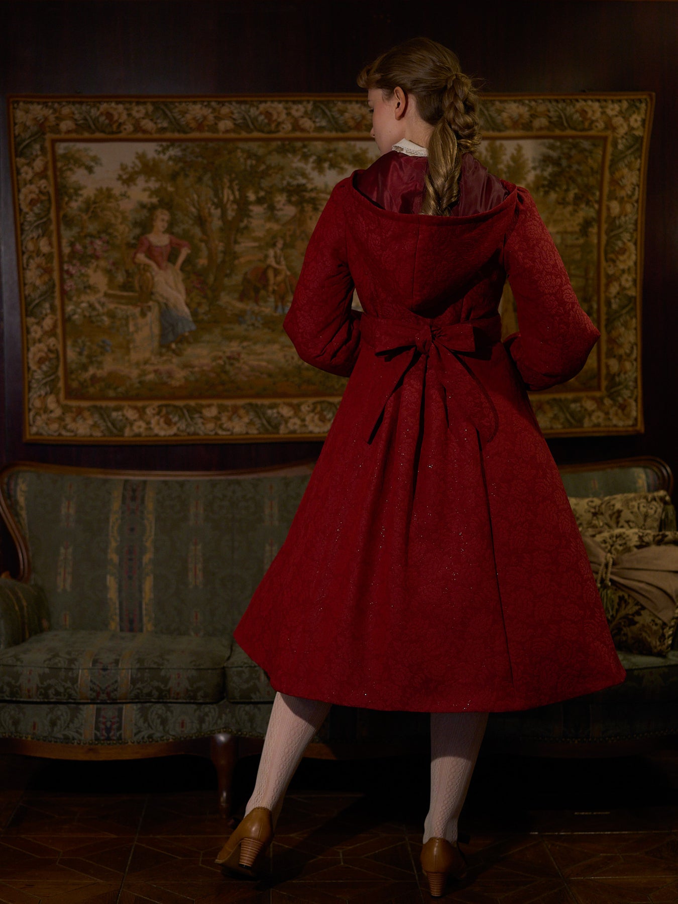 童話の主人公から着想してデザインした取り外し可能な大きなフードは、ファンタジームードを漂わせ、たっぷりとした蹴回しのドレスのようなロングコート。