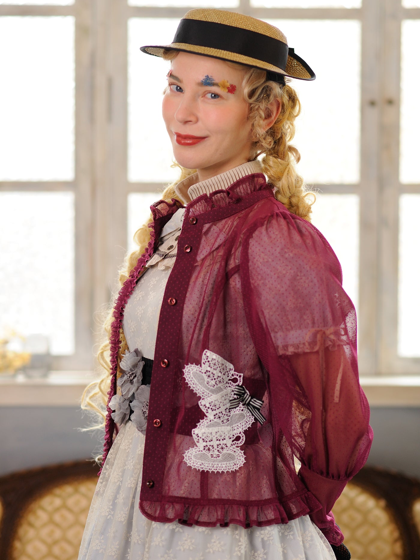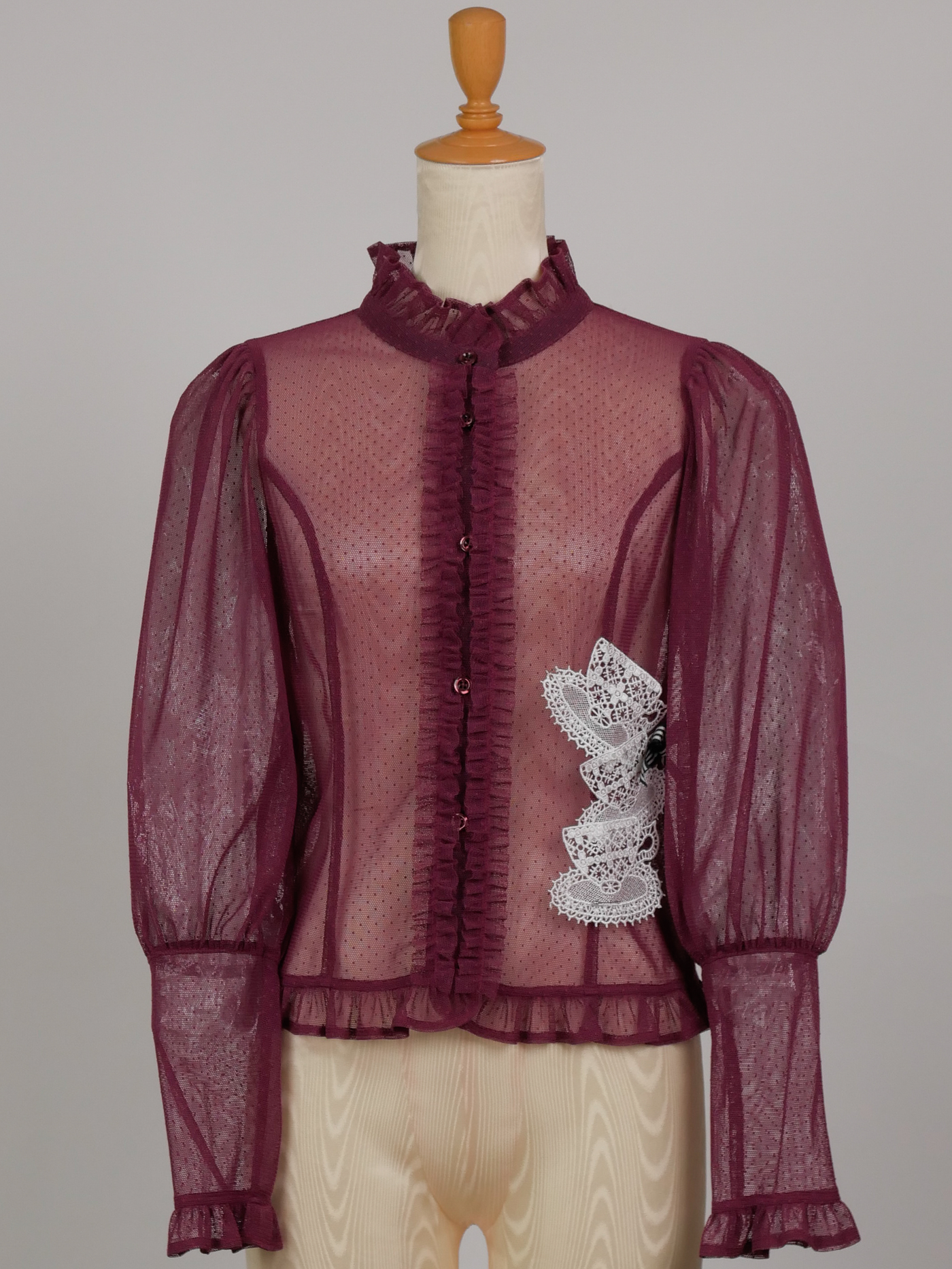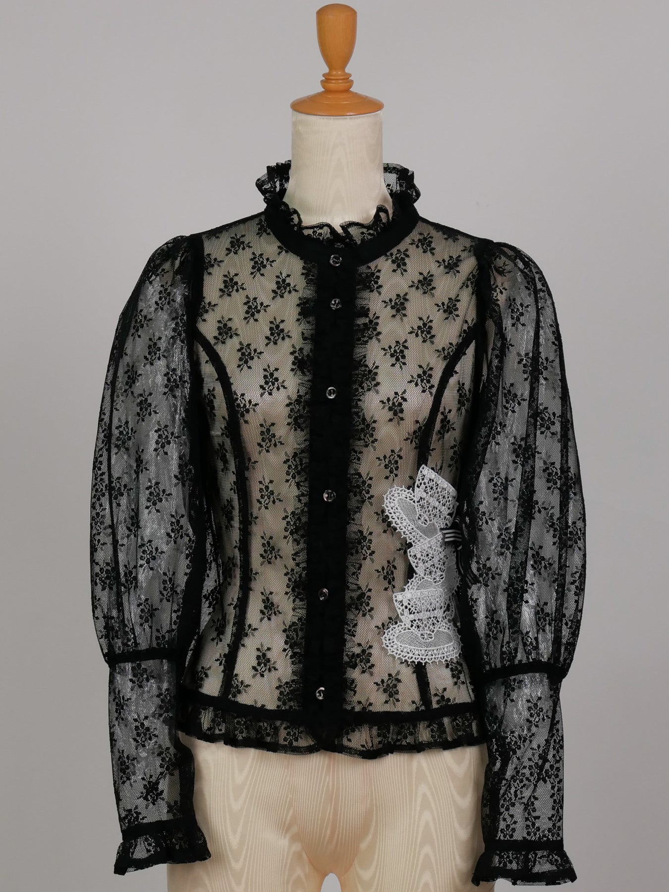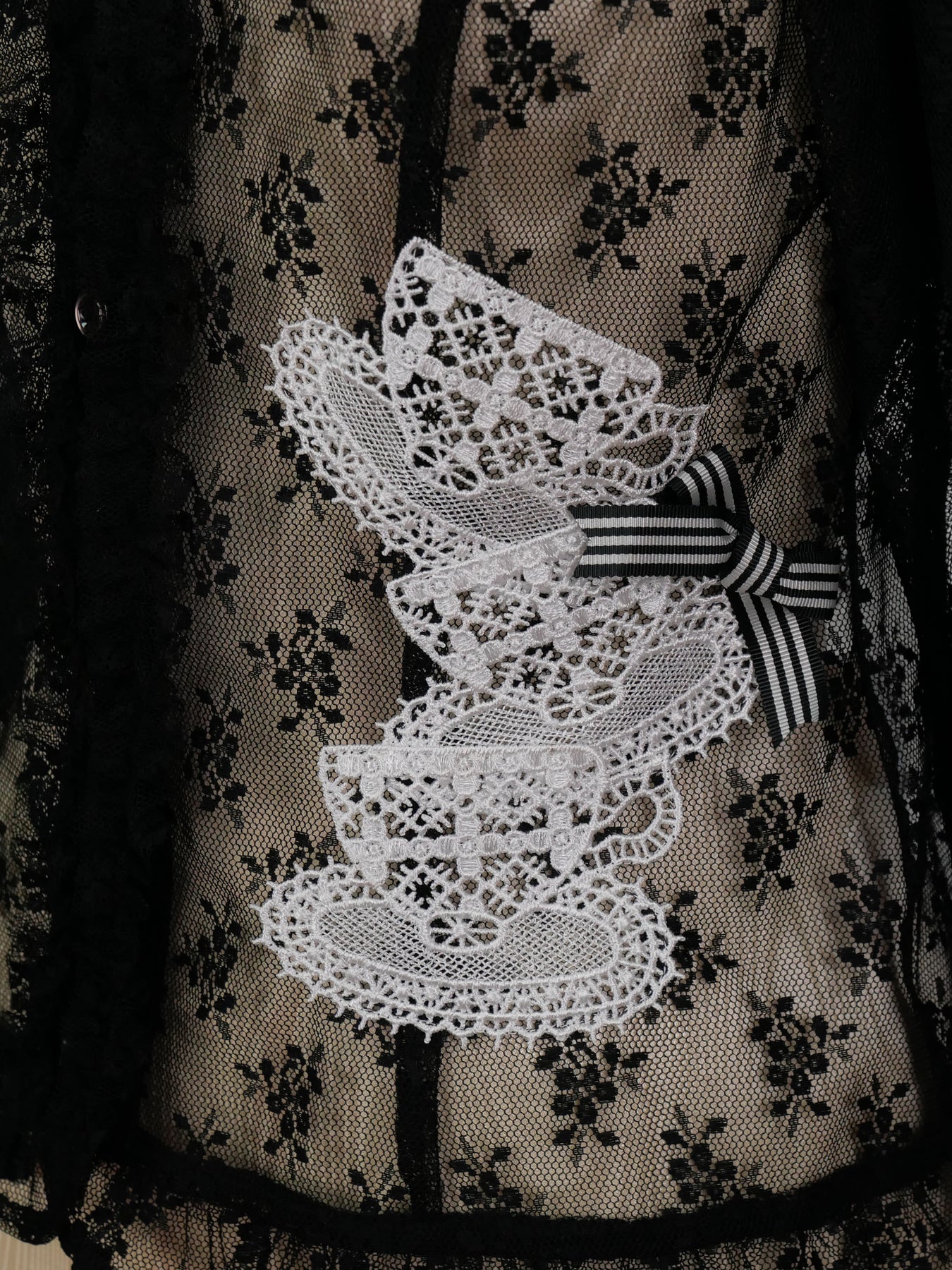 少しシアー感のある花柄ラッセルレースとドットチュール生地でお仕立てしたアメリアレーシーブラウスカーディガンに、特別仕様として大きなティーカップ型のレーヨン素材のモチーフレースを3つ重ねストライプのグログランリボンをポイントにあしらいました。